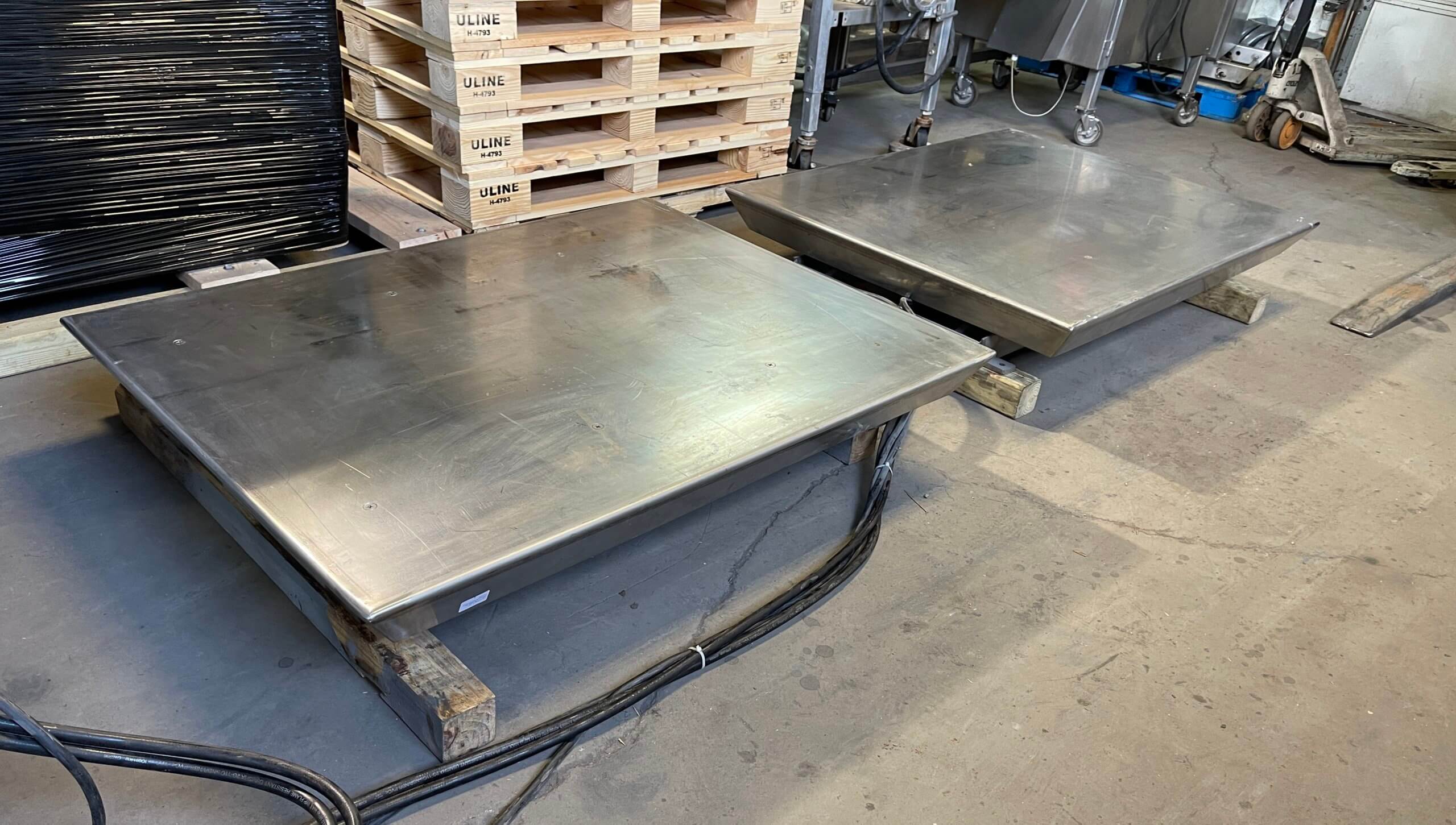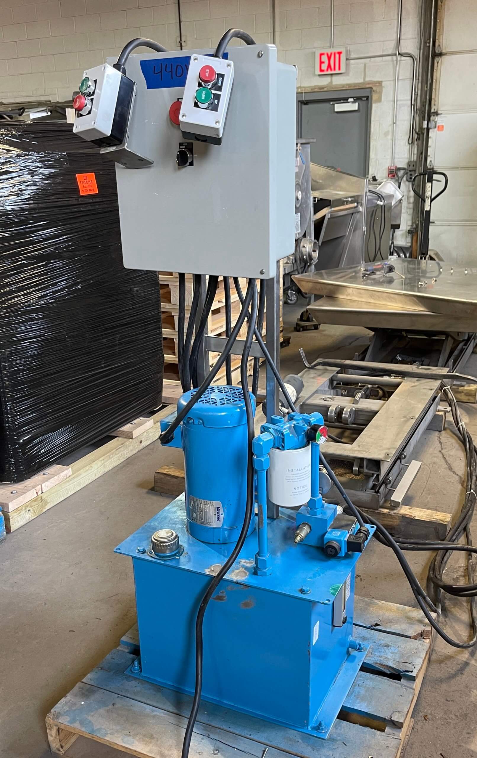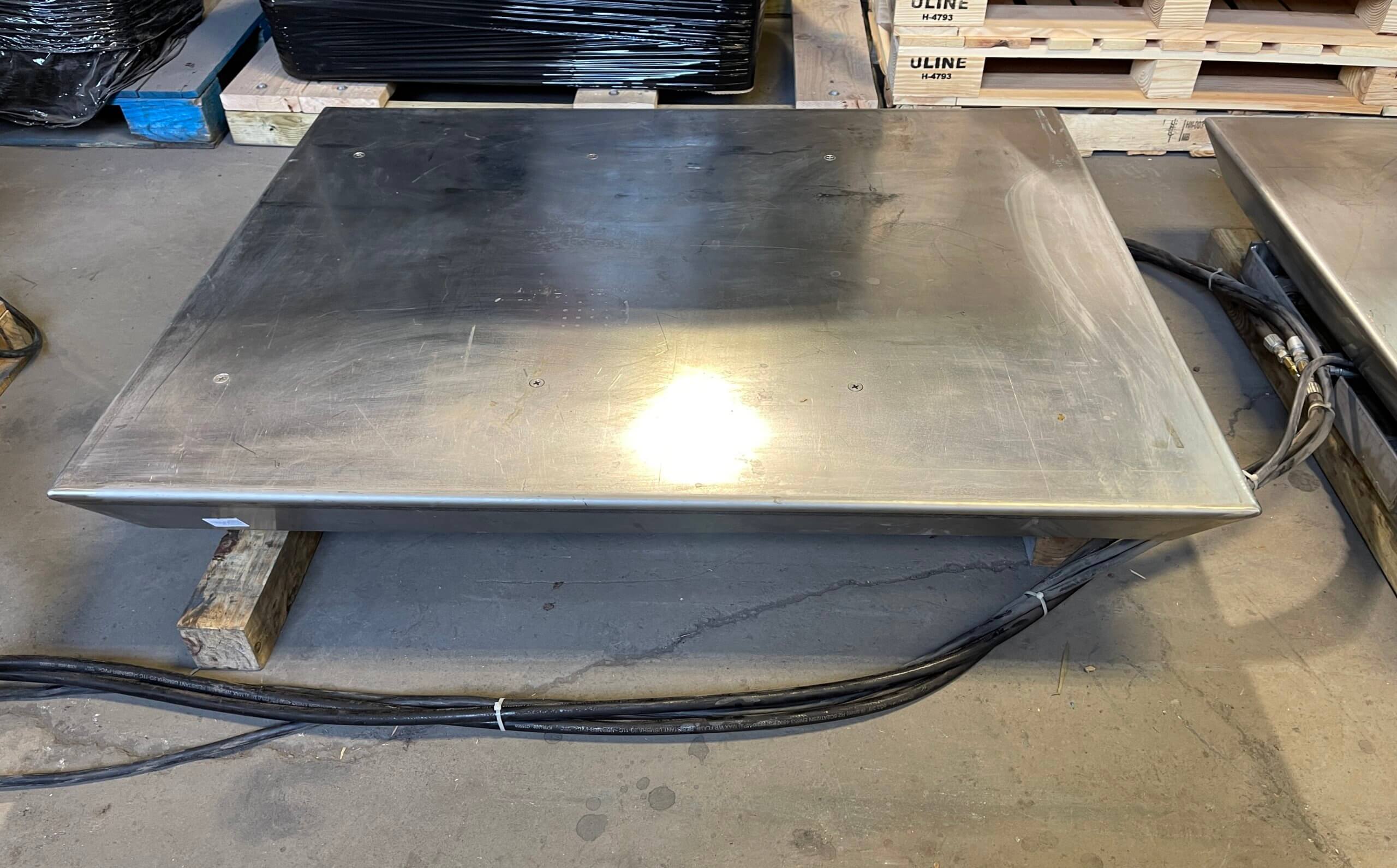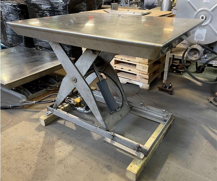 Special Fab & Machinery Dual Lift. Dual Bed Ergonomic pallet Lift, 2,500 lb capacity each, 41″ x 53 platform with a maximum lift height of 40″. The loading platform is 8″ from ground level. Each Lift has equipped with up/down controls and operates independently of each other. Includes Eaton hydraulic package system with Vickers Hydraulic Pump, 25-gallon reservoir, 3hp motor, 220/440V/3PH/60HZ, 1475 RPM. All stainless steel construction.