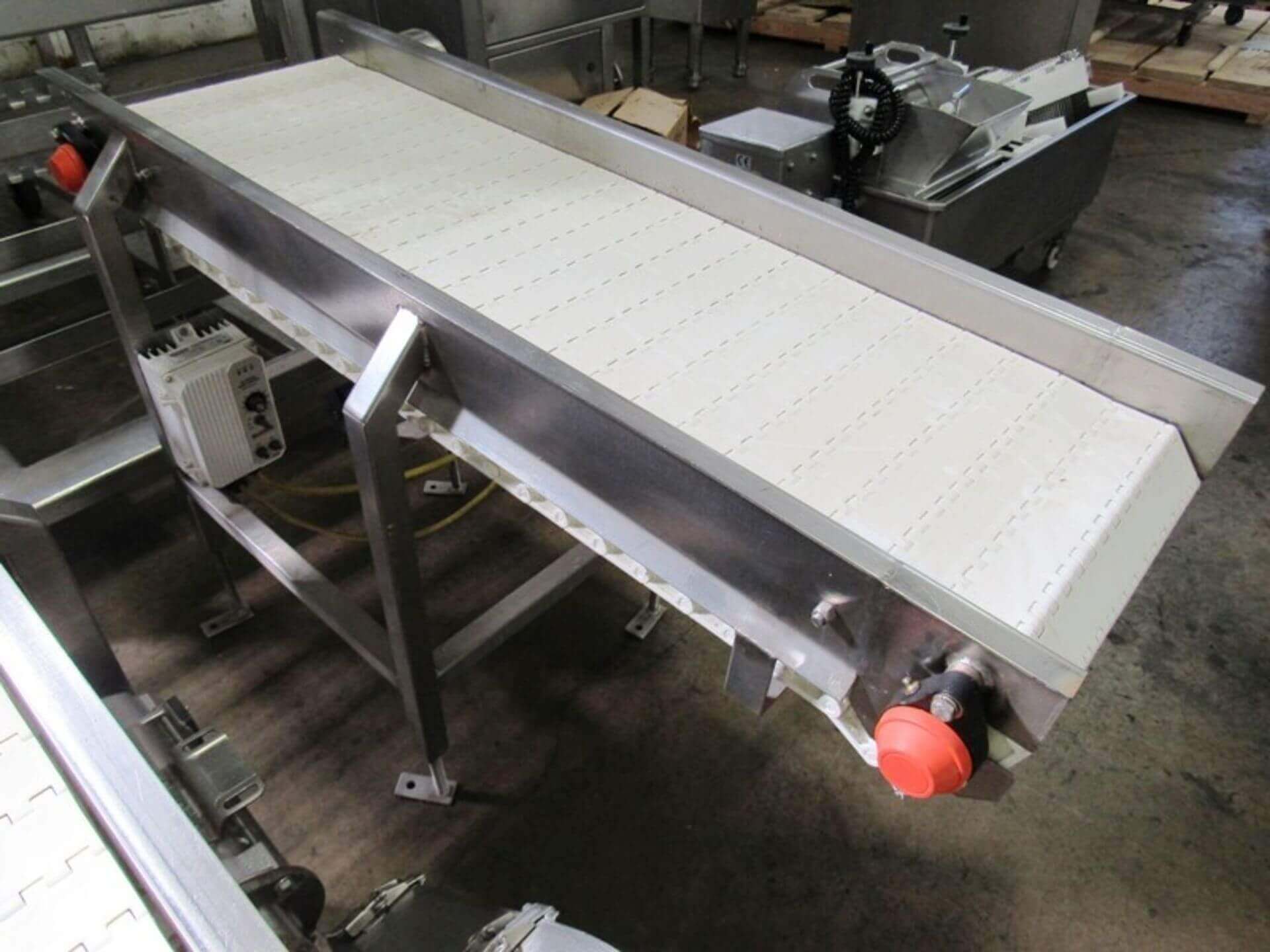CUSTOM STAINLESS Transfer Conveyor. 18″ x 59″ plastic conveyor belt. Sta...