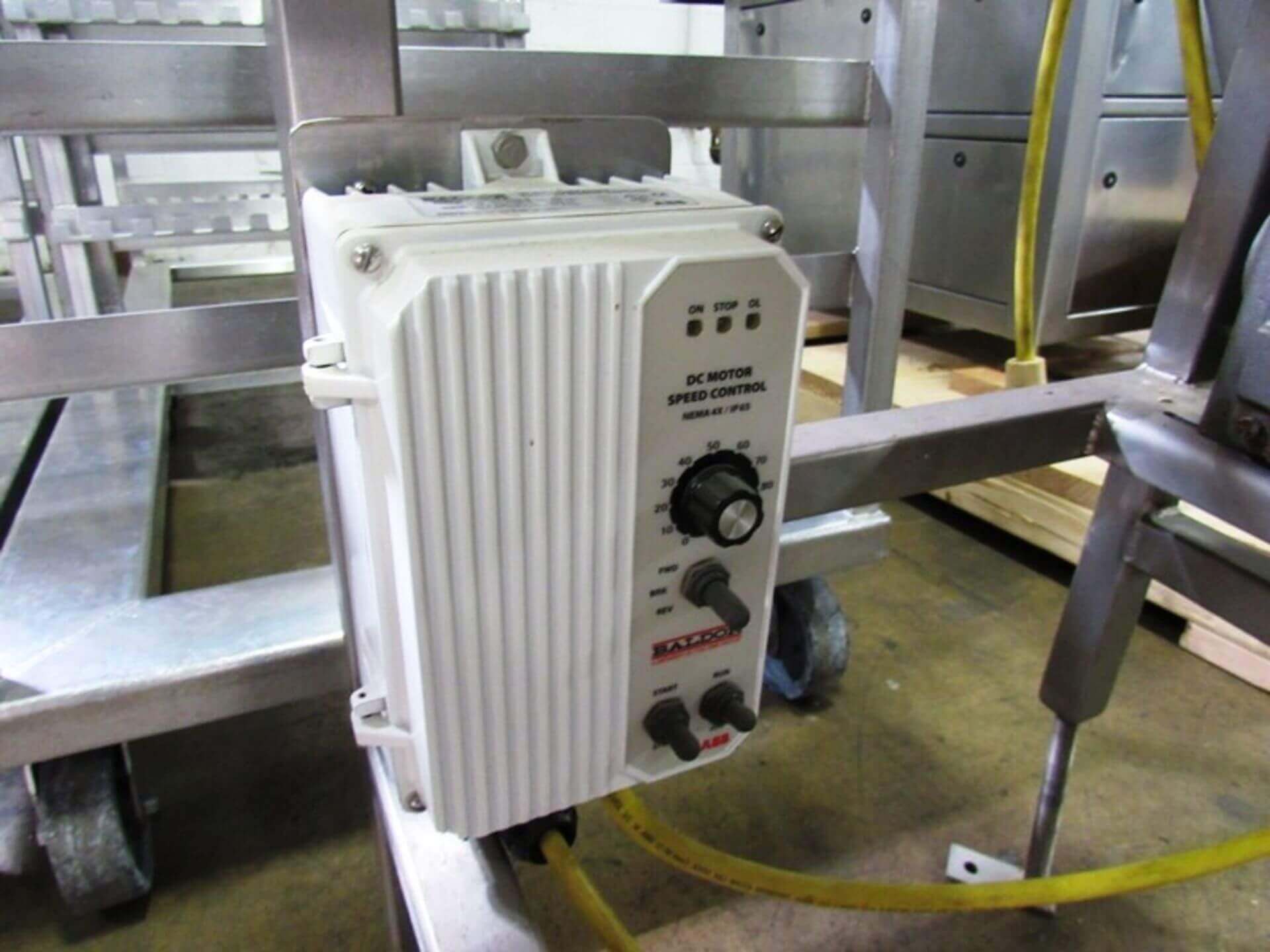STAINLESS STEEL 15″ W X 54″ L Conveyor. Stainless Steel Frame Conveyor, 15″ W X 54″ L plastic belt, 1/3 h.p., 90 volts, stainless steel motor with Baldor DC motor speed control.