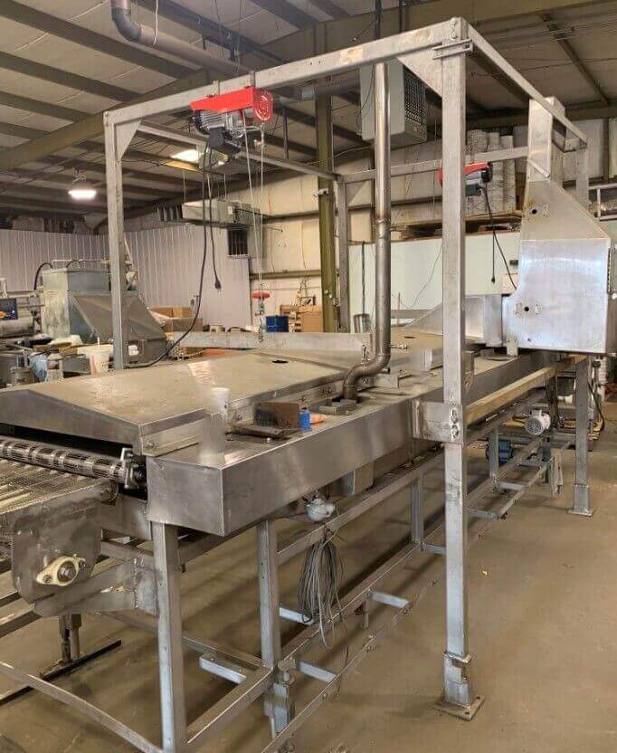Stein 3413 Thermal Fluid Fryer. Equipped with new Hoist and Frame, Gear drives and shaft seals. 34″ W stainless steel Belt x 13′ L in oil. Includes Fulton T-1050A Hot Oil Heater Boiler, National Board 80234, natural gas-fired, 1,052,000 BTU/hour. Rated working pressure 150 psi. Equipped with 15 hp circulation pump, 3500 rpm, 230/460V/3ph/60HZ. Rated at 650 F, 350 psi. Control panel, Honeywell burner control, 24″ x 6′ long oil holding tank and Heater with pump.