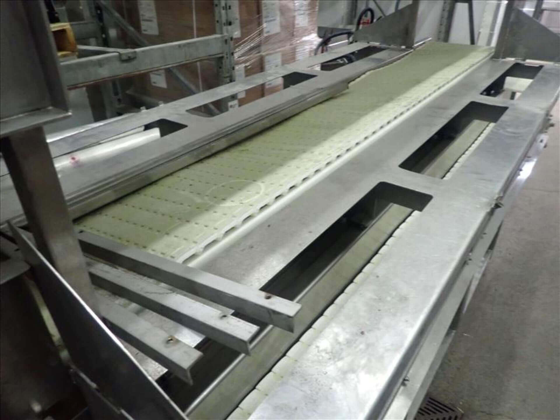 Kleenline Pack Off Conveyor. Twin conveyors: Top 12″ wide plastic conveyor bel...