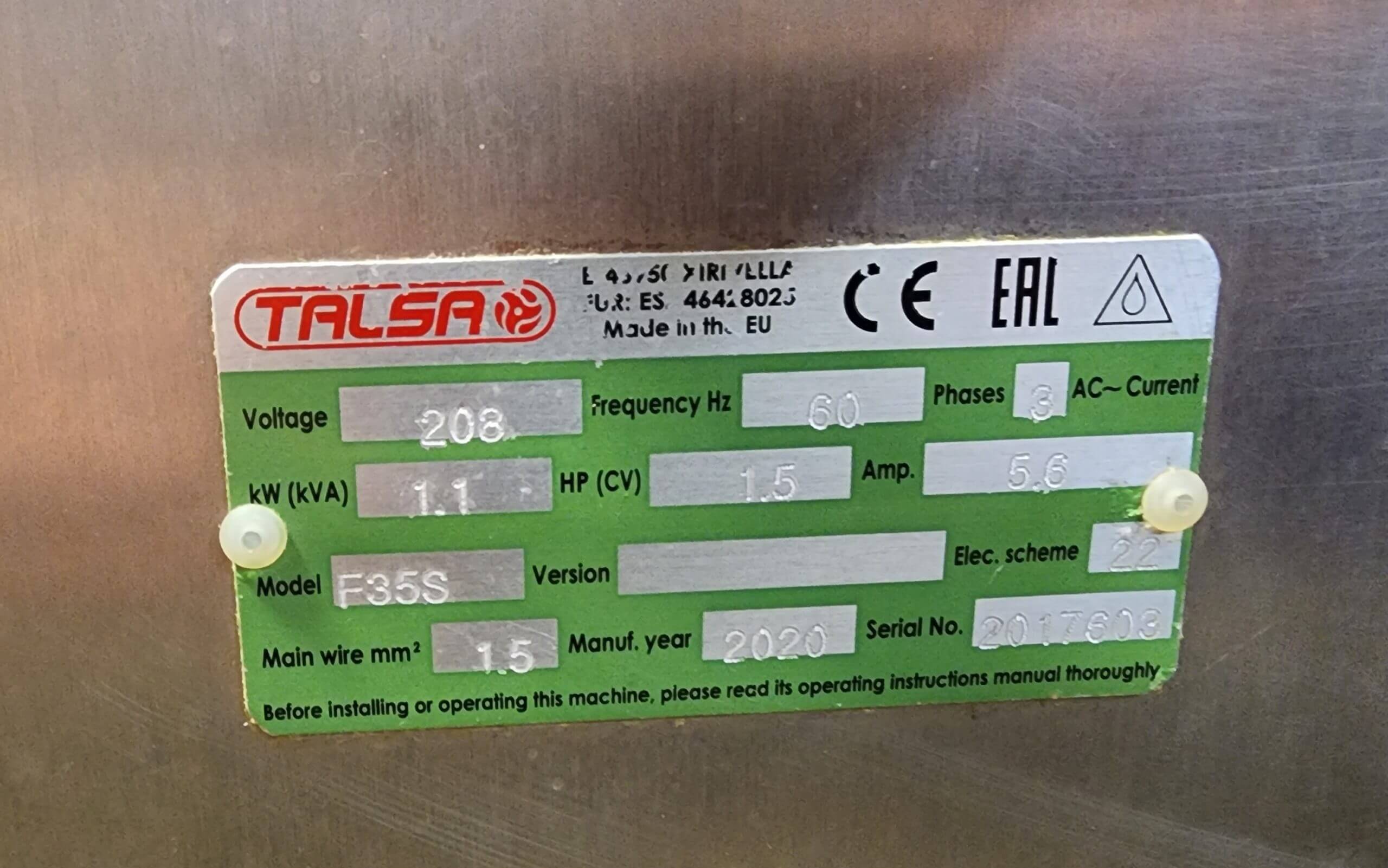 TALSA F35S Hydraulic Piston Stuffer. Stainless steel construction, 65 Lbs. hopper capacity, built-in Hydraulic pump, variable fill pressure, automatic start/stop by knee lever and pressure gauge. Includes 3 Stuffing horns and piston removal tool. 1.5 HP motor, 208V/3PH/60HZ, 5.6 Amps.