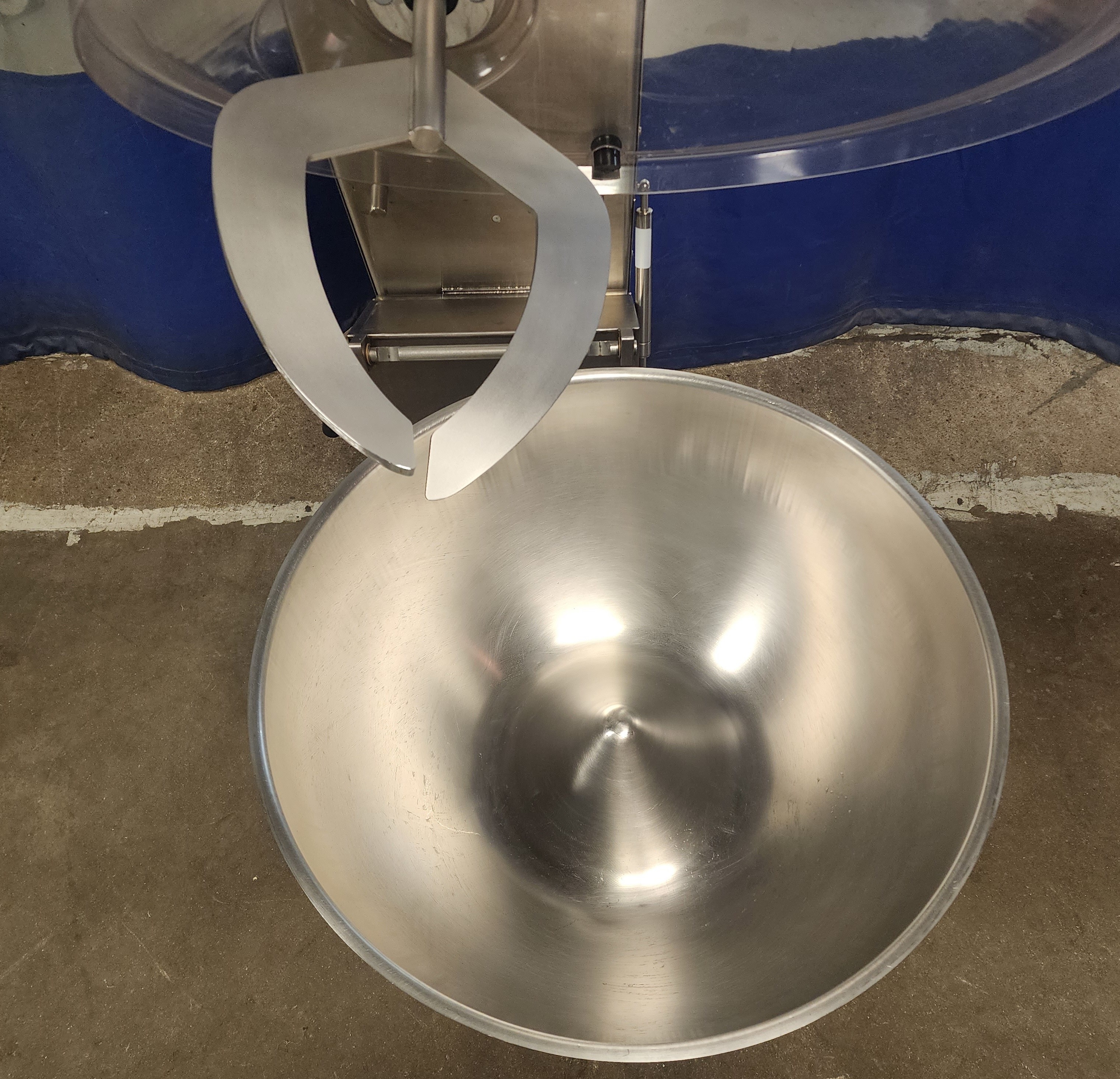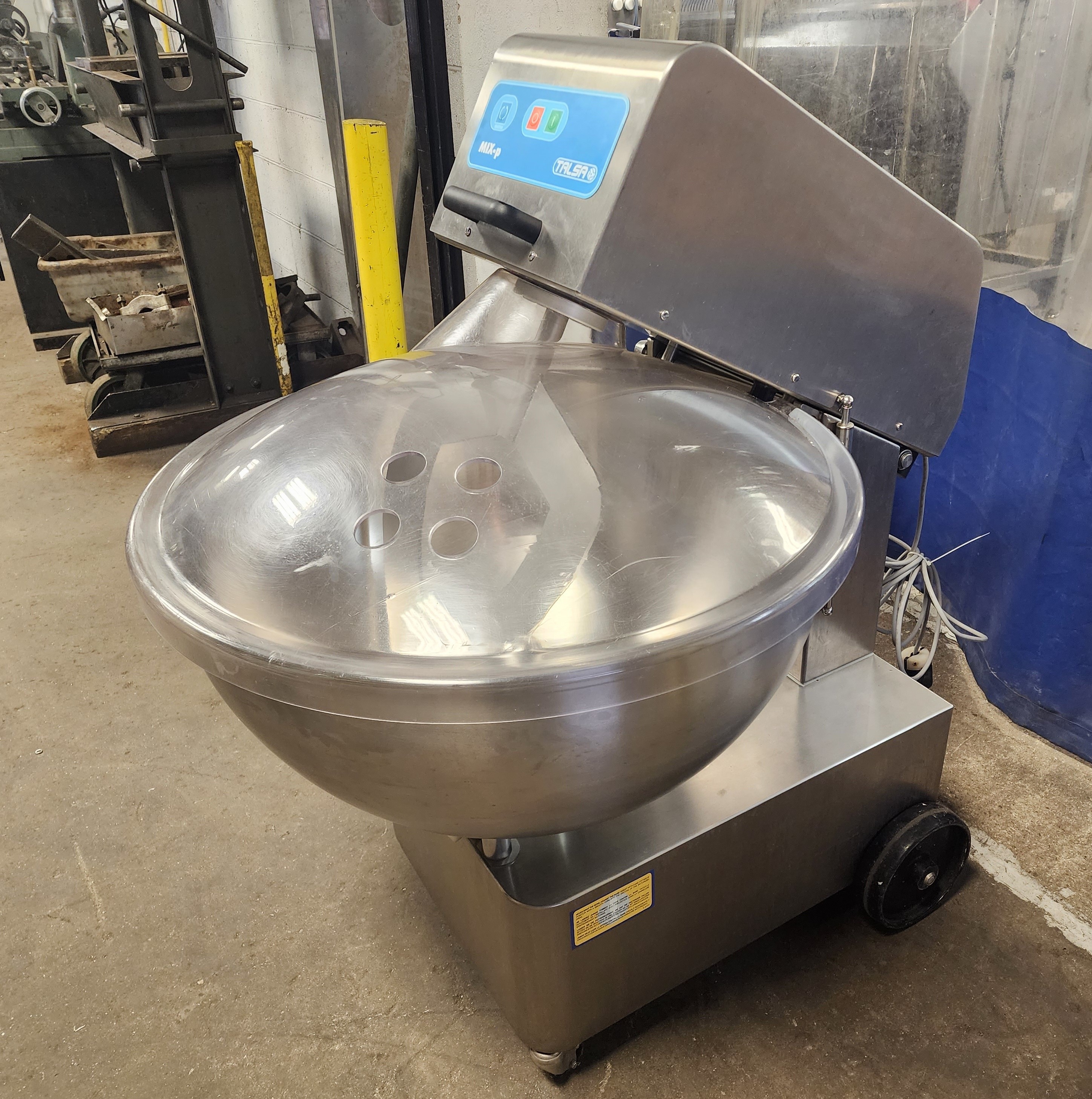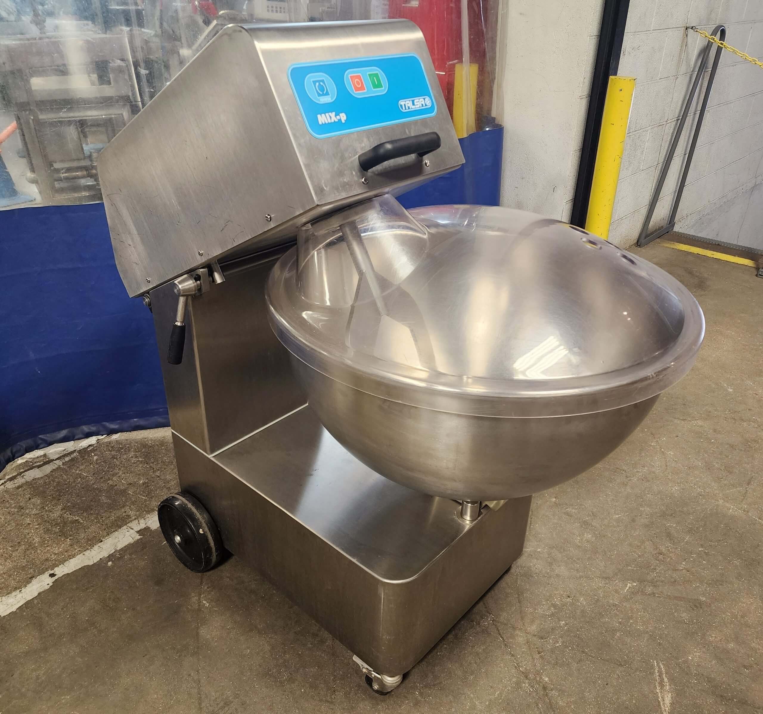 Talsa MIX 915 Mixer. Features two separate motors for mixing paddles and rotating the mixing bowl, stainless steel construction, one arm mixes product from top to bottom while another arm simultaneously mixes bottom to top, Pneumatically assisted opening head, Auto-stop safety feature when mixing head is raised, Tilting head for easy cleaning, Transparent cover with holes for adding seasoning and other mixtures. Push button controls for starting, stopping, and forward or reverse mixing actions.