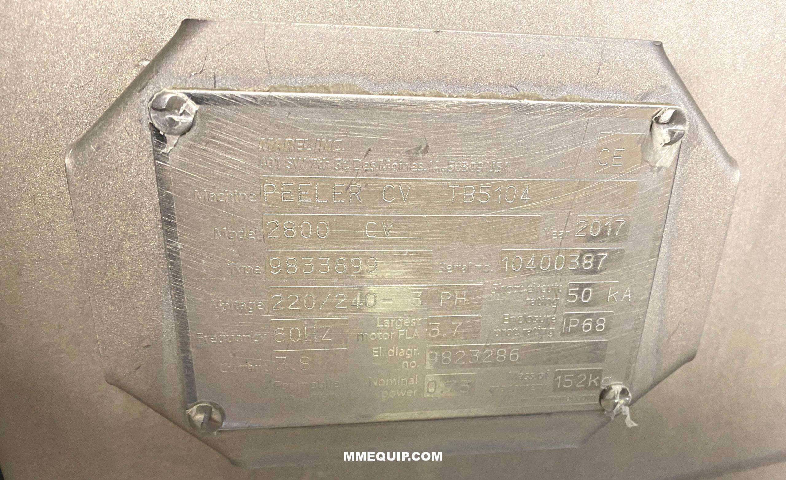 Townsend 2800 Sausage Peeler, stainless steel construction. Can be configured to remove cellulose casings between 13mm to 41mm diameter. 25 psi steam pressure, 100 psi air pressure, 220V/3PH/60HZ, 3.7 Amps. Collection vacuum system available at additional cost.