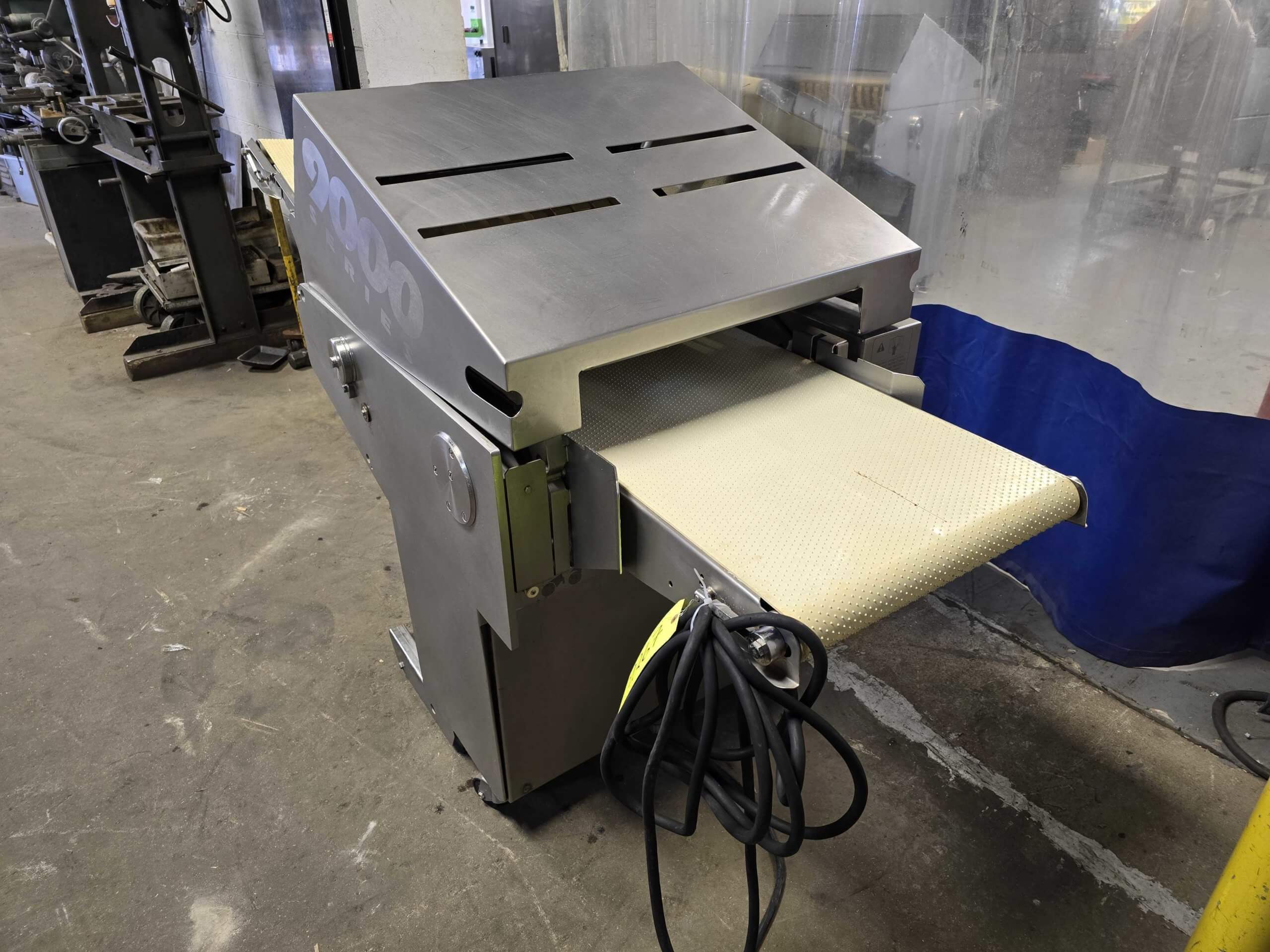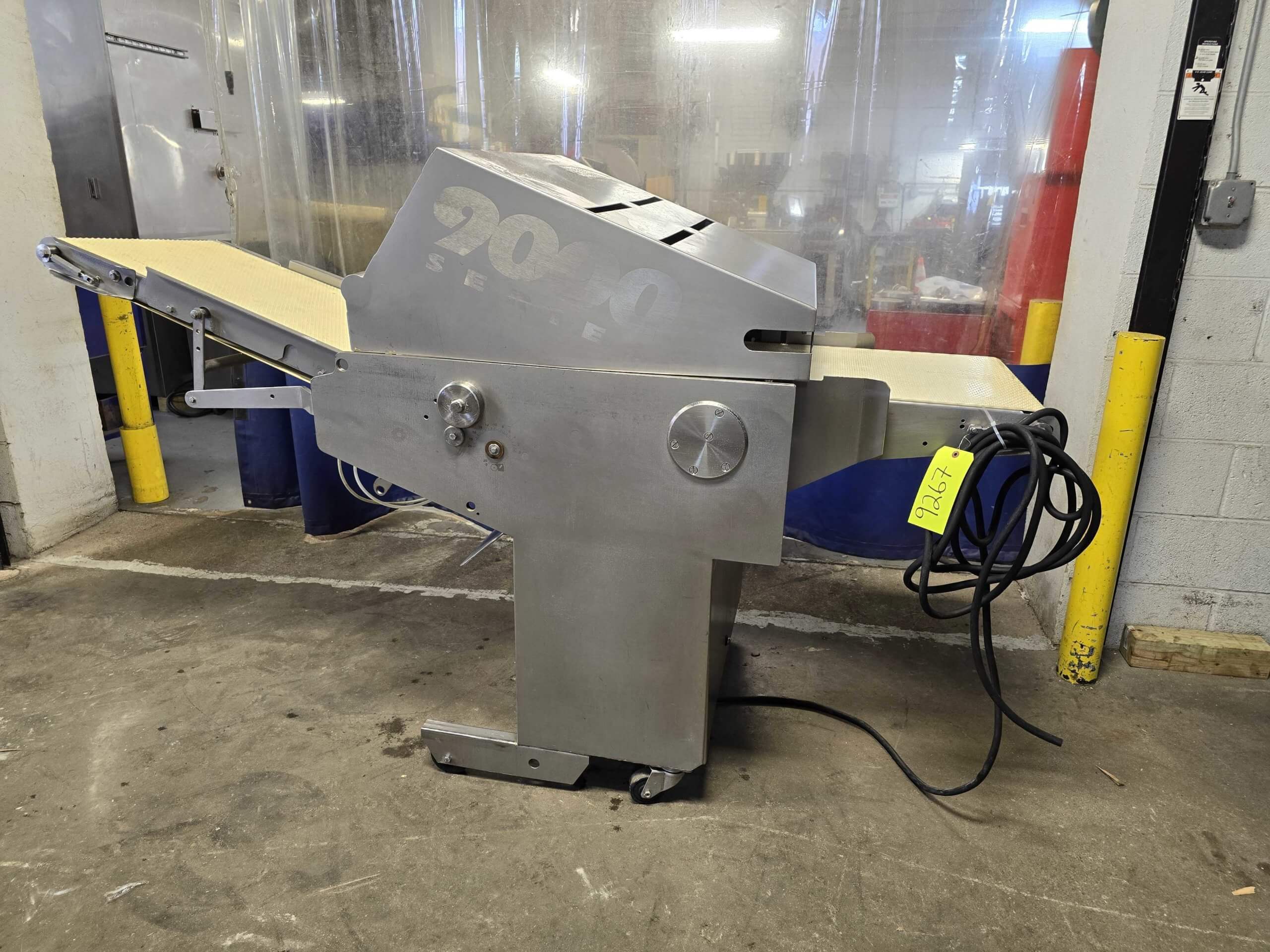 Townsend 9000 Automatic Skinner. Removes skin from pork bellies and fatback, 1,600 to 1,800 pieces/hr. 20″ wide infeed and exit conveyor belts. Stainless steel construction. 3 hp drive motor, 220V/3PH/60Hz, 8 Amps.