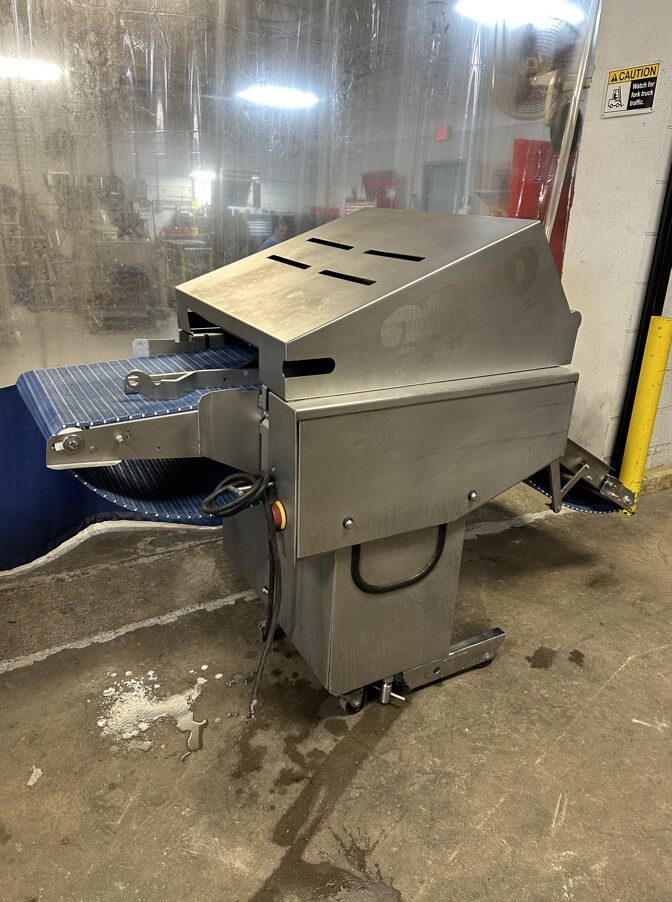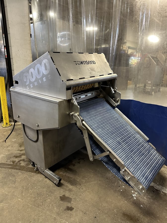 Townsend 9000 Automatic Skinner. Removes skin from pork bellies and fatback, 1,600 to 1,800 pieces/hr. 20″ wide infeed and exit conveyor belts. Stainless steel construction. 3 hp drive motor, 220V/3PH/60Hz, 8 Amps.