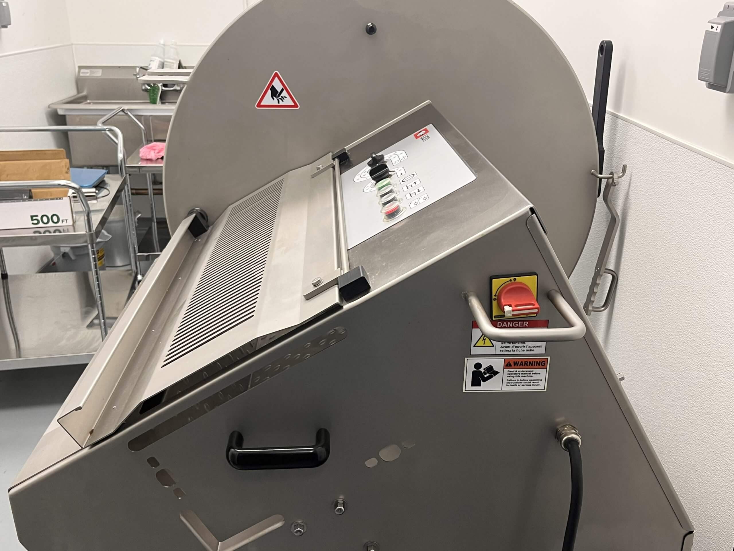 TREIF Zebra CE Slicer. Setup for 1/8″ slice thickness, minimum product temp. 2...
