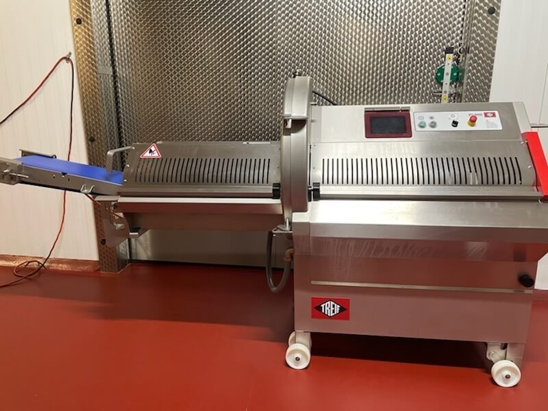 TREIF Zebra CE Slicer. Setup for 1/8″ slice thickness, minimum product temp. 2...
