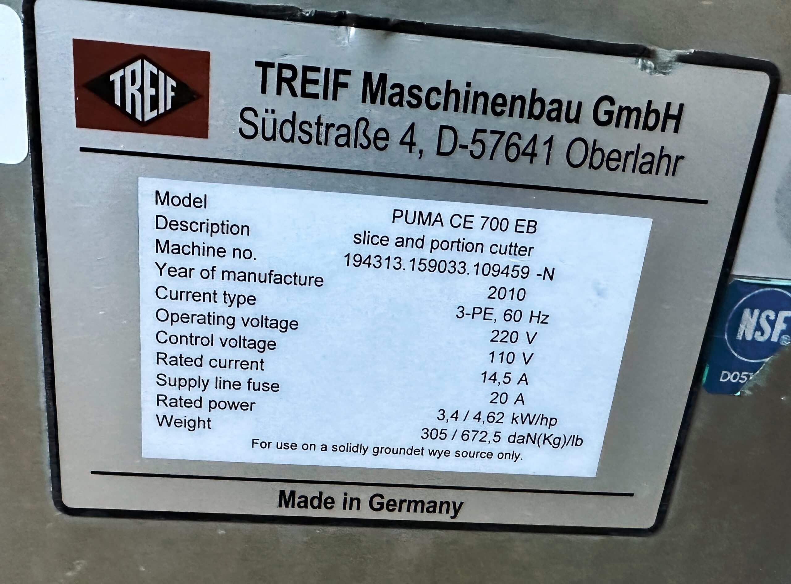 Treif Puma 700 EB Portion Slicer. Slices up to 400 portions/minute with a double blade. Slices fresh, frozen and bone-in product, 8.5″ x 9.5″ product trough, 3.4 Kw motor, 220V/3PH/60HZ, 16 Amps.