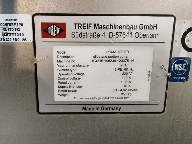 Treif Puma 700 EB Portion Slicer. Slices up to 400 portions/minute with a double blade. Slices fresh, frozen and bone in product, 8.5″ x 9.5″ product trough, 3.4 Kw motor, 220V/3PH/60HZ, 16 Amps.