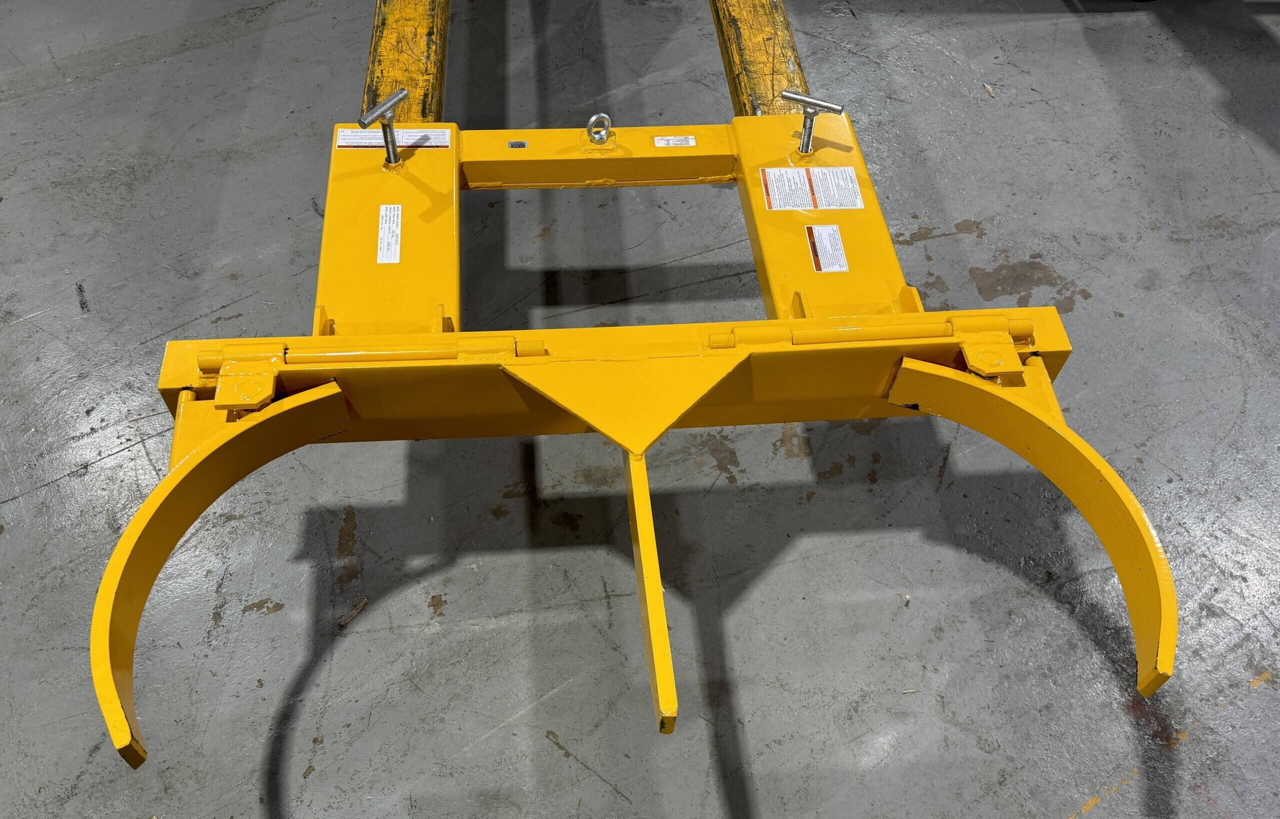 U-LINE STEEL DRUM GRABBER. Lifts two drums at once and deposit 55-gallon steel drums with your forklift, 5,000 Lbs. capacity, slides onto fork and tightens without tools, jaws automatically close and lock onto drum. All-welded steel construction. Never used.