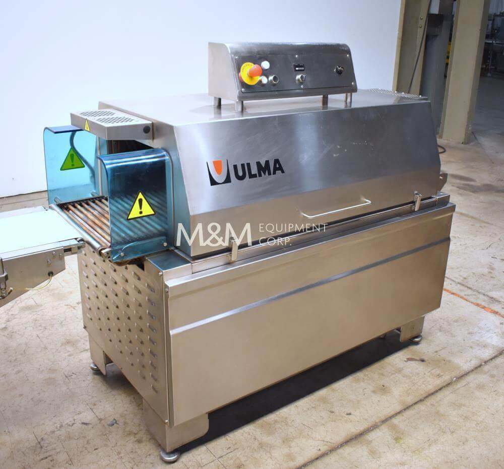 Automatic flow-wrapping machine designed to pack fresh food products with shrink barrier film (BDF). Stainless steel construction, auto feed feature, print registration, PBI online gas analyzer, MAP capable, currently set up for 4 D Tray for a product dimension of 230 mm (9.05 in) x 180 mm (7.08 In) x 45 mm (1.77 in), includes Ulma Model T-150 shrink tunnel, and in-feed conveyor system, 220V/3PH/60HZ.