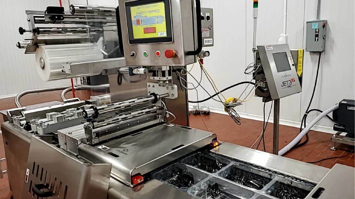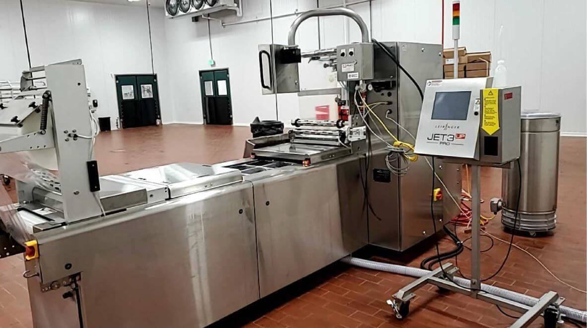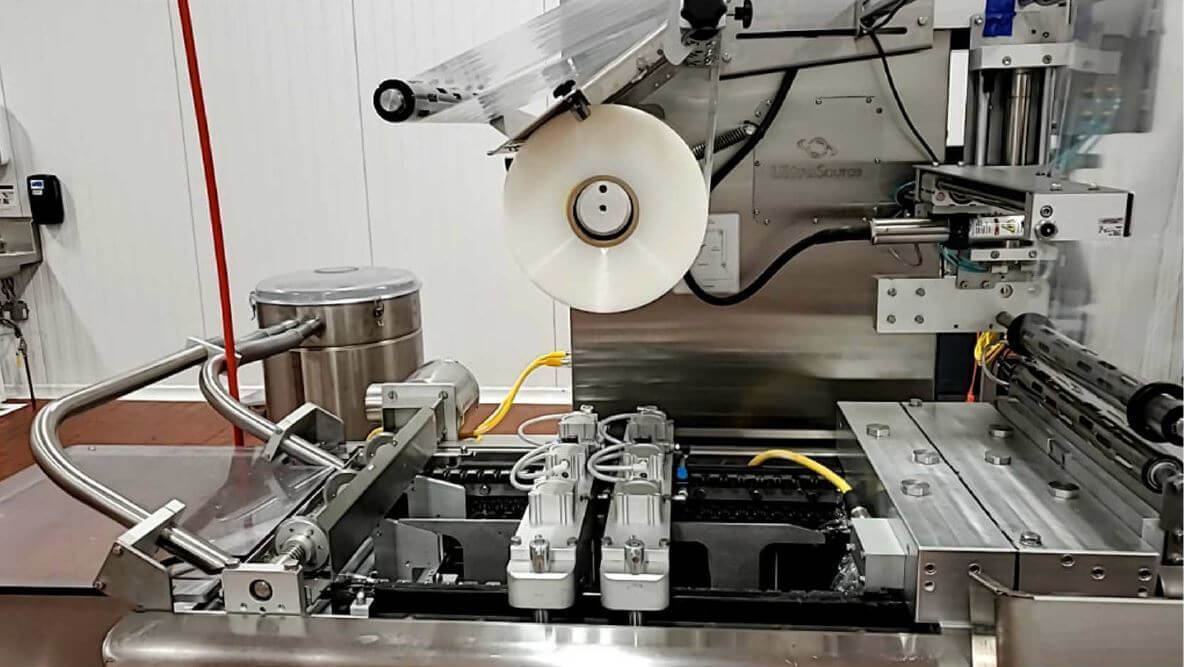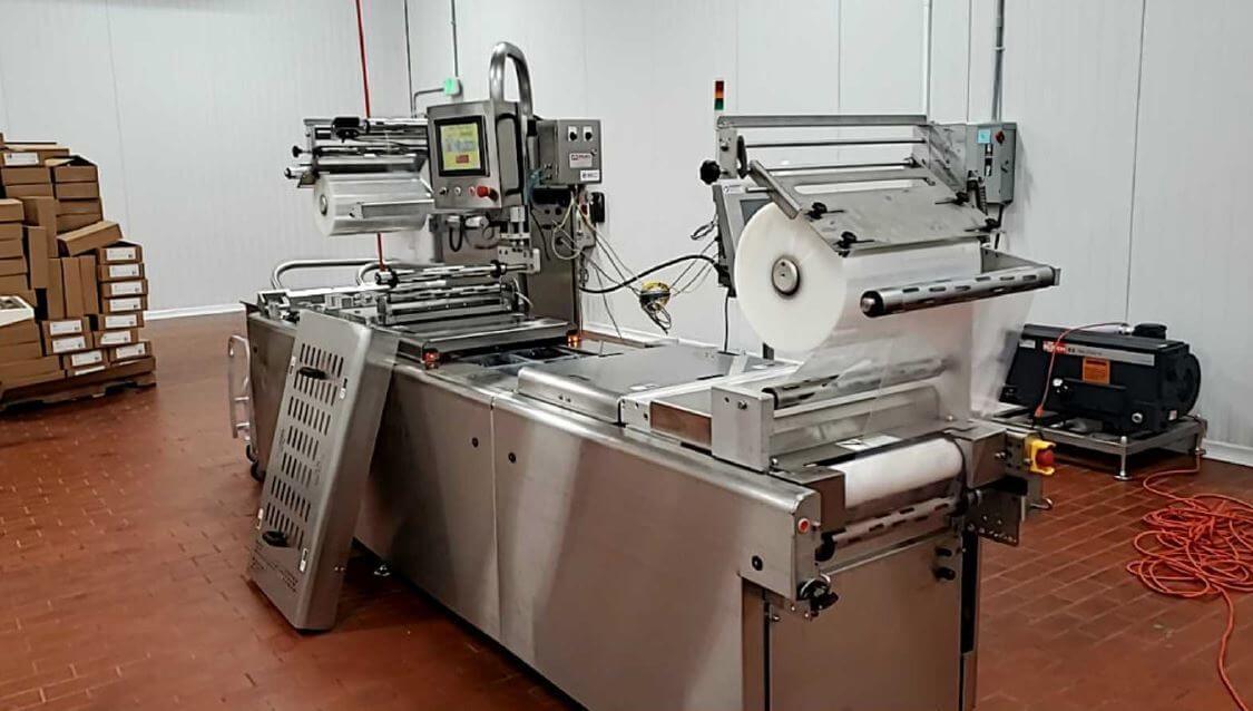 The Ultrasource Bison Rollstock Machine is the perfect choice for high-quality, efficient packing. This improved model features a 10″ touchscreen and a guillotine knife for a crisp 1/2 index cut. Superior sealing and freshness are ensured by the Busch 7.5 HP vacuum pump and pin gas flush system. This machine provides outstanding precision and cleanliness with a 3 track 2 row divider set with rotary cutting and vacuum canister trim removal. Photo registration, an EASY peel header, and a roller discharge assure a smooth and trouble-free operation. Furthermore, the transverse ink jet system enables simple labeling and personalization. This machine, which will be installed in October 2020, is up to date and ready to improve your packing process.
