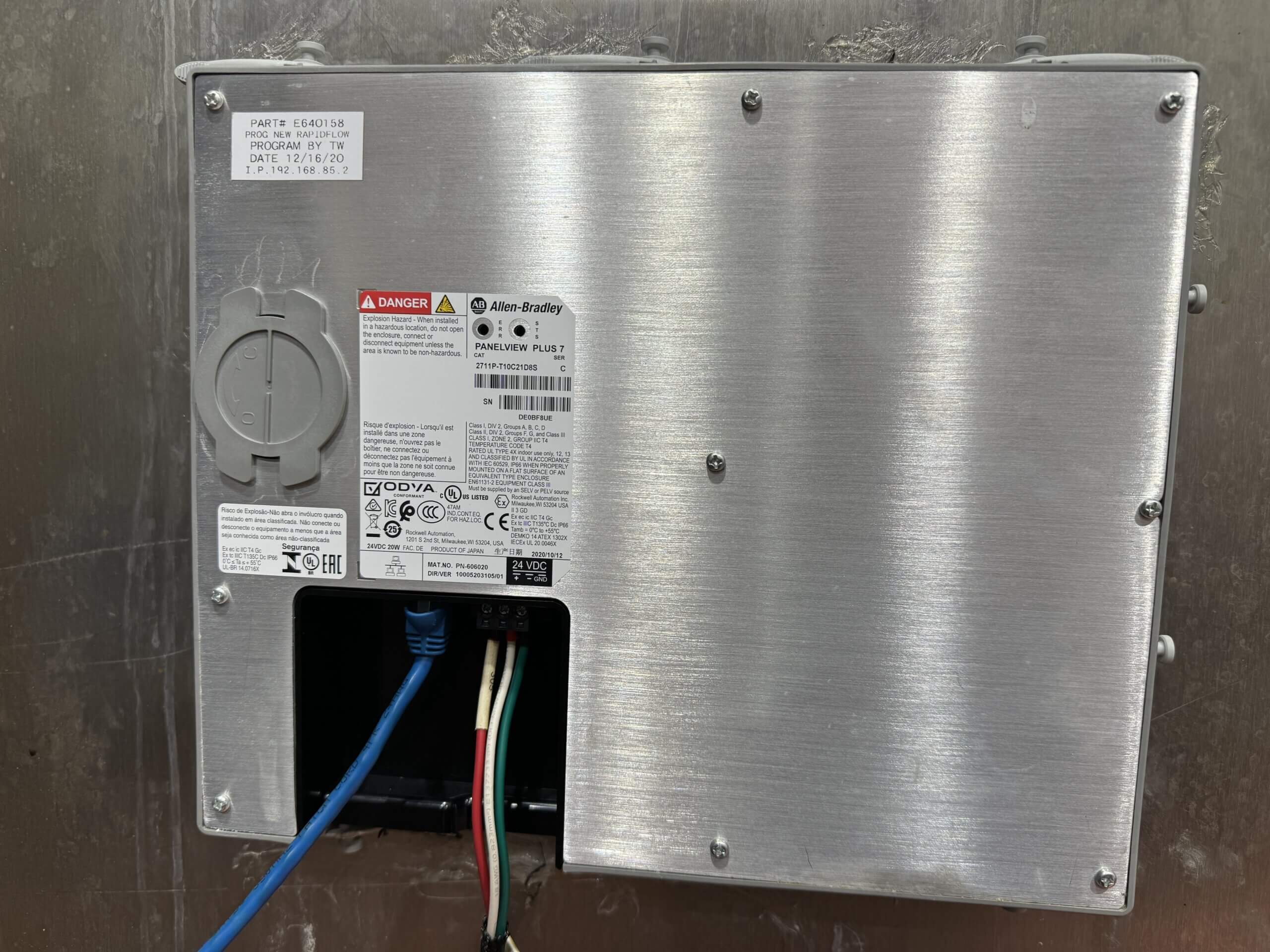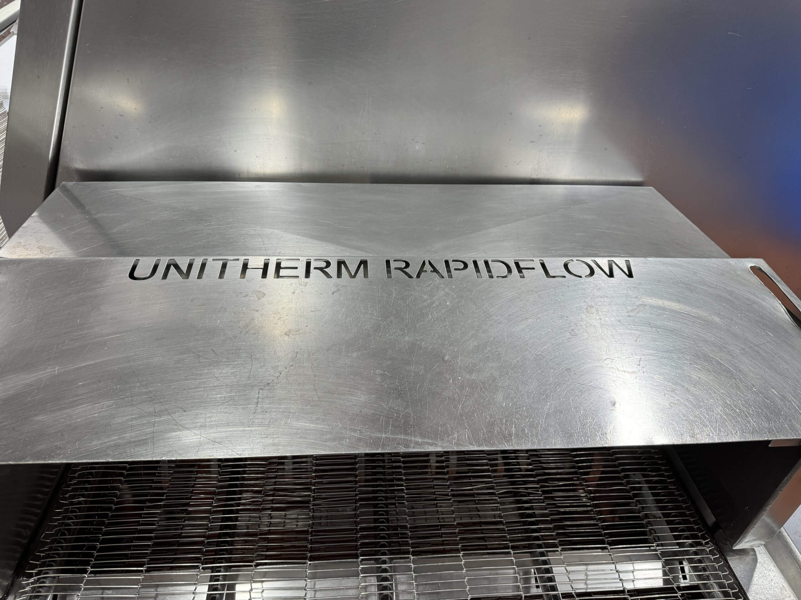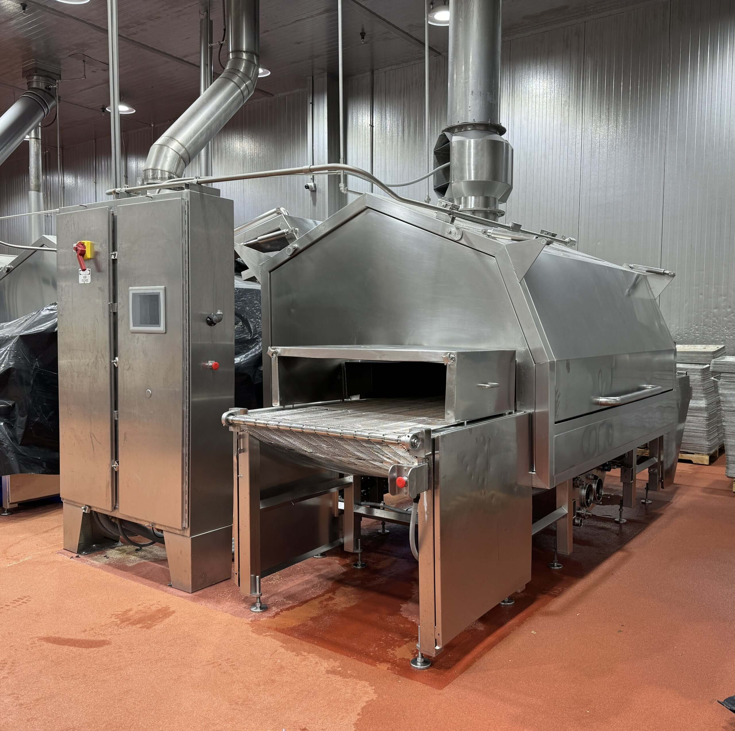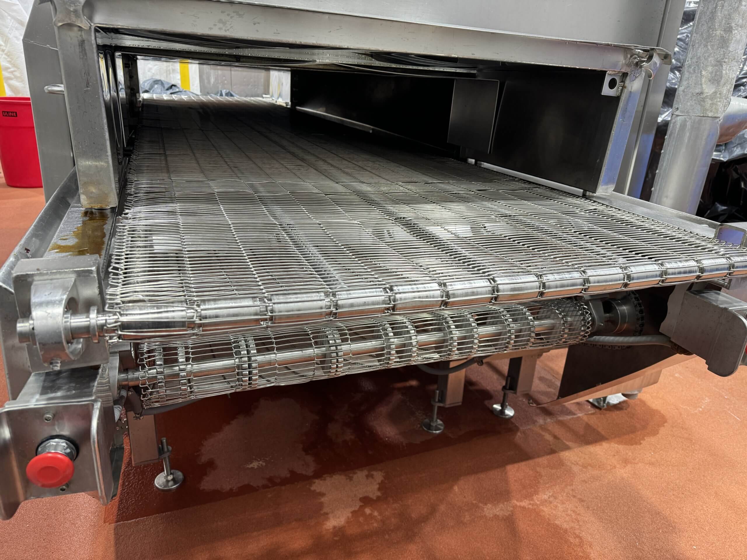Unitherm Rapidflow Oven. Single Zone Stainless Steel Linear Oven, 187″ L x 39.4″ wide stainless steel conveyor belt. 8.5″ max product height. Multiple independently controlled zones with an adjustable airflow pattern. Uniform cooking or browning of any product. The Rapidflow is highly versatile with a temperature range up to 650°F (350°C). Includes Control panel. 480V/3PH/60HZ, 600 Amps service.