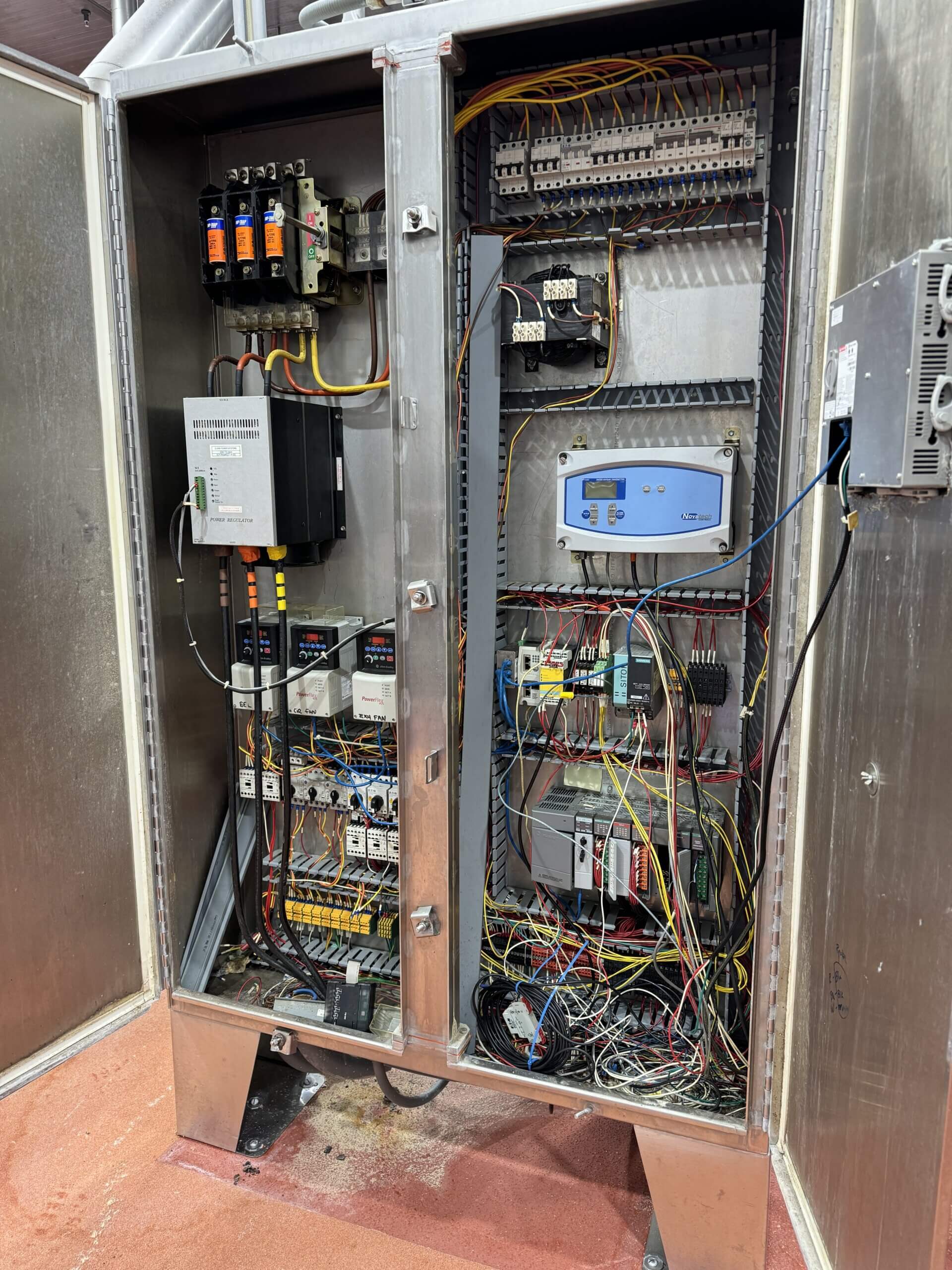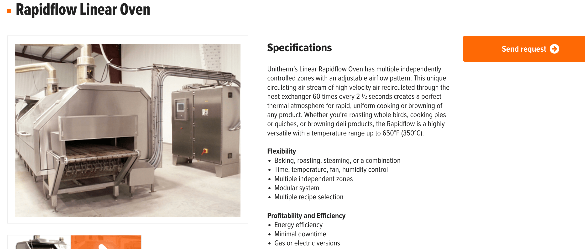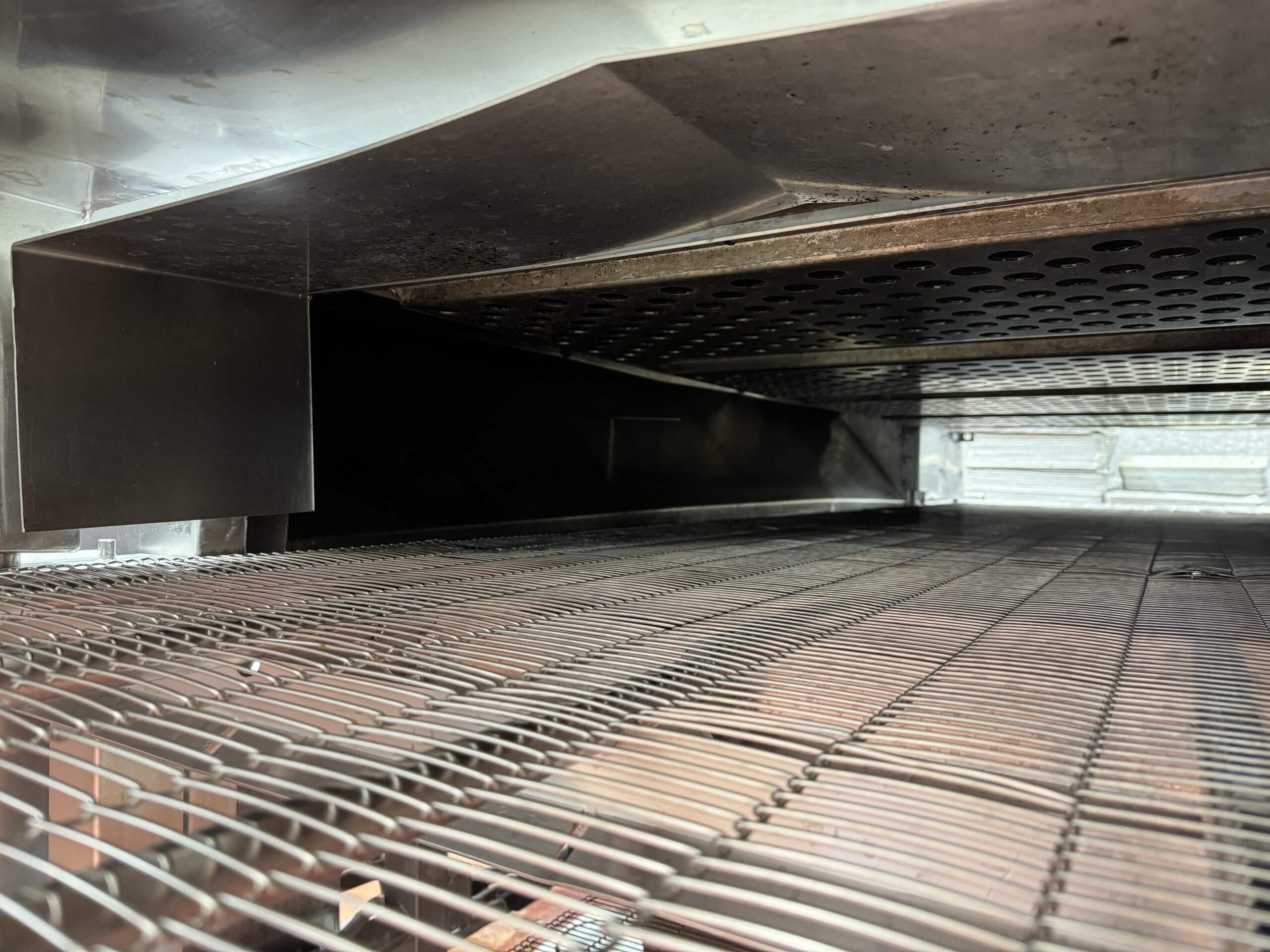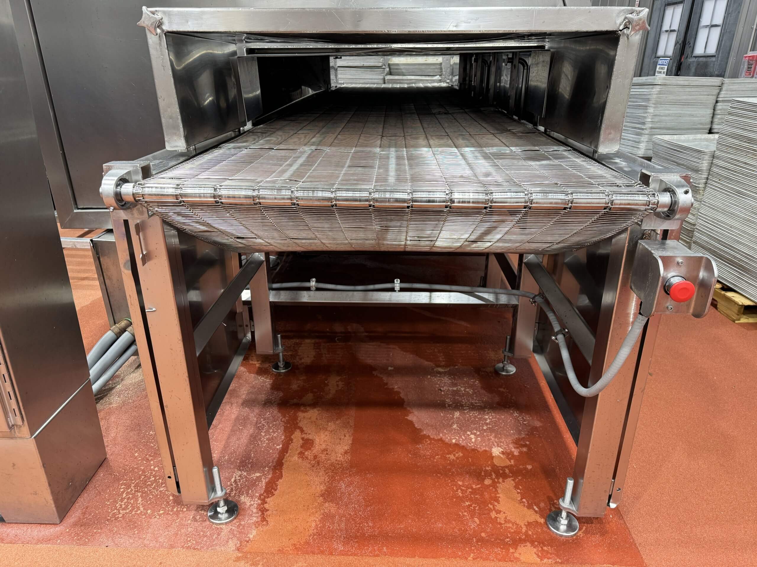Unitherm Rapidflow Oven. Single Zone Stainless Steel Linear Oven, 187″ L x 39.4″ wide stainless steel conveyor belt. 8.5″ max product height. Multiple independently controlled zones with an adjustable airflow pattern. Uniform cooking or browning of any product. The Rapidflow is highly versatile with a temperature range up to 650°F (350°C). Includes Control panel. 480V/3PH/60HZ, 600 Amps service.