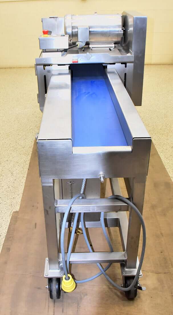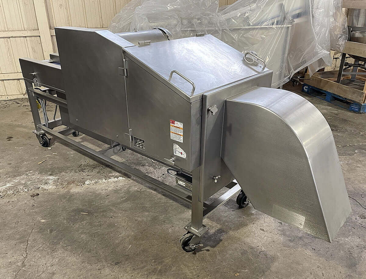 Urschel M6 Dicer. This machine comes with 1/4 inch feed drum, and a 3/4 inch crosscut spindle. Circular knife spindle spacings can be easily adjusted in increments 1/4″.10-inch wide feed belt with 35-inch length of open belt-feed area. Includes factory stainless steel operator control panel with safety interlock system. USDA food grade construction, including stainless steel cutting spindles, tubular support frame, guards, shrouds, infeed hopper and discharge chute. 5 HP 208 / 230 / 460 volt 3 phase drive motor.