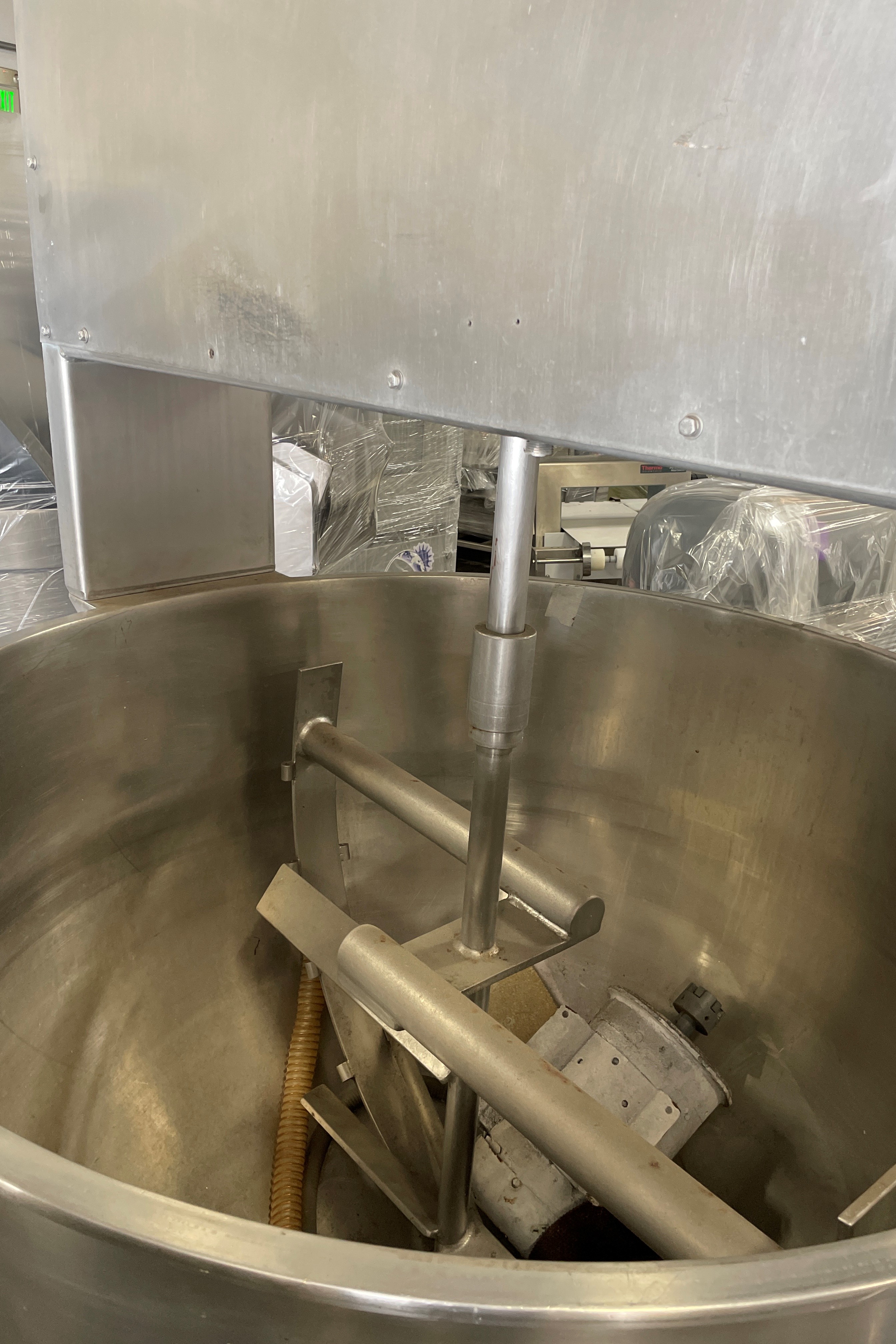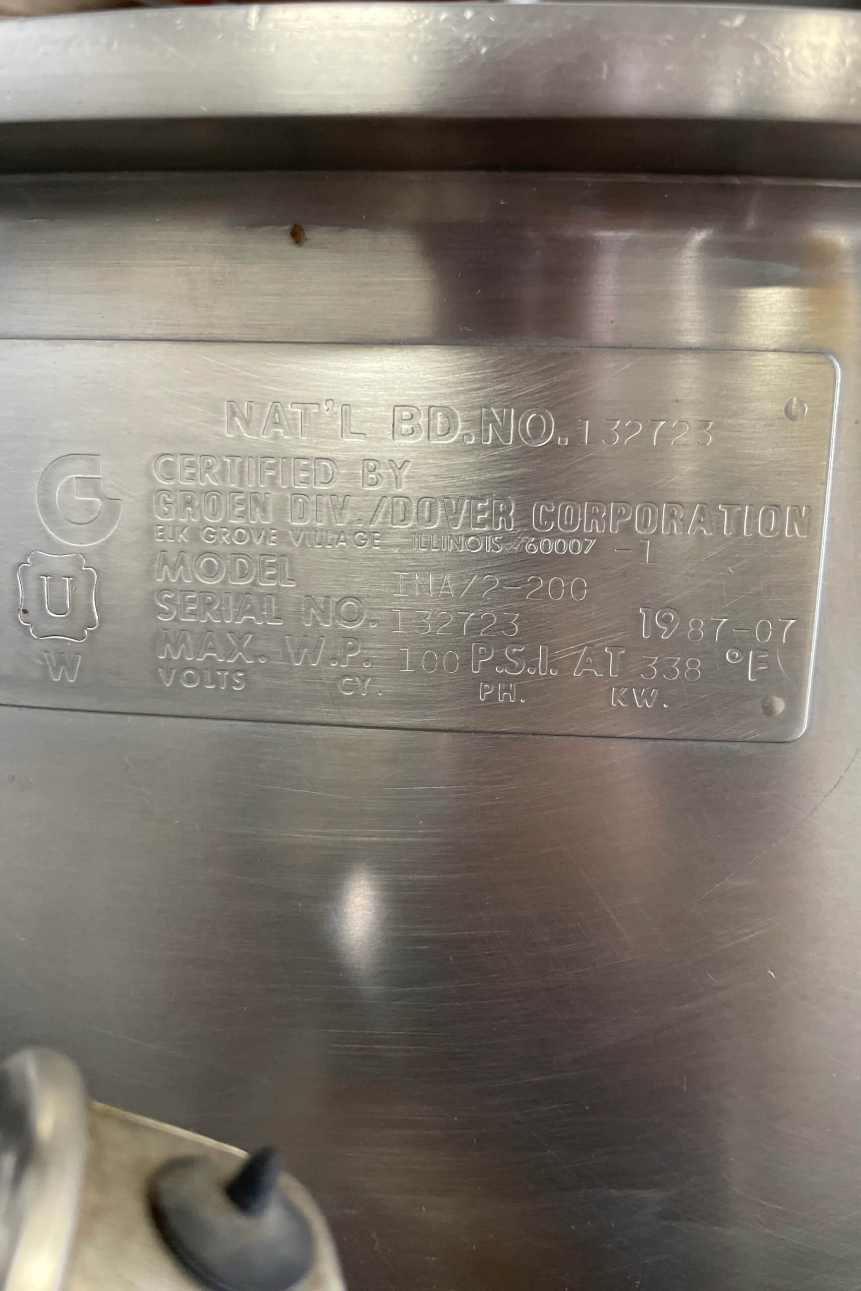 Used Groen INA2 200 Gal Stainless Steel Kettle. stainless steel Kettle. Single motion center agitation with scrappers. 200 gallon capacity, Rated: 90 psi @ 338° Fahrenheit. Internal atmospheric design pressure @ 250° Fahrenheit. Mounted on elevated, inclined 304 stainless steel channel bridge.