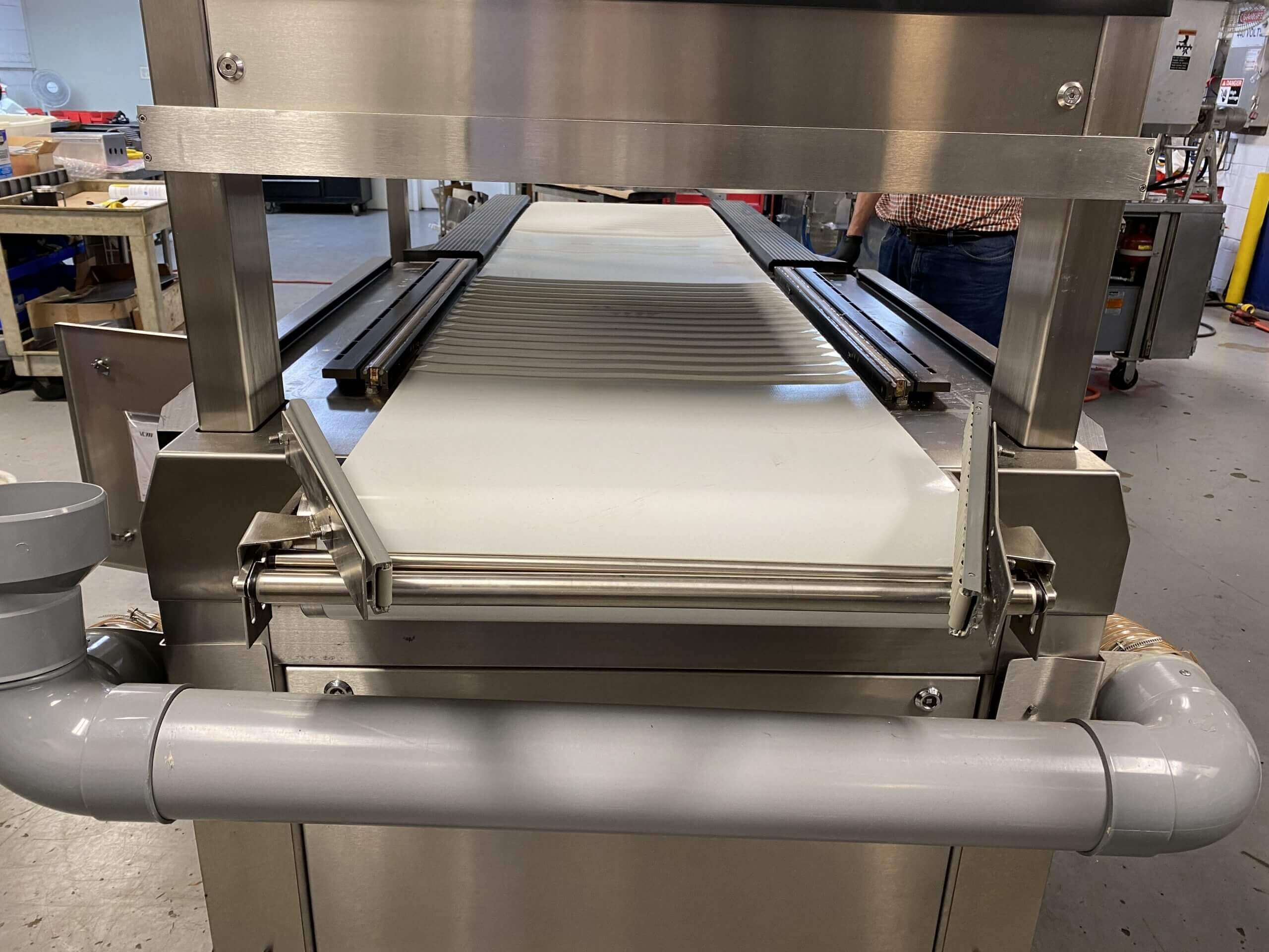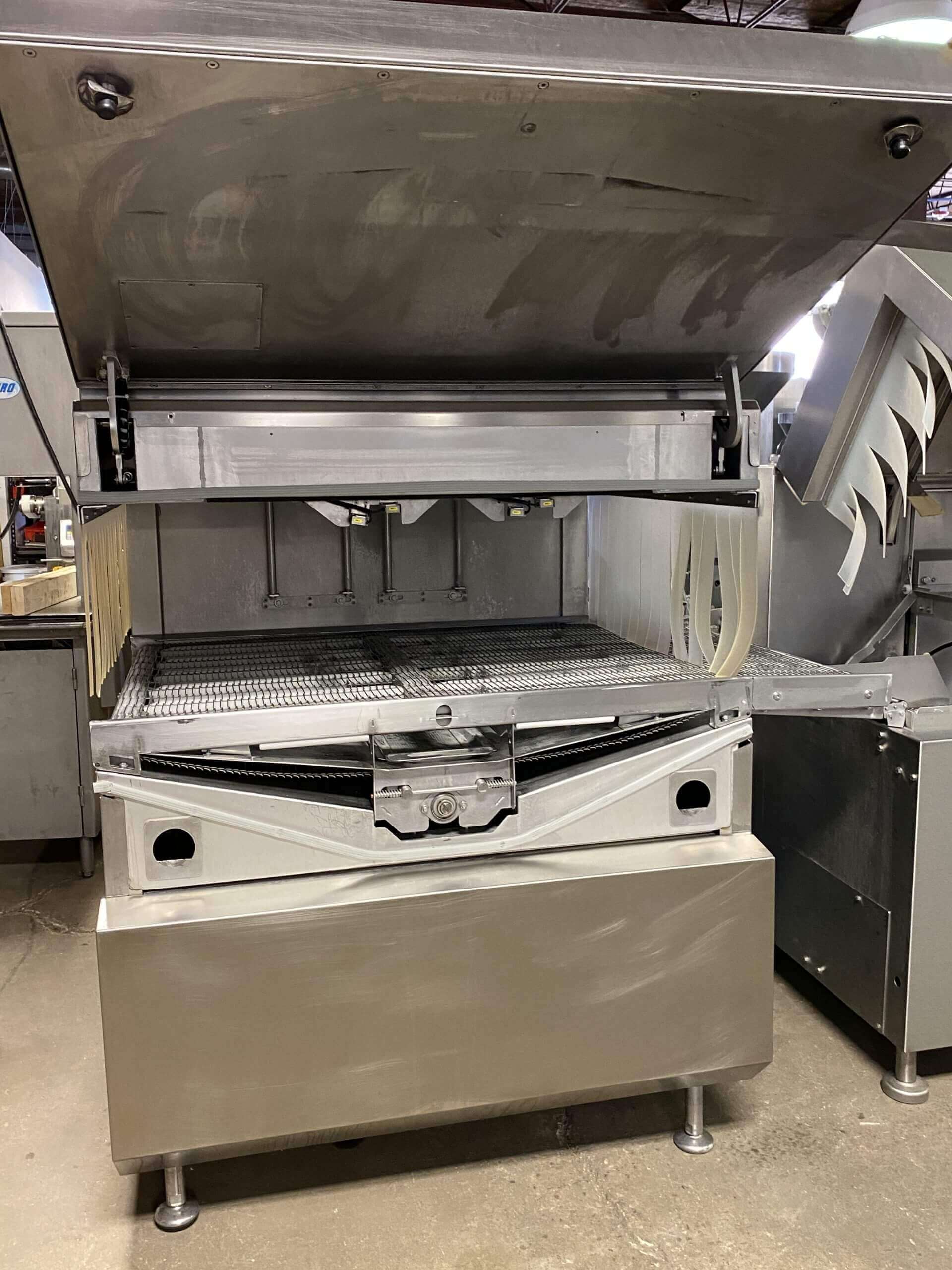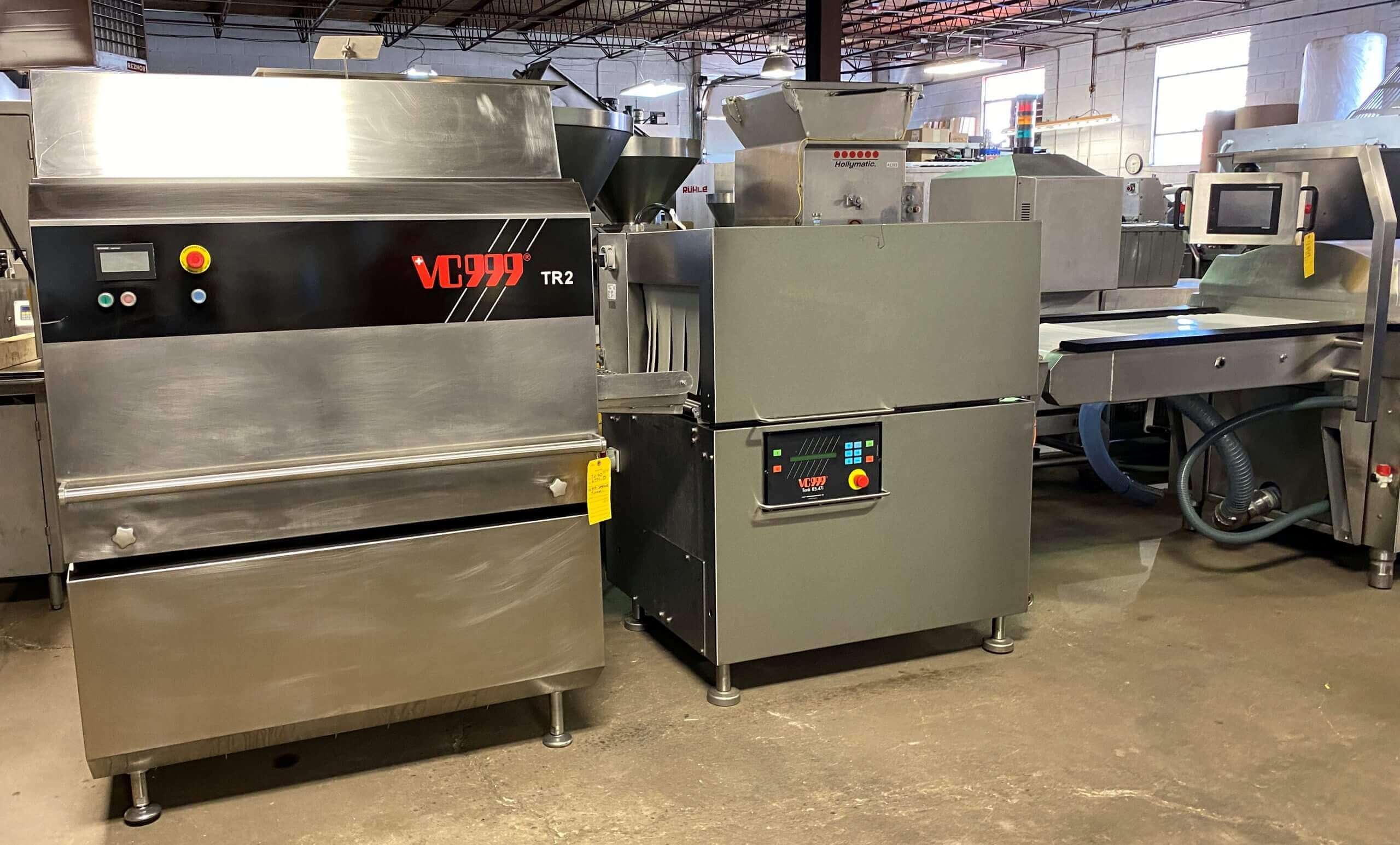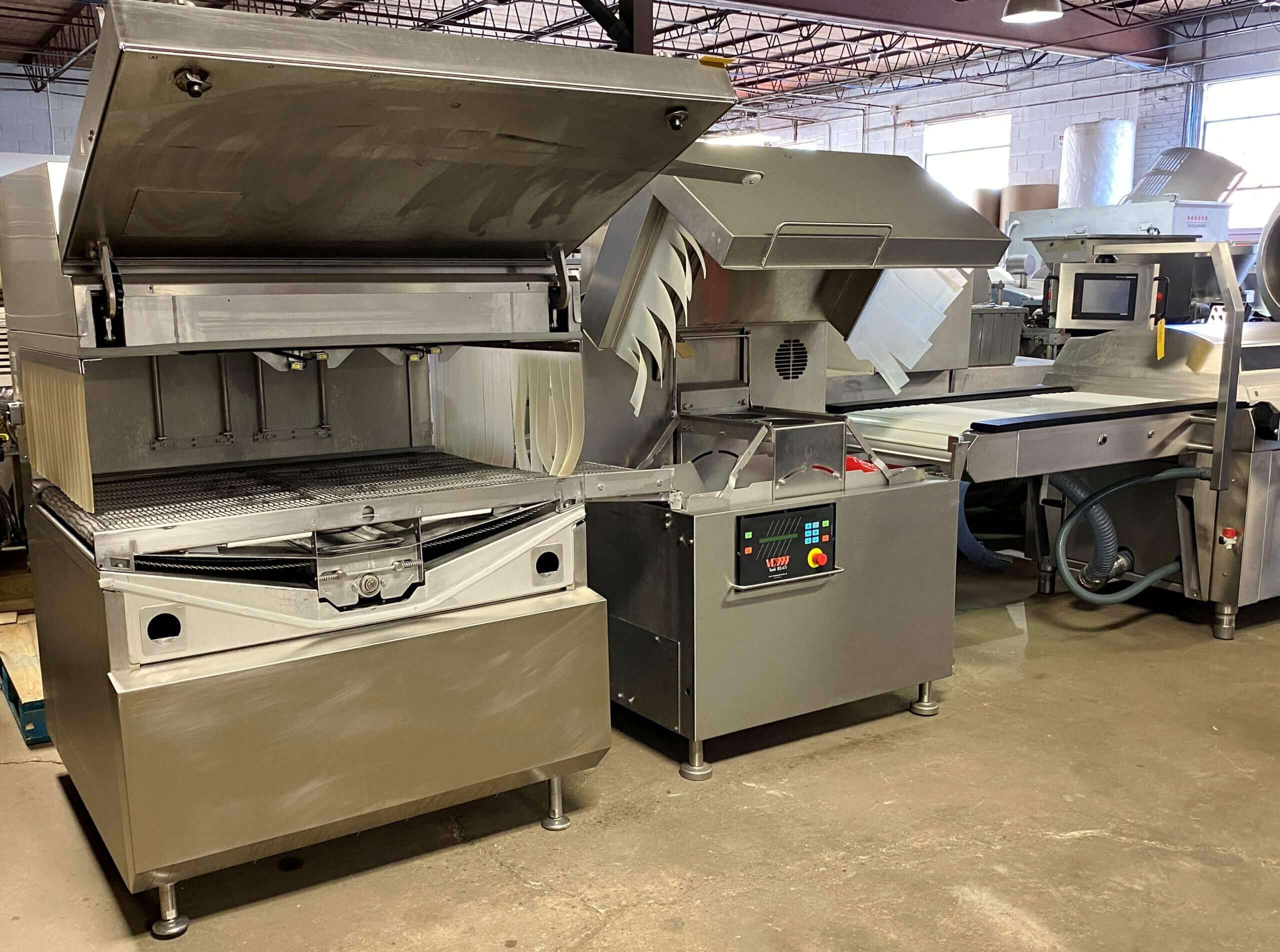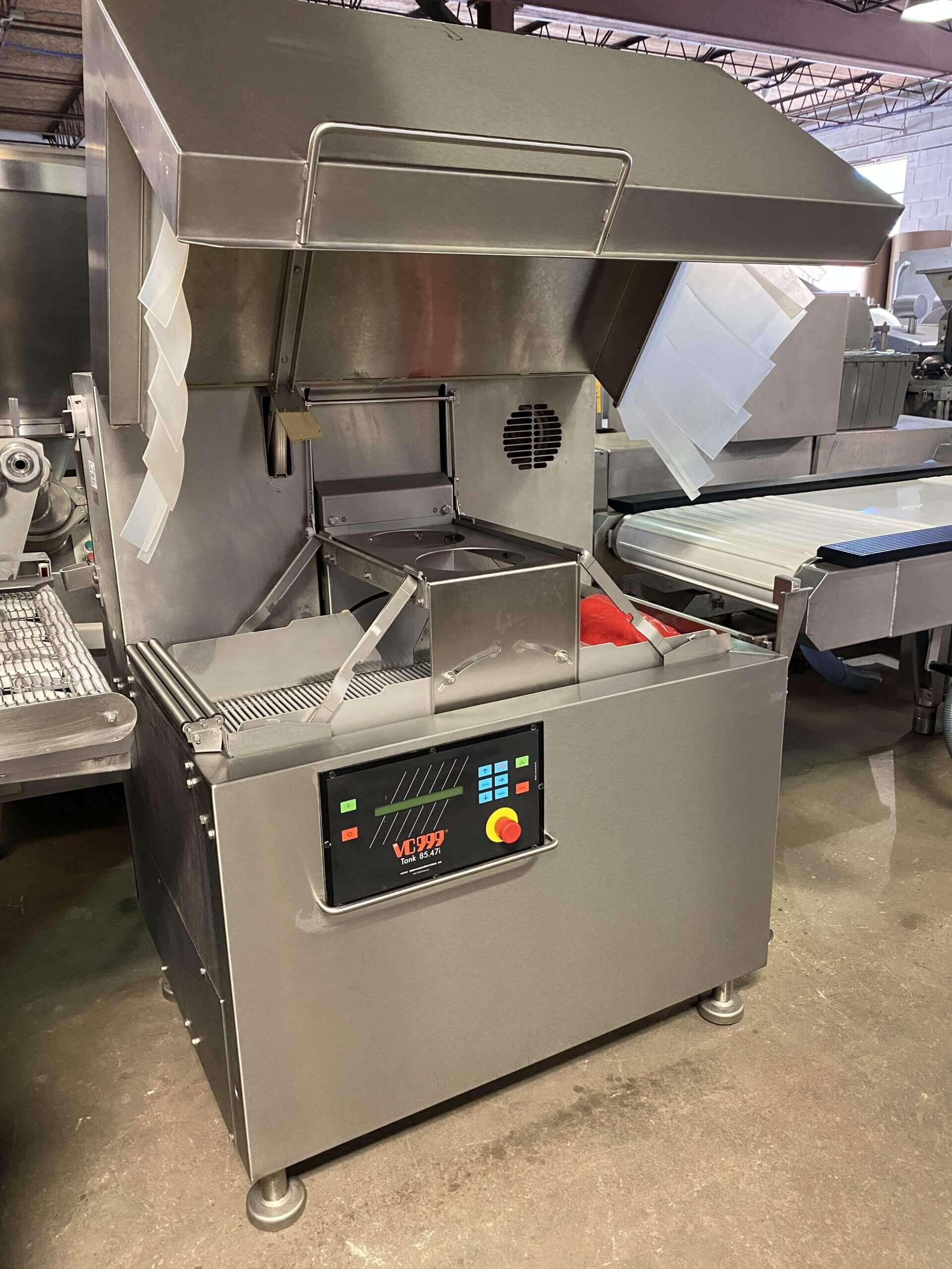 VC999 Automatic Vacuum Chamber machine. All stainless steel construction. Twin 34″ long sealing bars. 9.8″ product height. 2-3 cycles per minute. 8″ high resolution touch screen controls. 28″ wide quick release conveyor belt. Includes VC999 model 85.47i electric operated high capacity Shrink Tunnel, TR2 Air blow off and VC999 Trim Removal system. 440V/3PH/60HZ.