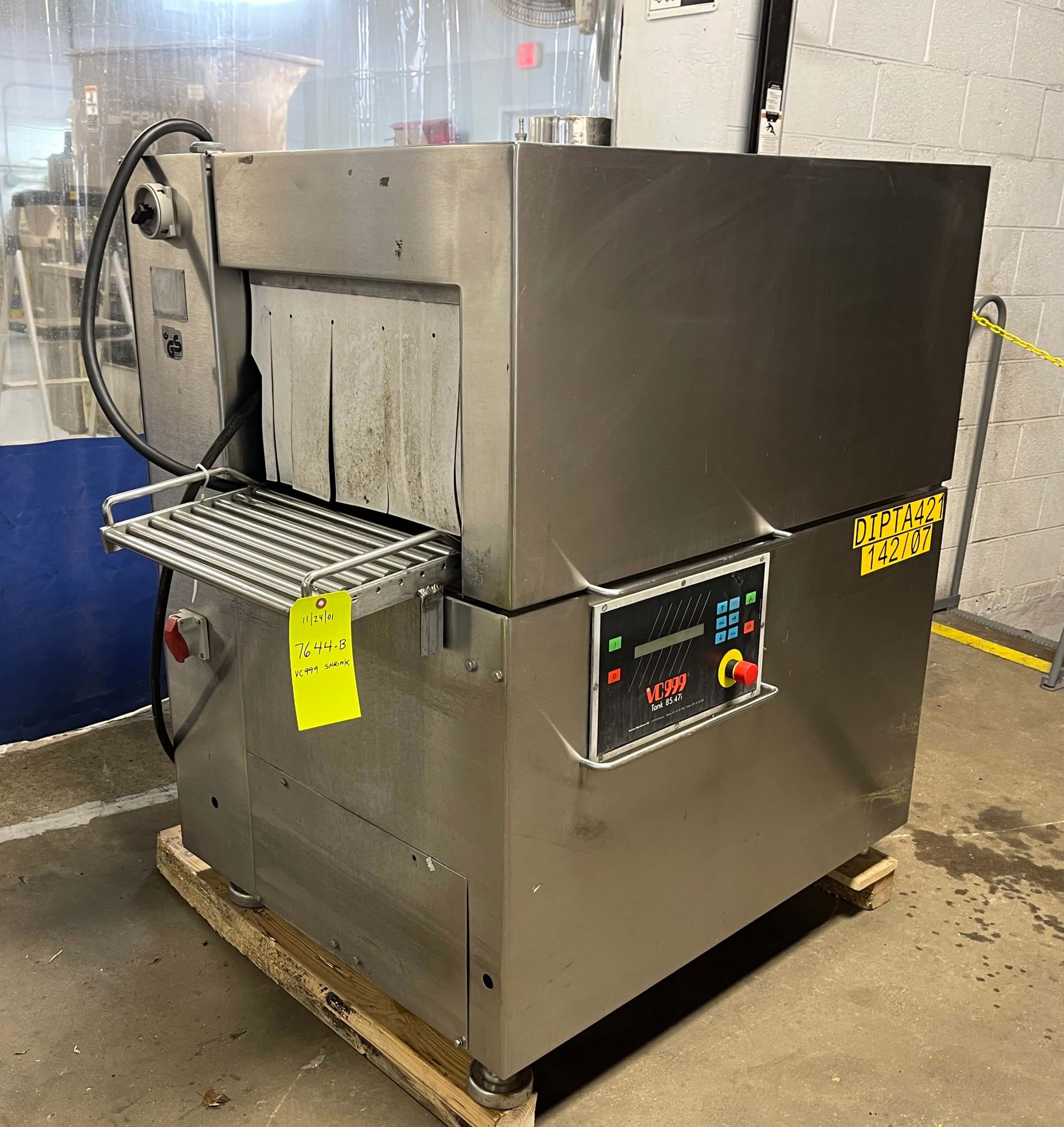 VC999 K7B Vacuum Packaging Chamber. All stainless steel construction. Twin 34″ long sealing bars. 9.8″ product height. 2-3 cycles per minute. 8″ high-resolution touch screen controls. 28″ wide quick release conveyor belt. Includes VC999 model 85.47i electric operated high capacity Shrink Tunnel. 440V/3PH/60HZ.
