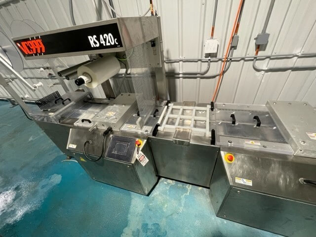 VC999 RS 420C Rollstock Machine. all stainless steel construction, 420mm wide x 300mm advance, includes 4 up tooling set (189 x 150mm finished package), package depth 100mm, 2 cross cut knives and 2 rotary knives, self contained Busch RA100 main vacuum pump, powered trim wind up system, 440V/3PH/60HZ, 30 AMPS. Requires air.