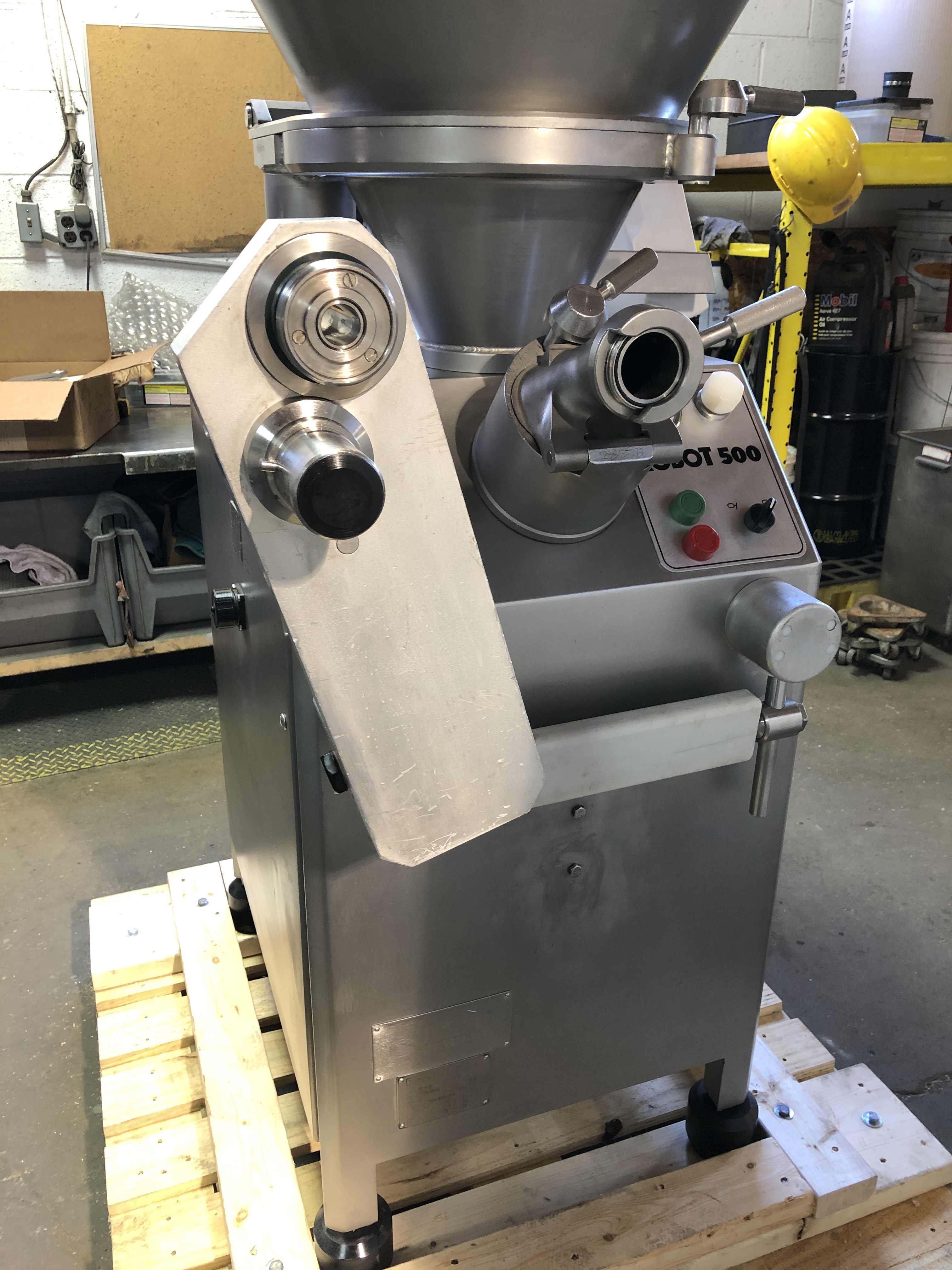 VEMAG 500 Vacuum Stuffer. 300# capacity hopper. PC 878 Digital control panel, Twist link drive. Fill rate up to 2,700 kg/h, portion speed up to 650 portions/minute. 220V/3ph/60Hz. This listing consists of stock photos of the final Vemag 500 vacuum stuffer with twist linking capabilities for a hot dog and sausage production. This machine will come complete with one stuffing horn from inventory.