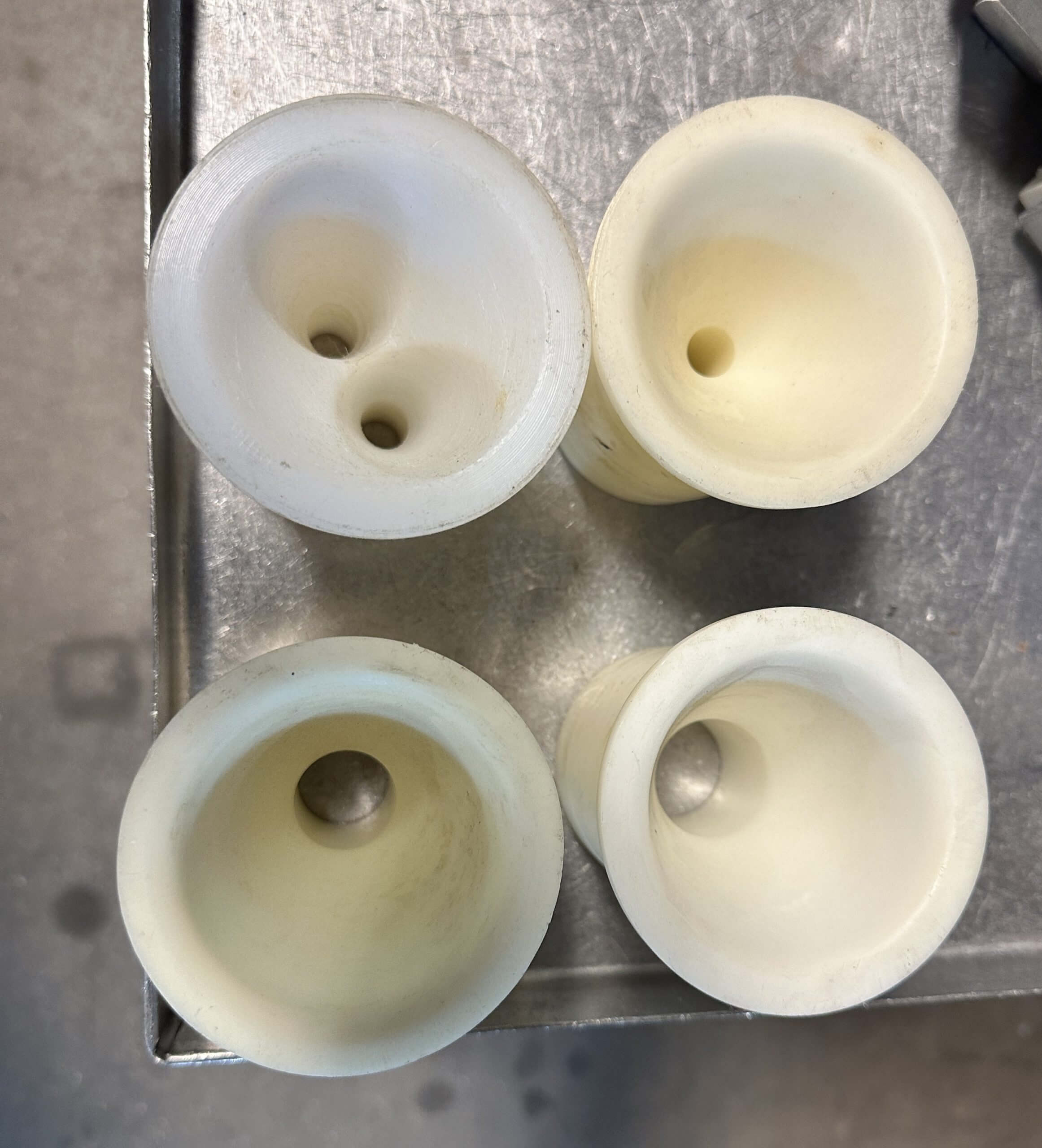 VEMAG 811 Guillotine Cutoff Nozzle. Designed to operate with a Vacuum Stuffer equipped with portion control to extrude products such as ground and emulsified beef, chicken, cheese and dough. 2-3/4″ exit funnel, includes (4) inserts. Pneumatic operated piston, 25 psi @ 60cfm, operates with Vacuum Stuffer with 24 volt plug.