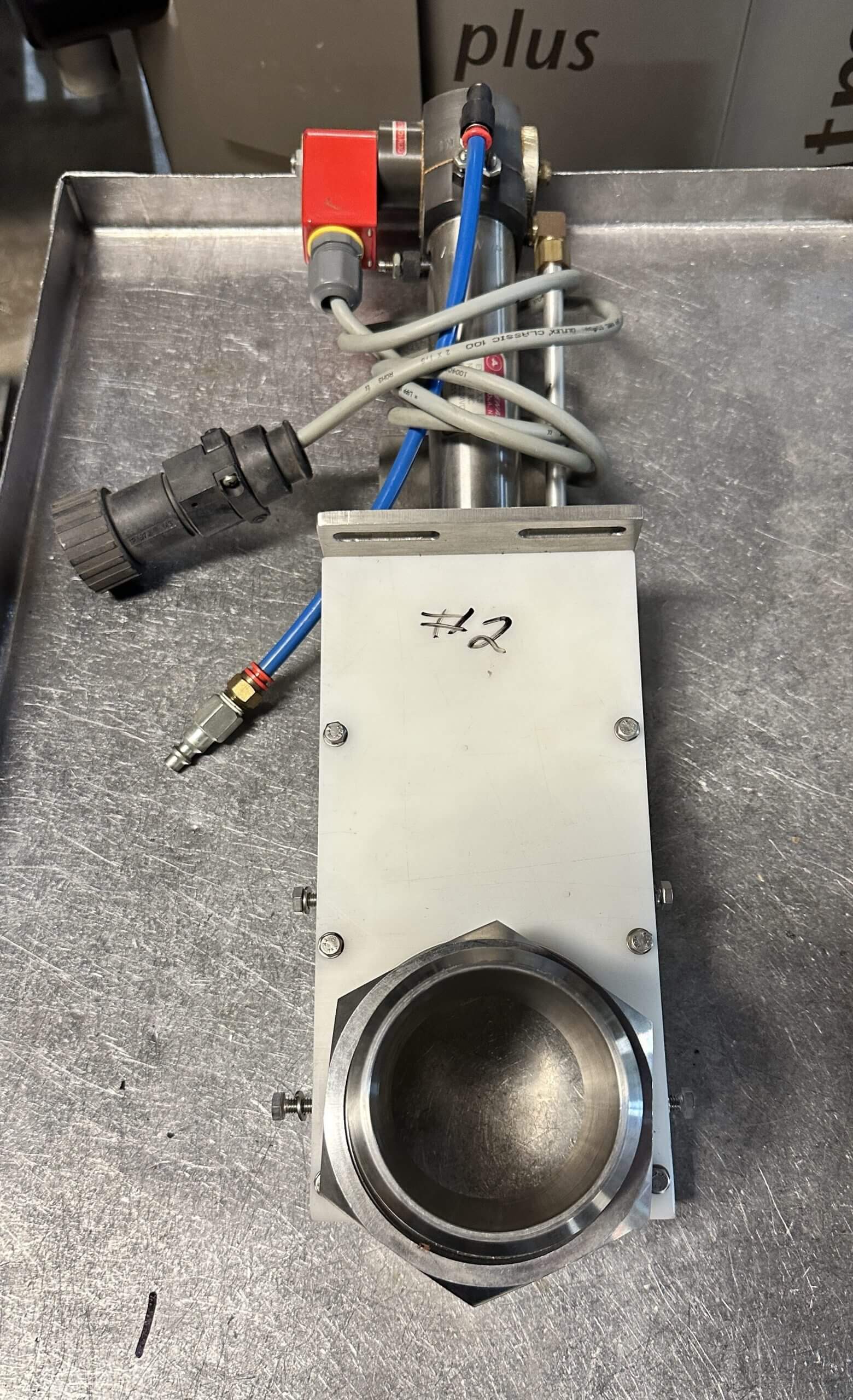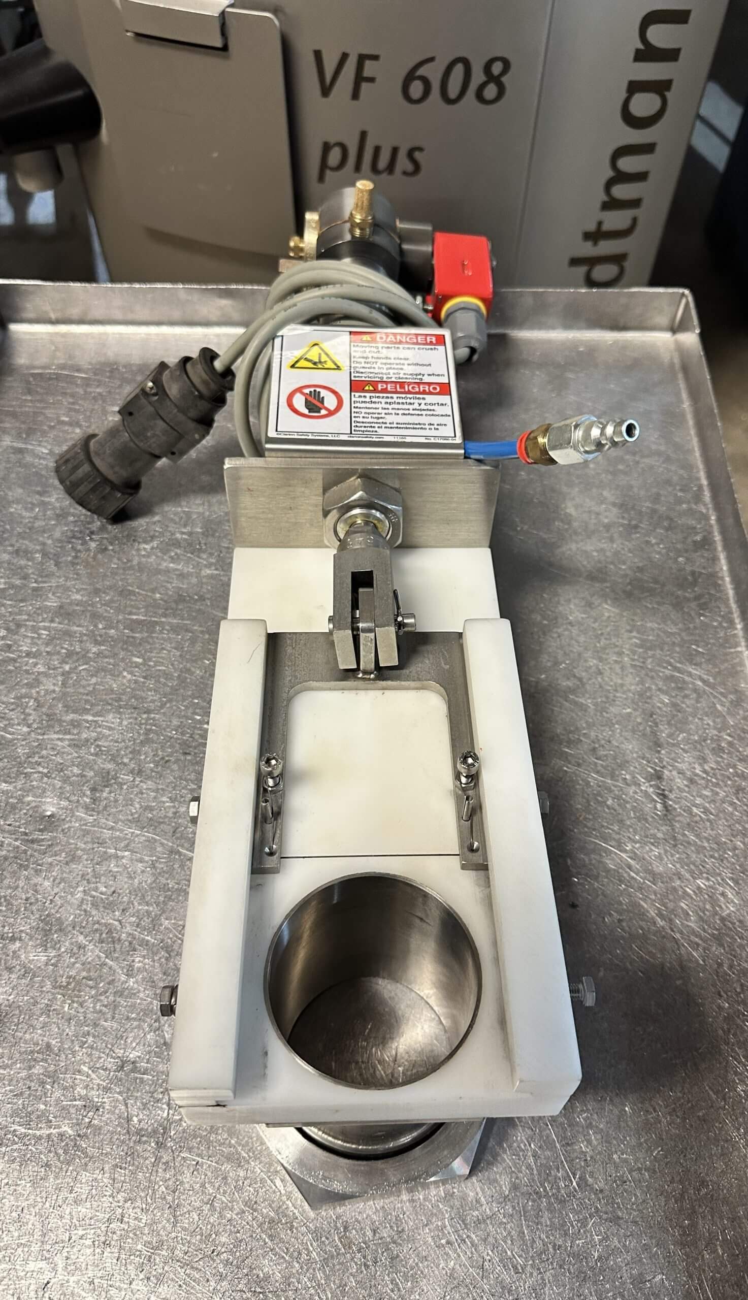 VEMAG 811 Guillotine Cutoff Nozzle. Designed to operate with a Vacuum Stuffer equipped with portion control to extrude products such as cheese and dough. 2-3/4″ exit funnel, Pneumatic operated piston, 25 psi @ 60 cfm, operates with Vacuum Stuffer with 24 volt plug.