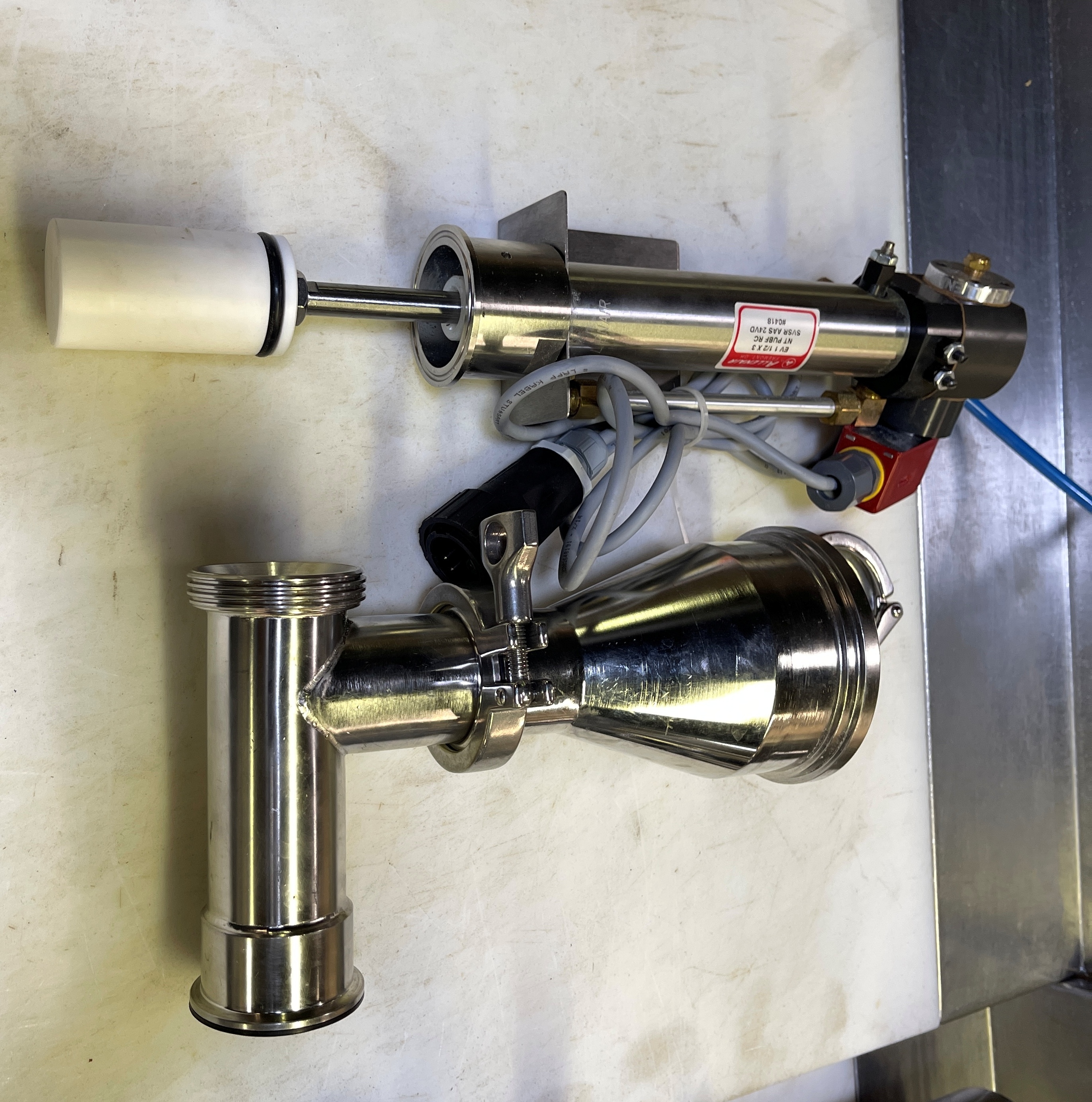 VEMAG Depositor. Single Piston Depositor. Operates with a Vacuum Stuffer equipped with portion control. 1-1/2″ diameter HD Plastic Piston. 2″ Tri Clamp fitting, Stainless steel construction. 25 psi @ 60 cfm, 24 volt plug supplied by Vacuum Stuffer.