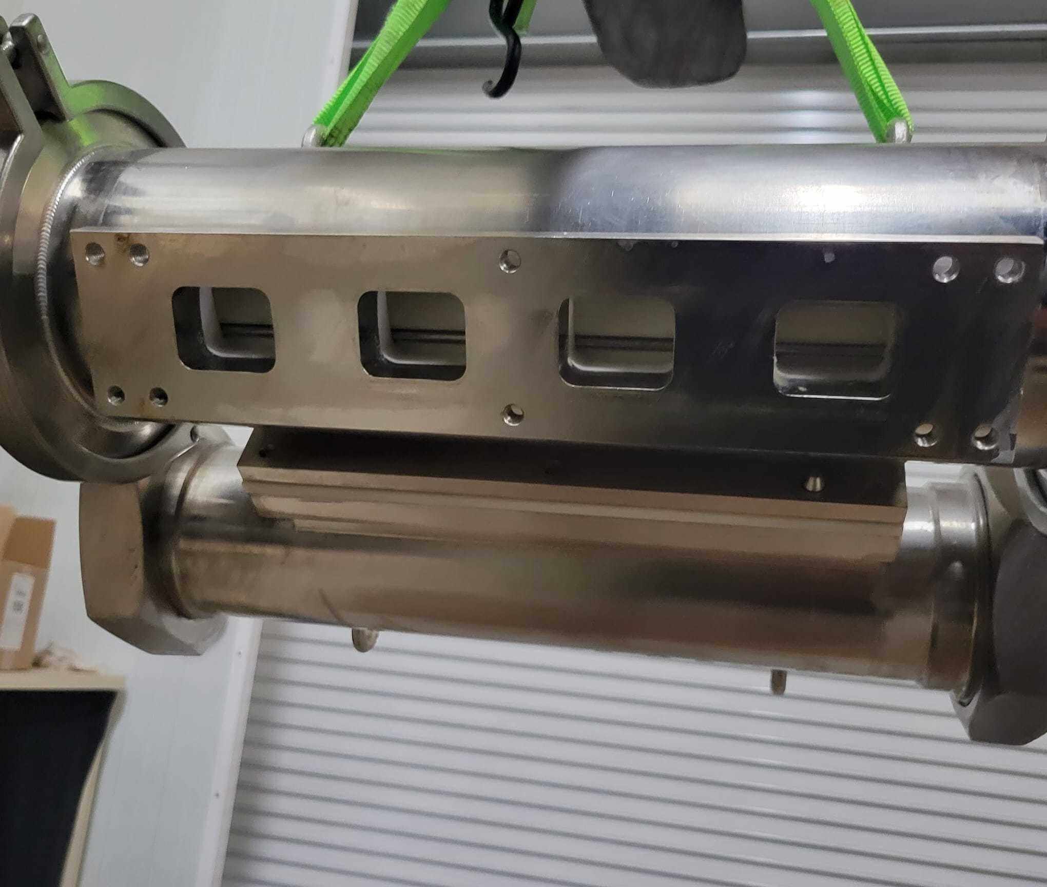 Vemag stainless steel Waterwheel portioner, stainless steel construction, 16″ wide, 4 lane with exit piping. Direct mount to a Vacuum Stuffer.