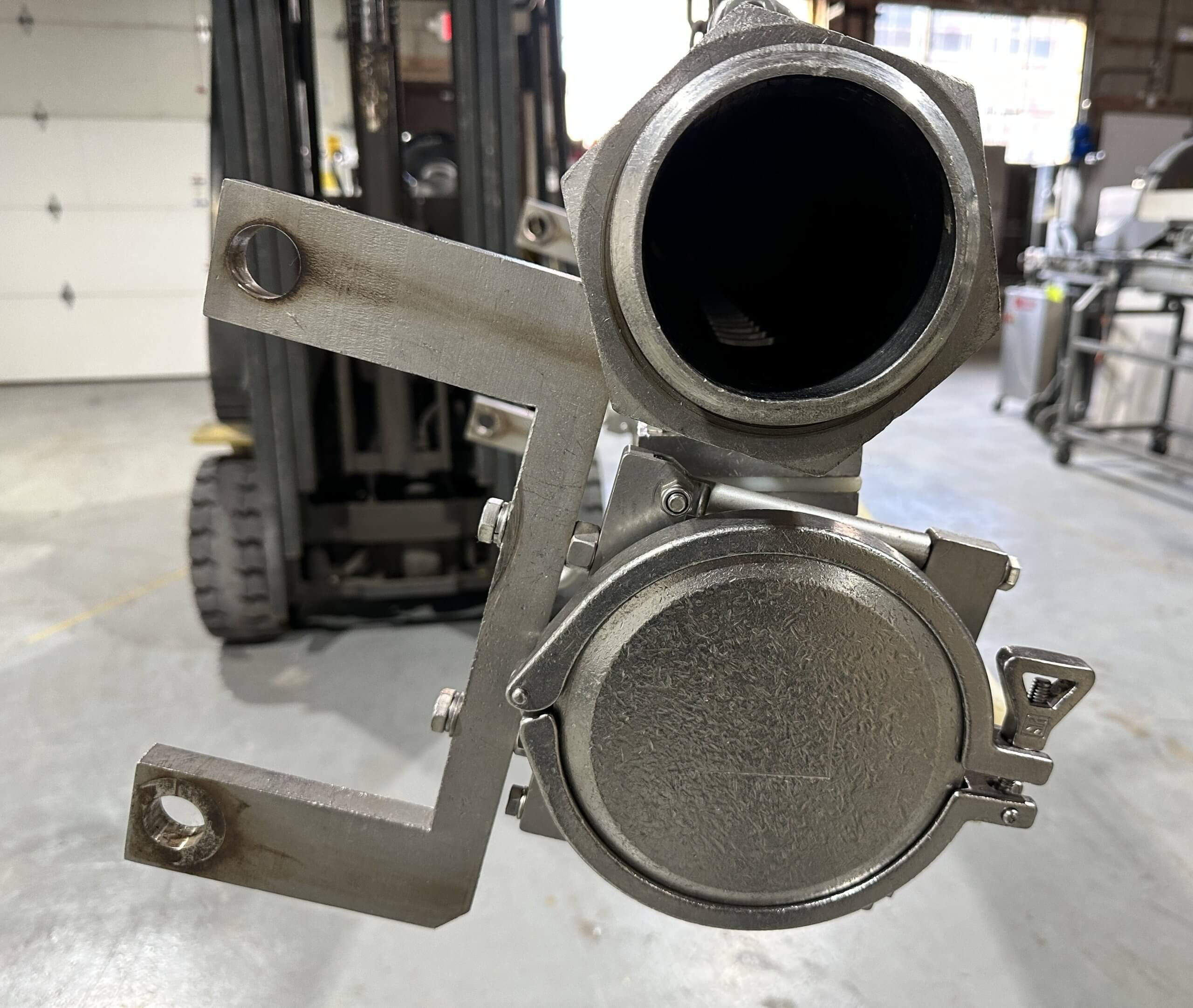 VEMAG Waterwheel Depositor & Filler. Reiser multi-outlet Waterwheel attachment is a flow divider that connects to the Vemag Stuffer. The Waterwheel divides the product flow into multiple lanes with equal portions from each outlet. All stainless steel construction, 34″ long x 4-1/4″ ID extrusion pipe, 25 discharge ports, 36″ x 3-3/4″ Inlet pipe. complete with full set of veins and rotor, equipped high density plastic extrusion plate with 16.5mm holes and mounting bracket.