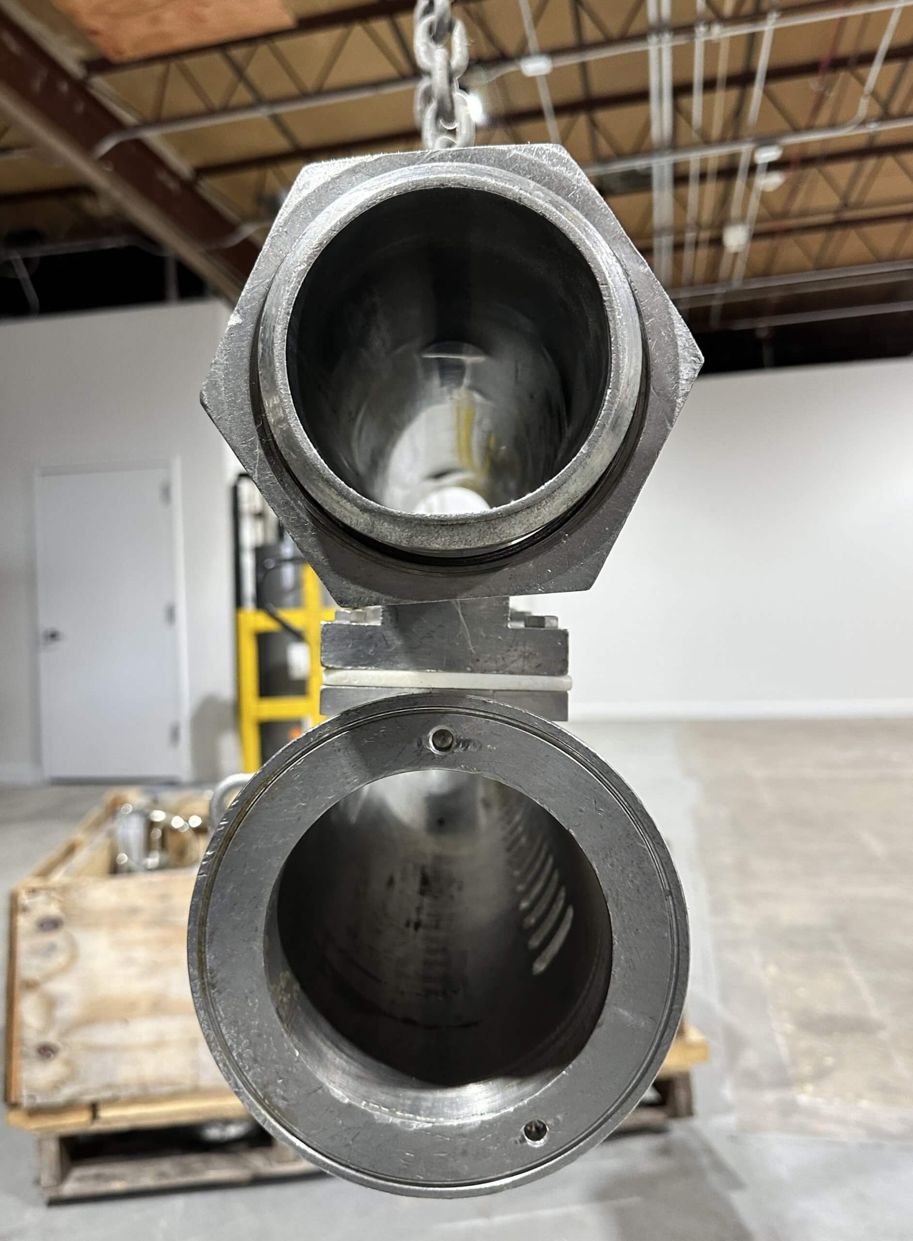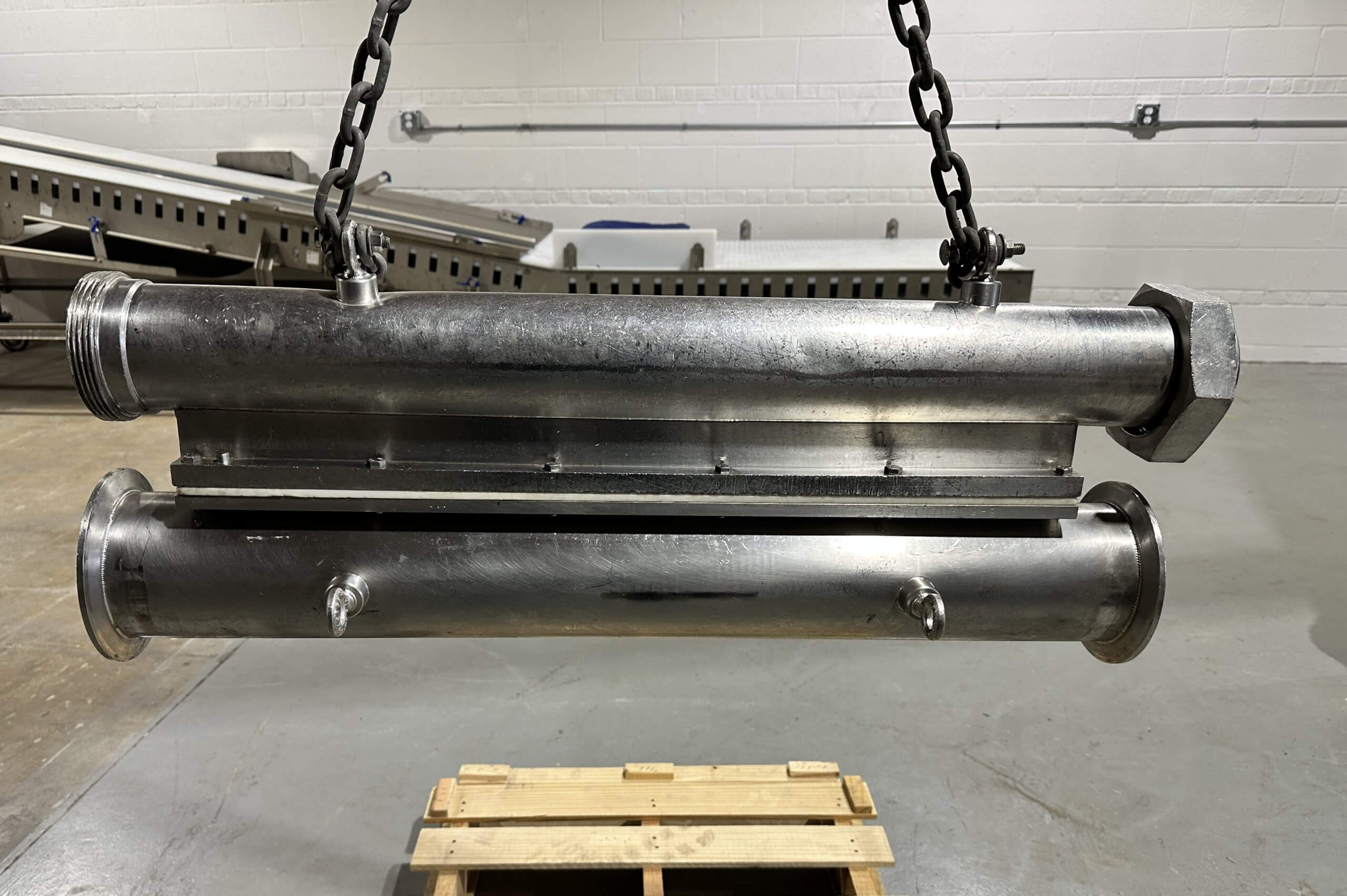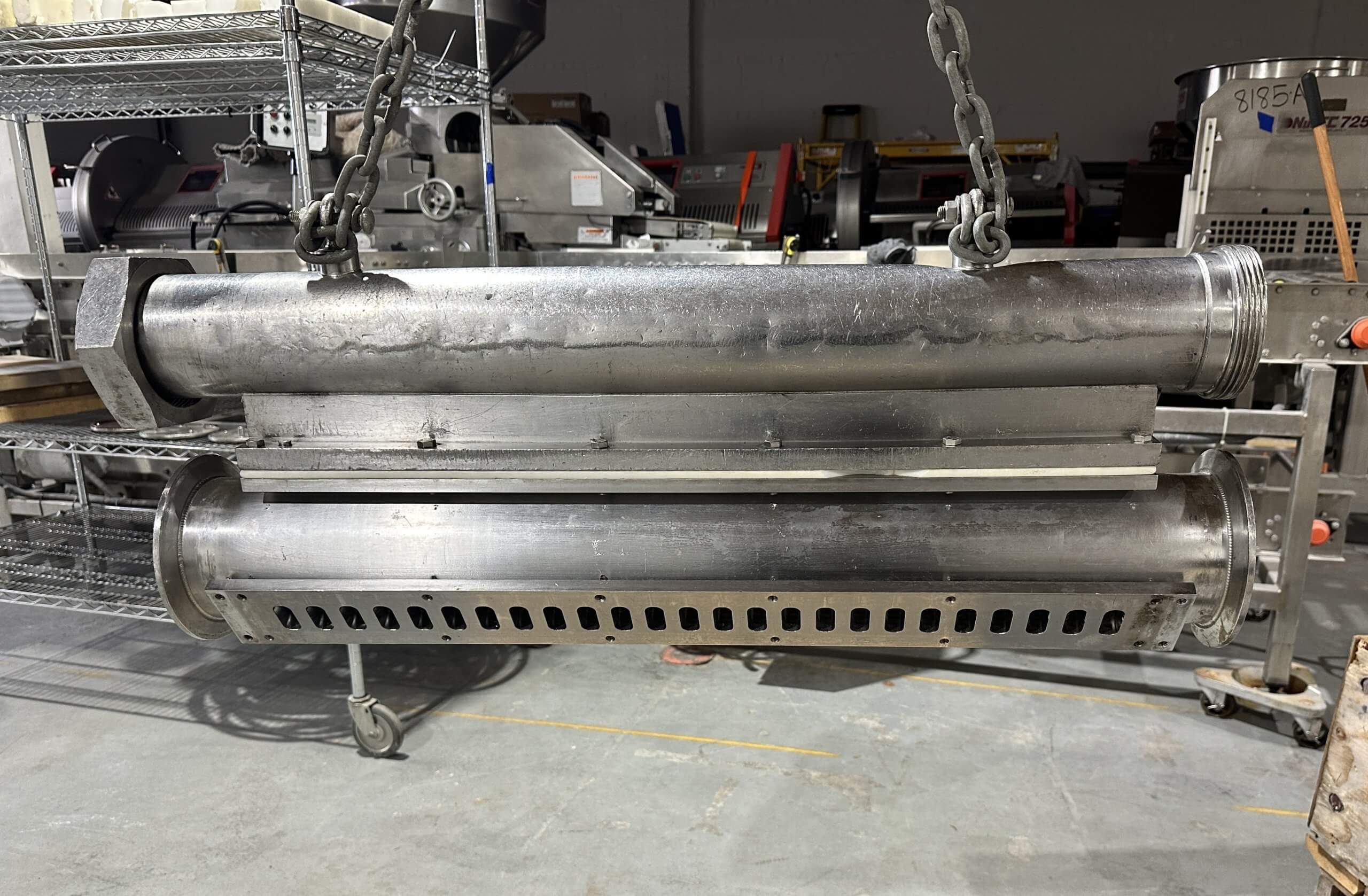 VEMAG Waterwheel Depositor & Filler. FRAME ONLY. Reiser multi-outlet Waterwheel attachment is a flow divider that connects to the Vemag Stuffer. The Waterwheel divides the product flow into multiple lanes with equal portions from each outlet. All stainless steel construction, 34″ long x 4-1/4″ ID extrusion pipe, 25 discharge ports, 36″ x 3-3/4″ Inlet pipe. Parts are available through Robert Reiser.