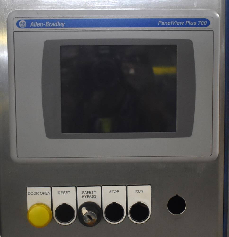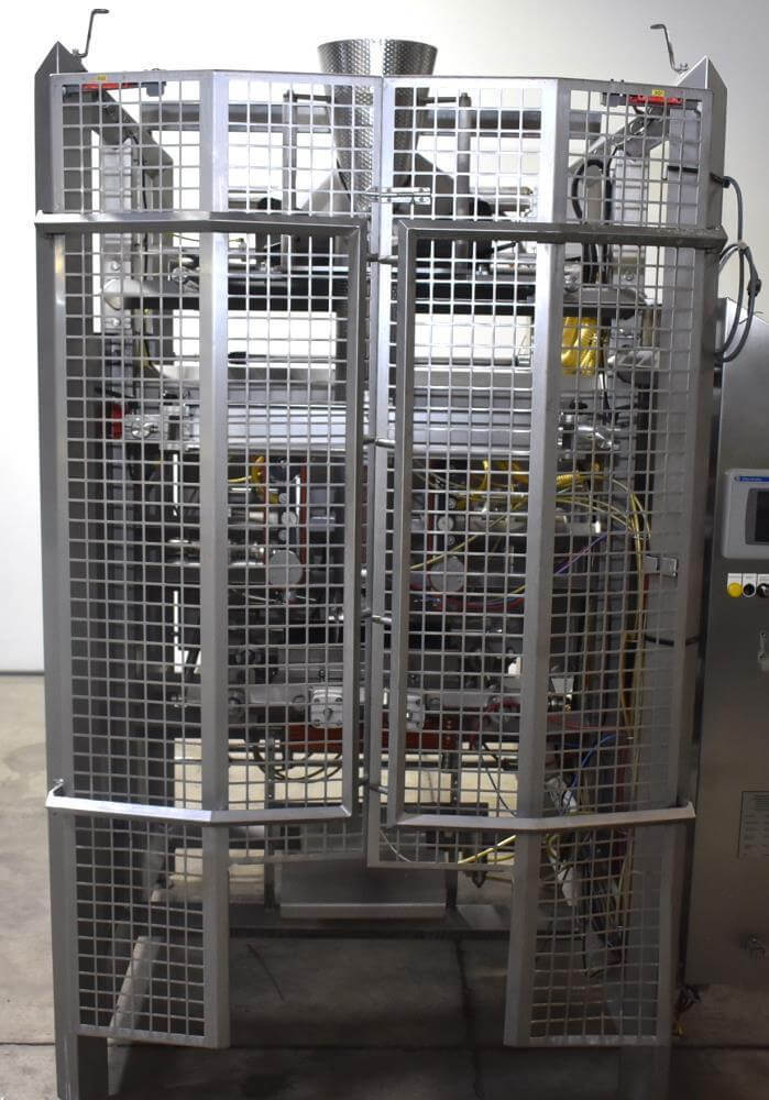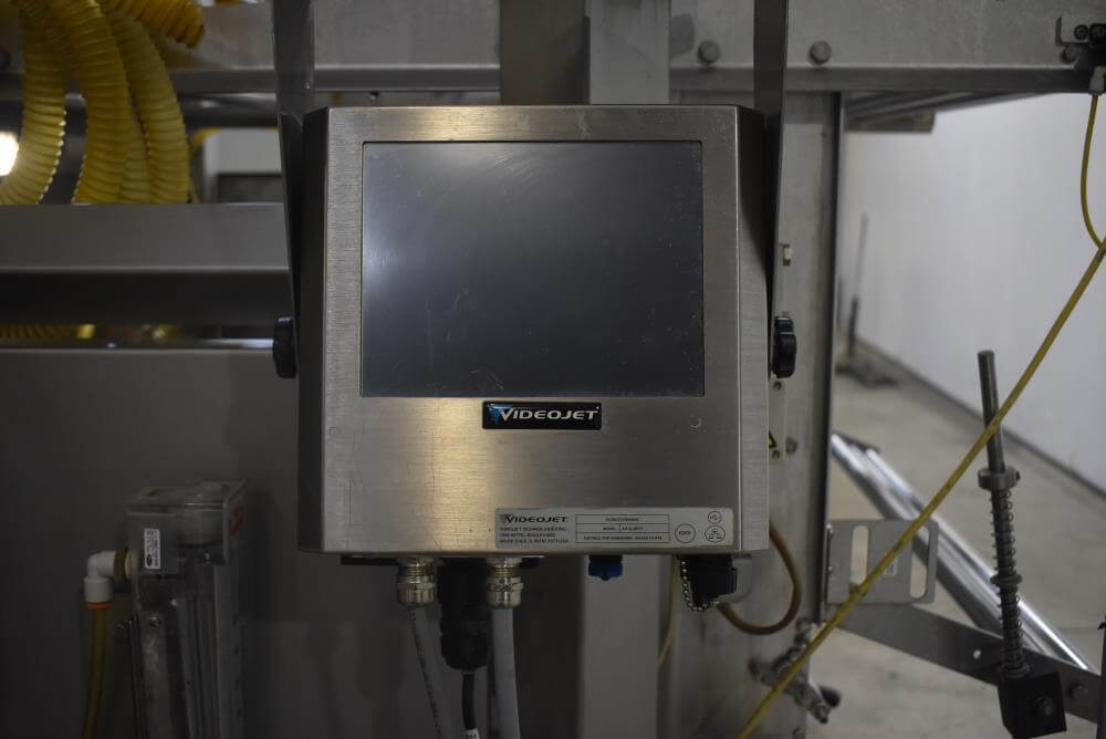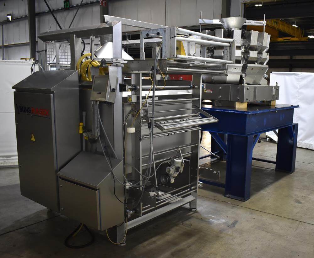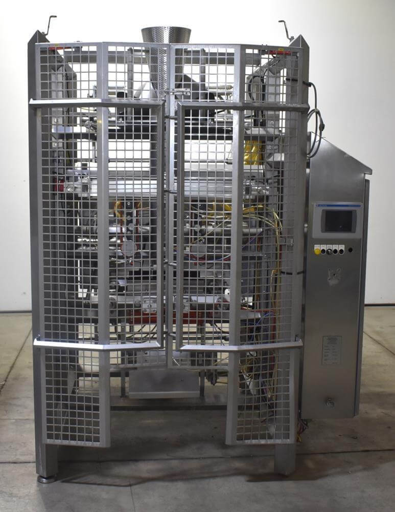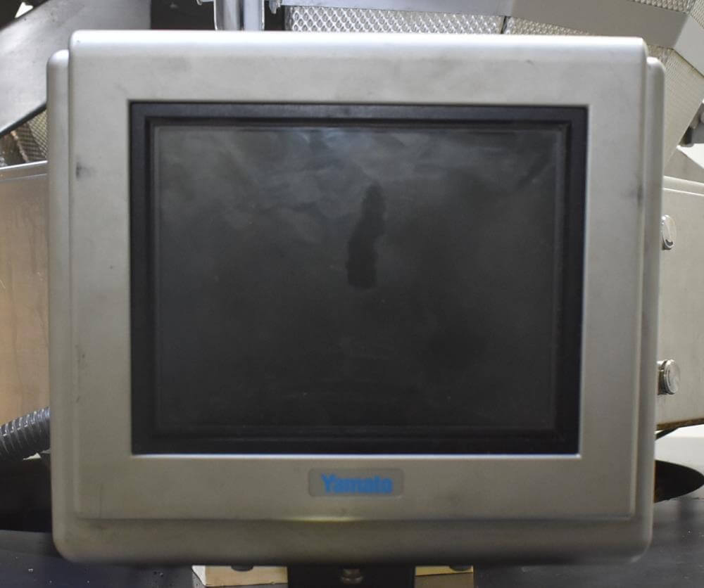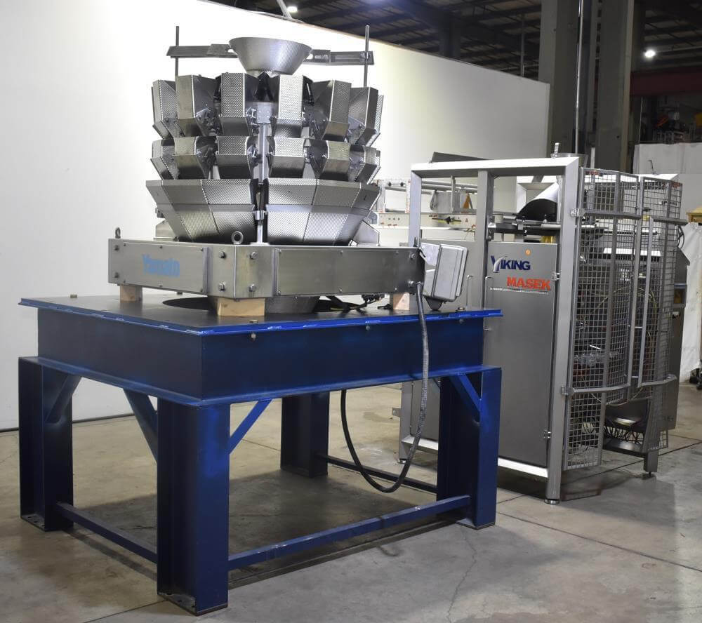 Viking Masek Vertical Form Fill Seal Machine with Yamato ADW-514SV Scale. Capable of speeds up to 80 bags per minute. Stainless steel washdown frame. Bag size range: 3.94″ – 15.75″ or 100mm – 400mm (width); 3.94″ – 23.62″ or 100mm – 600mm (length). Seal bar 16-1/2″ long x 1″ wide with a serrated knife. Chute infeed: 10-1/2″ diameter, outfeed: 6″ diameter. Videojet 8.4 clarity washdown printer/coder. Allen Bradley compactlogix L43 PLC controls, A/B Panelview Plus 700 HMI, A/B Kinetix 6000 servo drive, A/B powerflex 40P drive. Dekker DuraVane vacuum pump. Automatic web tracking system. Gusseting. Deflator below the seal jaw. Air-cooled end seals. Includes Yamato ADW-514SV data weigh scale, 20 to 2,000 gram weight range, max speed 120 per minute, 14 head dimpled/embossed 5 liter bucket. (Scale frame not included)