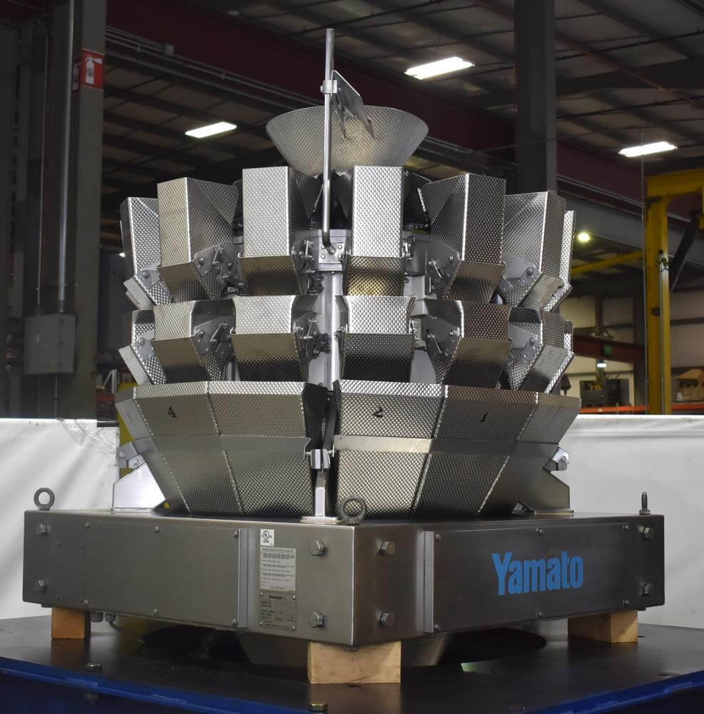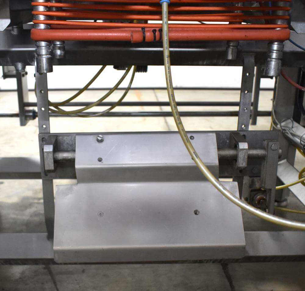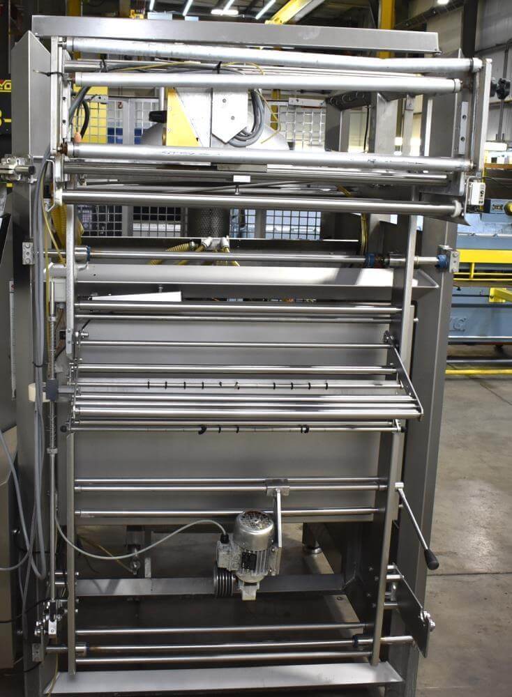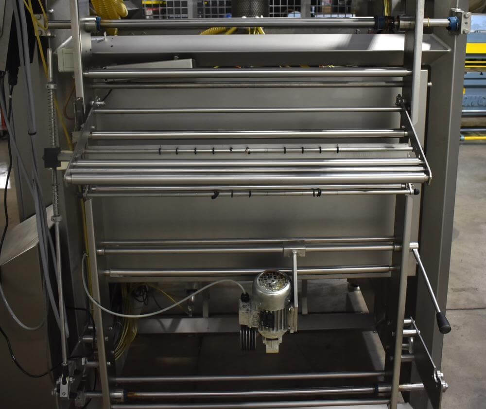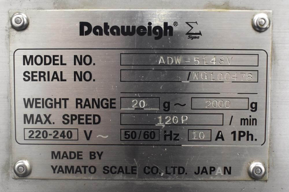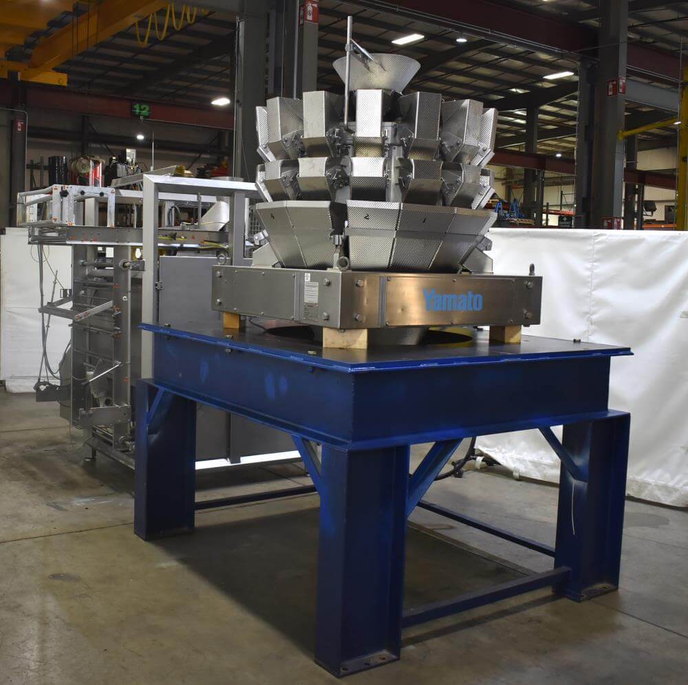Viking Masek Vertical Form Fill Seal Machine with Yamato ADW-514SV Scale. Capable of speeds up to 80 bags per minute. Stainless steel washdown frame. Bag size range: 3.94″ – 15.75″ or 100mm – 400mm (width); 3.94″ – 23.62″ or 100mm – 600mm (length). Seal bar 16-1/2″ long x 1″ wide with a serrated knife. Chute infeed: 10-1/2″ diameter, outfeed: 6″ diameter. Videojet 8.4 clarity washdown printer/coder. Allen Bradley compactlogix L43 PLC controls, A/B Panelview Plus 700 HMI, A/B Kinetix 6000 servo drive, A/B powerflex 40P drive. Dekker DuraVane vacuum pump. Automatic web tracking system. Gusseting. Deflator below the seal jaw. Air-cooled end seals. Includes Yamato ADW-514SV data weigh scale, 20 to 2,000 gram weight range, max speed 120 per minute, 14 head dimpled/embossed 5 liter bucket. (Scale frame not included)