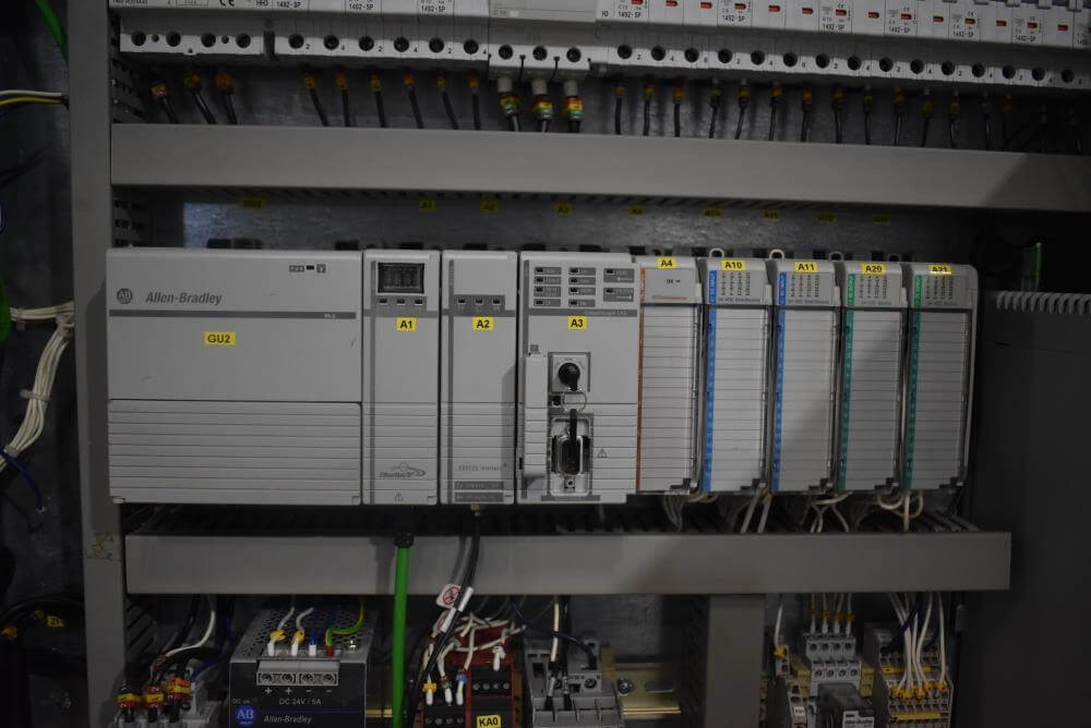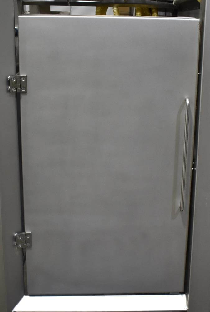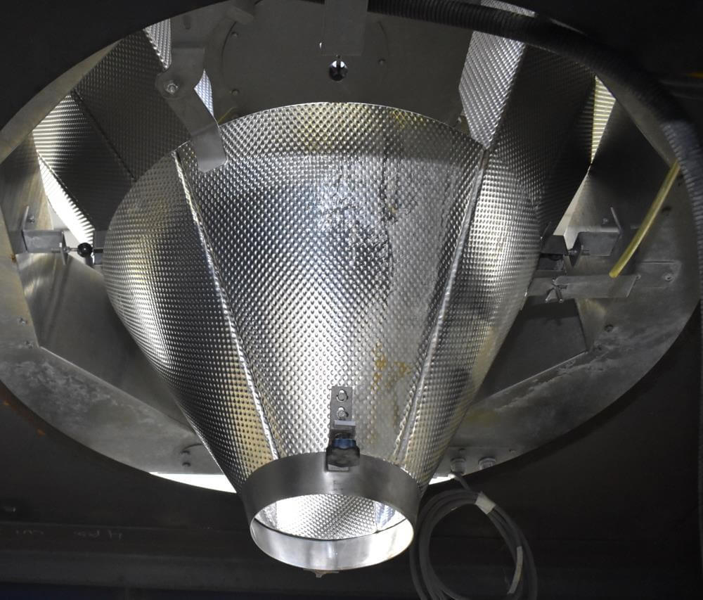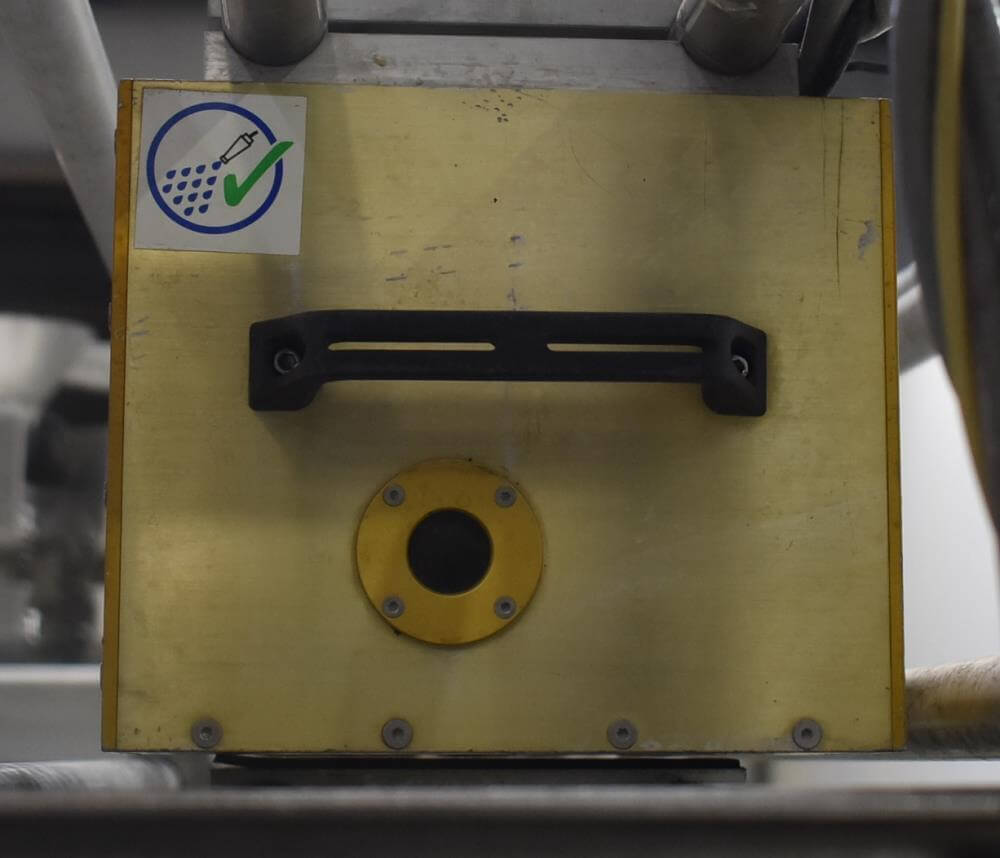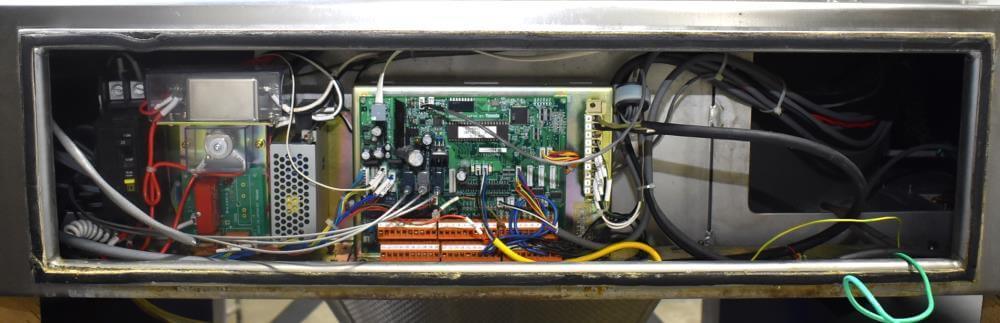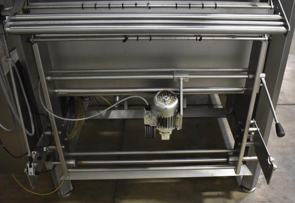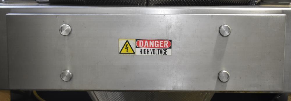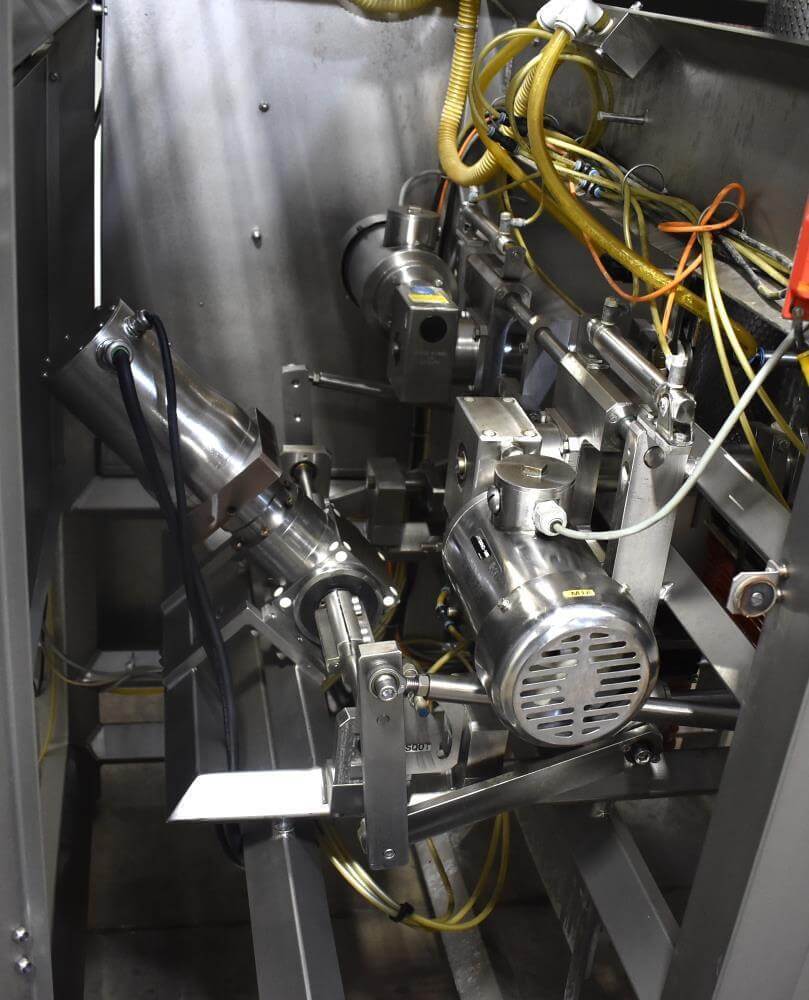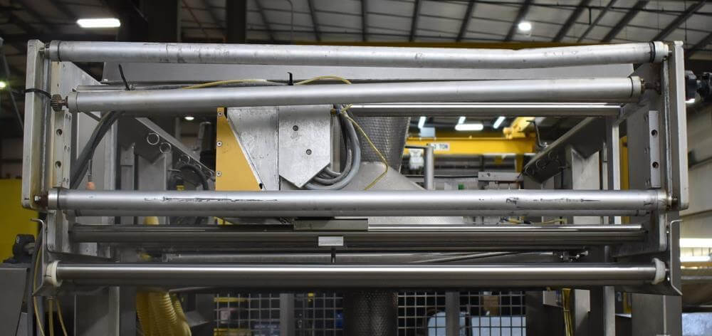 Viking Masek Vertical Form Fill Seal Machine with Yamato ADW-514SV Scale. Capable of speeds up to 80 bags per minute. Stainless steel washdown frame. Bag size range: 3.94″ – 15.75″ or 100mm – 400mm (width); 3.94″ – 23.62″ or 100mm – 600mm (length). Seal bar 16-1/2″ long x 1″ wide with a serrated knife. Chute infeed: 10-1/2″ diameter, outfeed: 6″ diameter. Videojet 8.4 clarity washdown printer/coder. Allen Bradley compactlogix L43 PLC controls, A/B Panelview Plus 700 HMI, A/B Kinetix 6000 servo drive, A/B powerflex 40P drive. Dekker DuraVane vacuum pump. Automatic web tracking system. Gusseting. Deflator below the seal jaw. Air-cooled end seals. Includes Yamato ADW-514SV data weigh scale, 20 to 2,000 gram weight range, max speed 120 per minute, 14 head dimpled/embossed 5 liter bucket. (Scale frame not included)