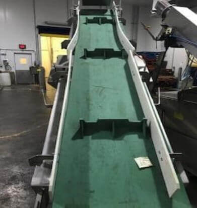 Incline Transfer Conveyor. 18″ wide plastic conveyor belt, 2″ cleats spa...