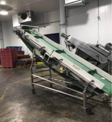 Kleenline Pack Off Conveyor. Twin conveyors: Top 12″ wide plastic conveyor bel...