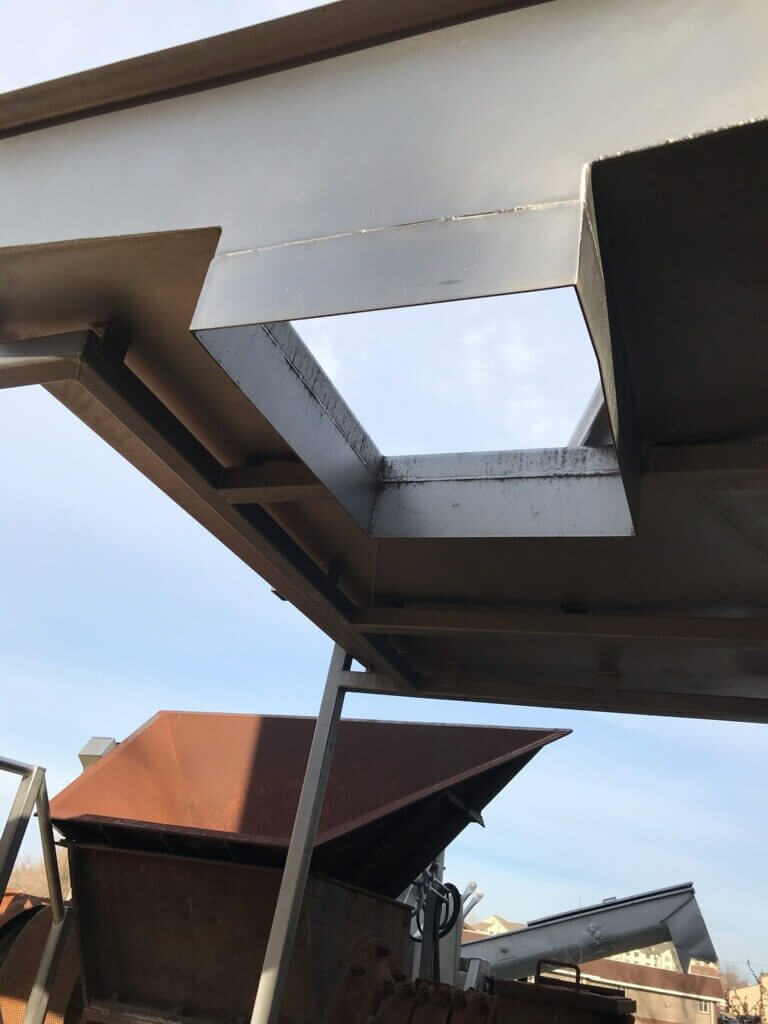 WEILER Inspection Table. 86” Tall, 64” wide, 72” long, 68” clearance under the hopper for grinder, 10” tall sides and adjustable-height feet.