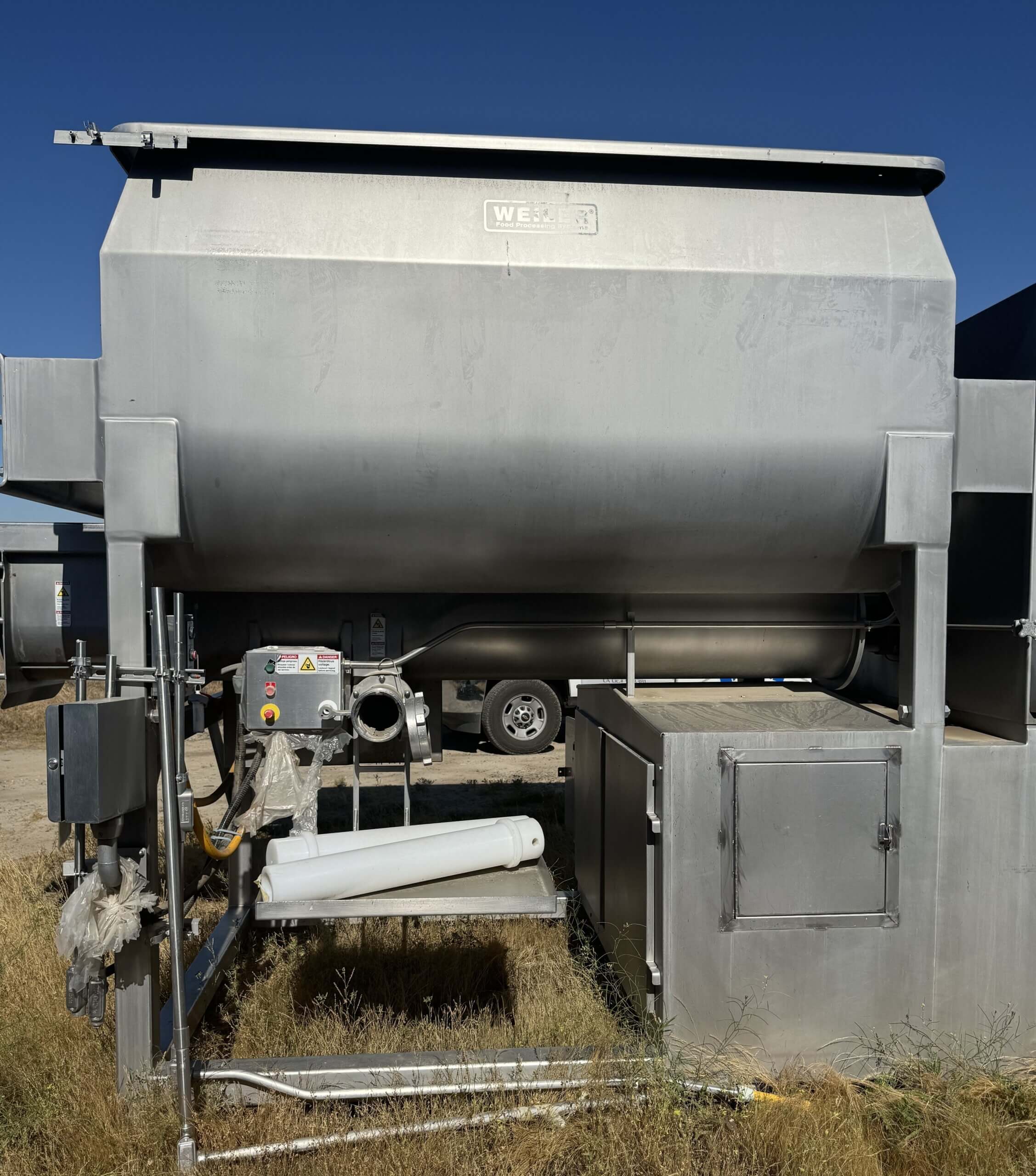 WEILER M7225 Paddle Blender. Twin overlapping, counter-rotating paddles, Single-end discharge door with 16″ diameter full-length screw. 7,500 Lbs. hopper capacity, stainless steel construction, 30 hp Paddle Mix motor, 15 hp Unload Screw motor. 460V/3PH/60HZ.