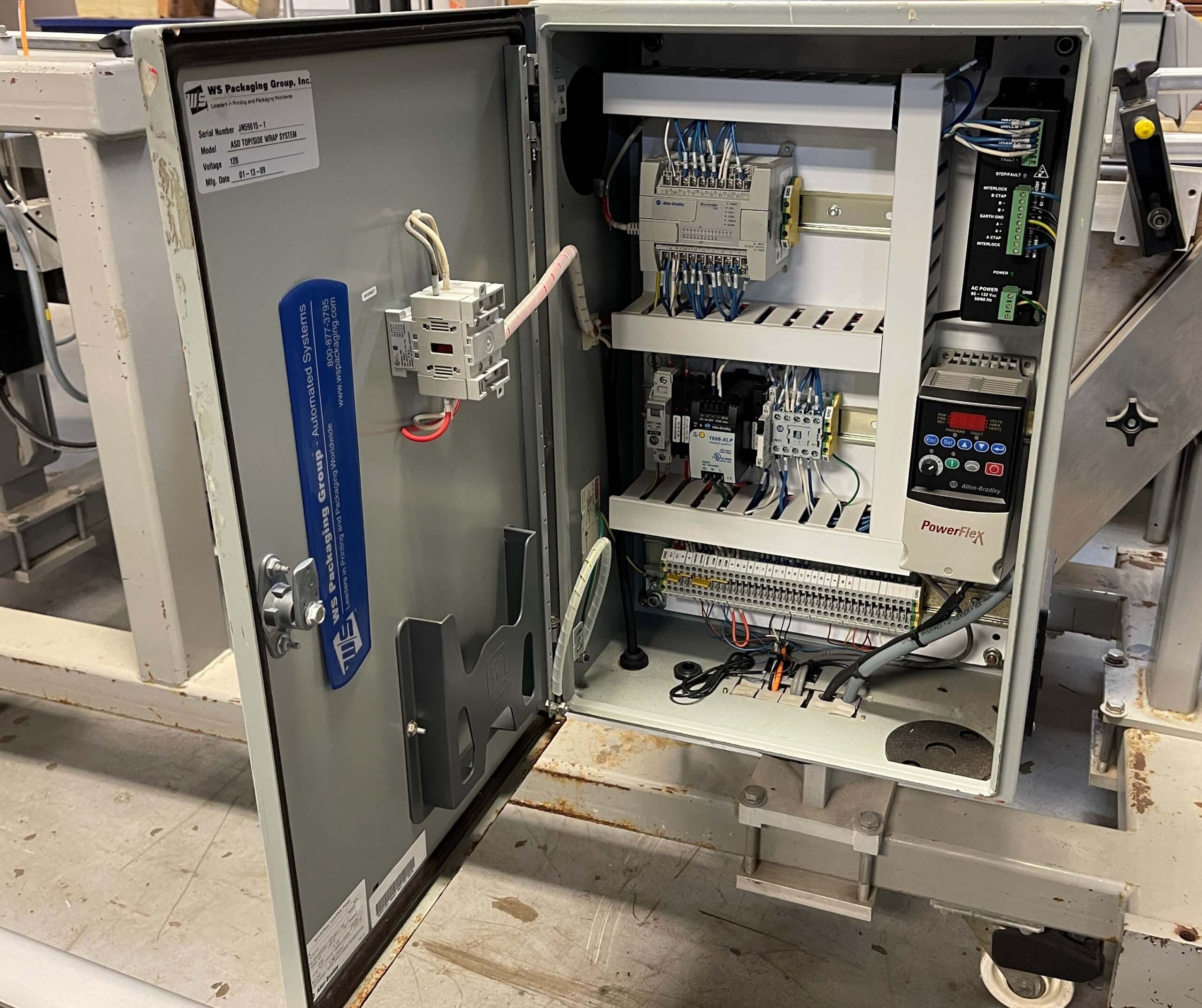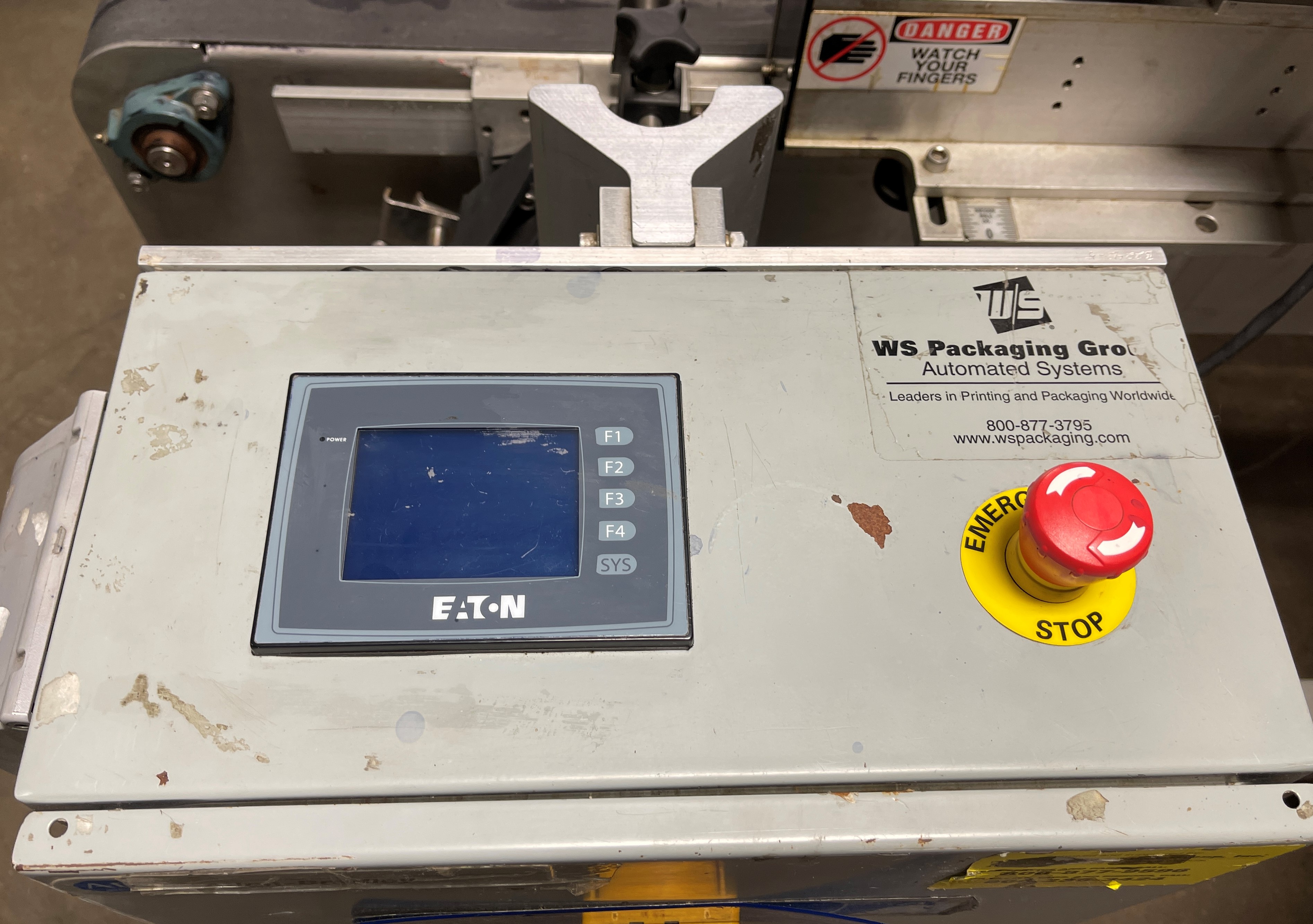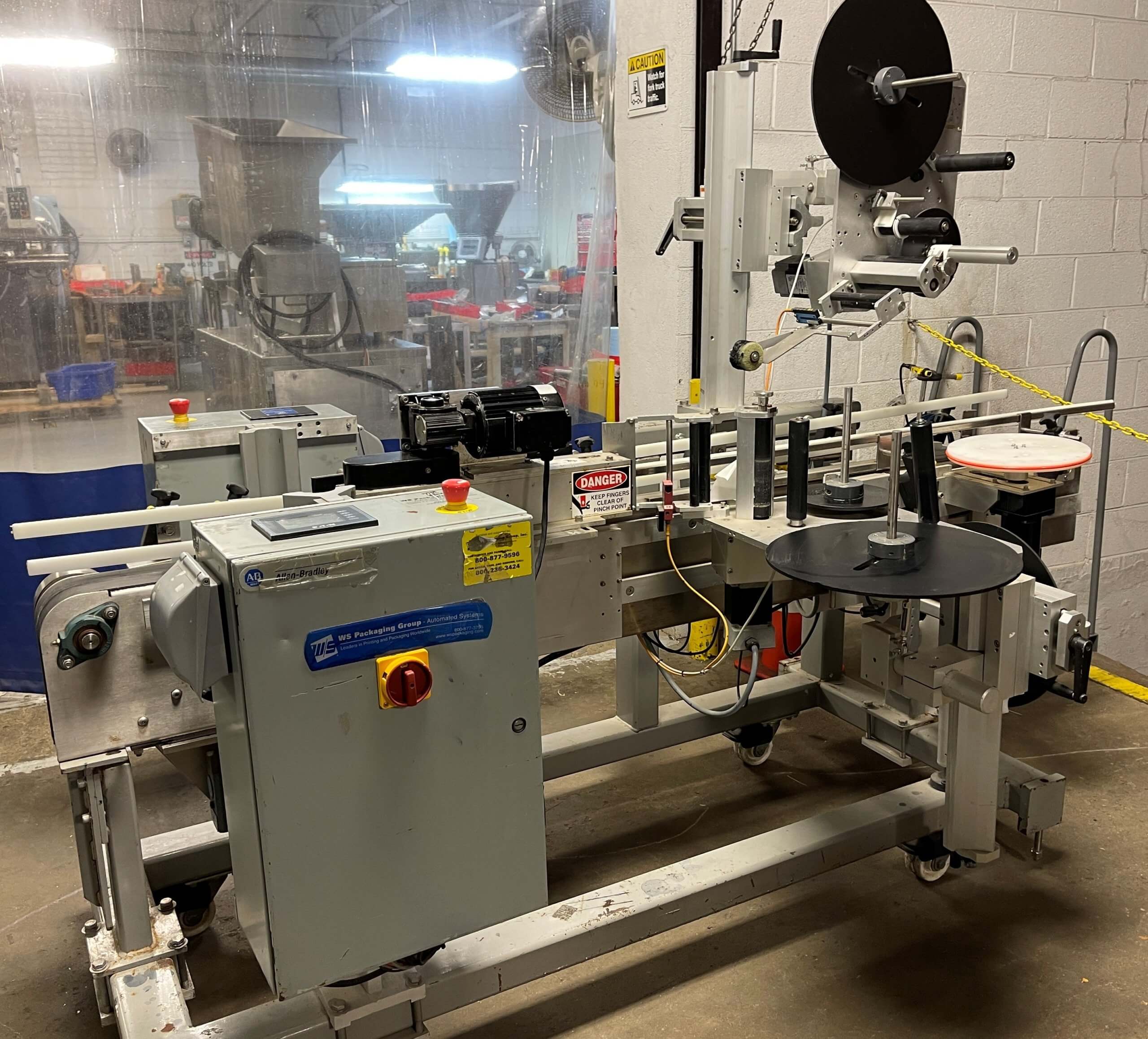 WS Packaging Group ASD Top/Side Wrap System. 6” wide Infeed & discharge conveyors, Eaton control panel, Web 6.5”, 6.75” application blade. Empty label winder, Adjustable height, Infeed conveyor drive 1/3 hp, 115/230V/1PH/60HZ. Penta DC variable speed drive. Frame-mounted on casters.