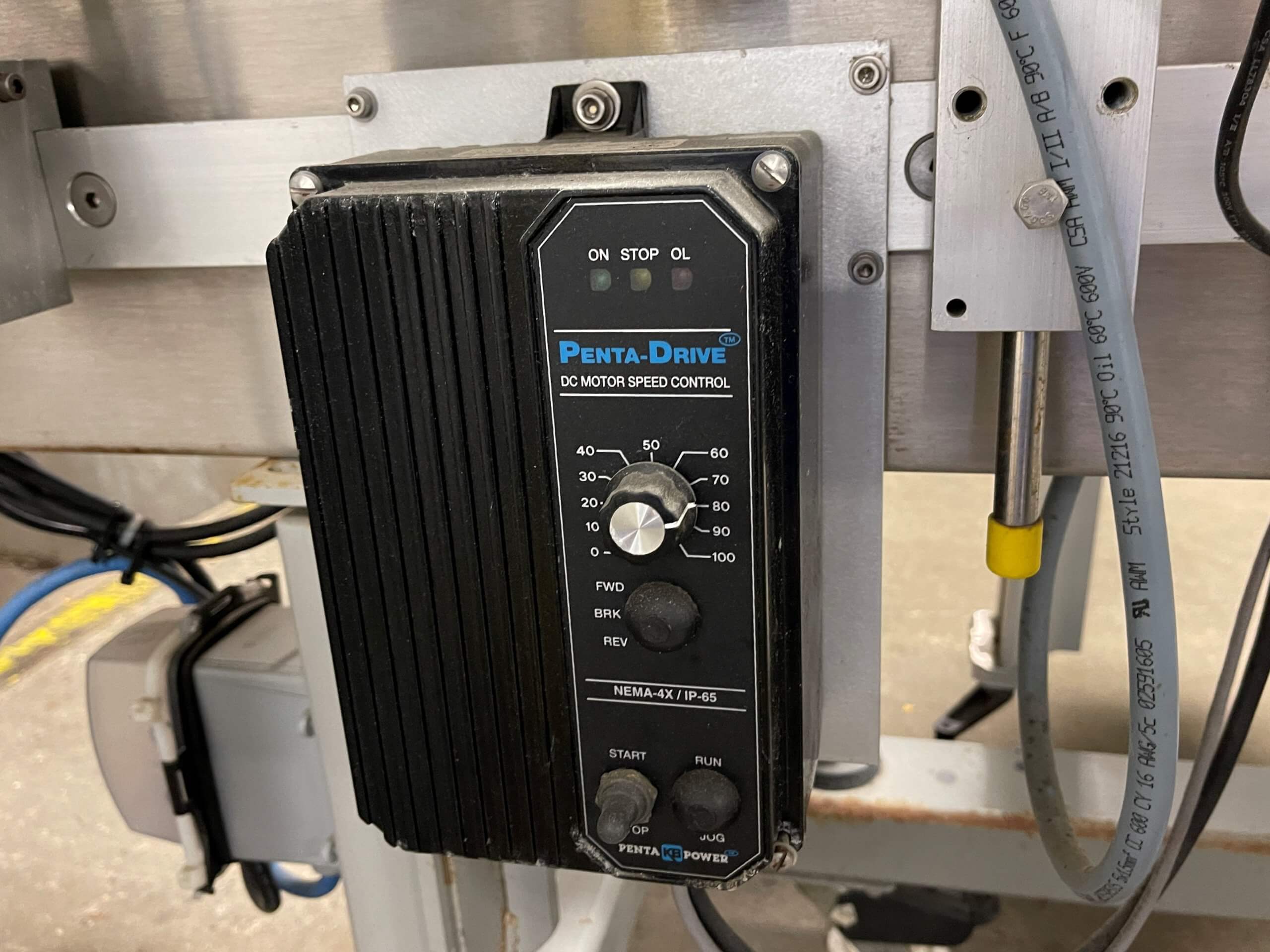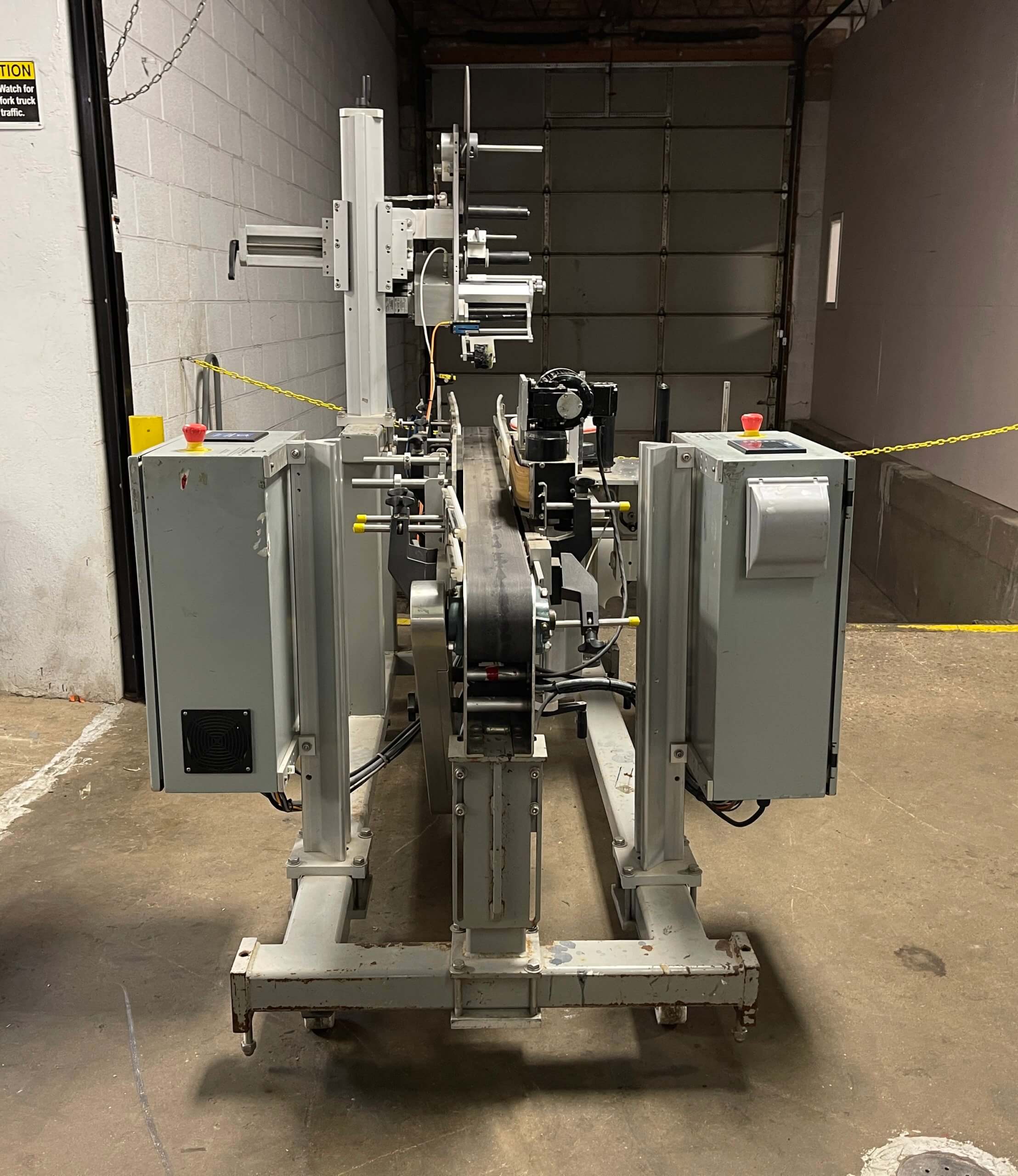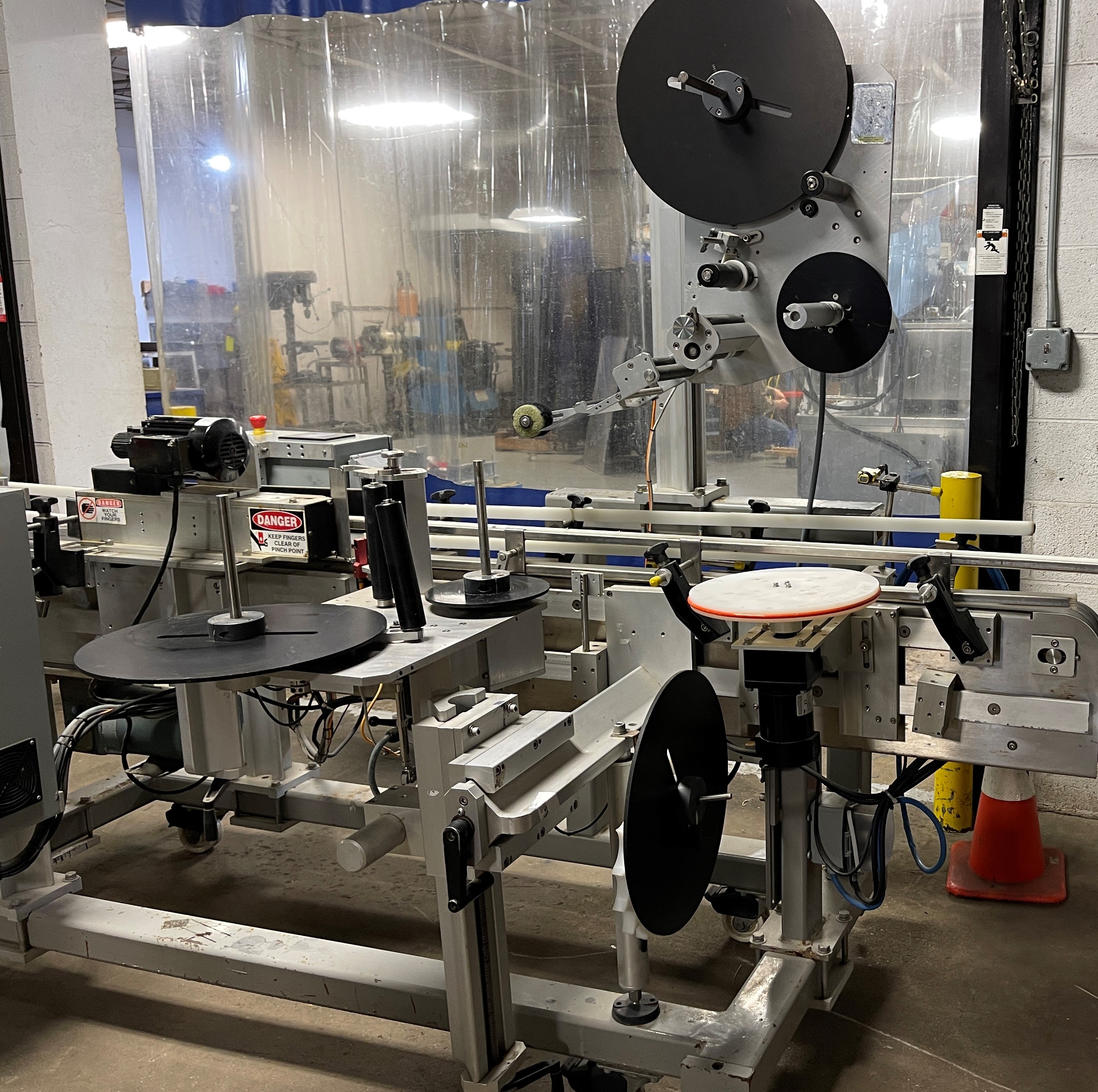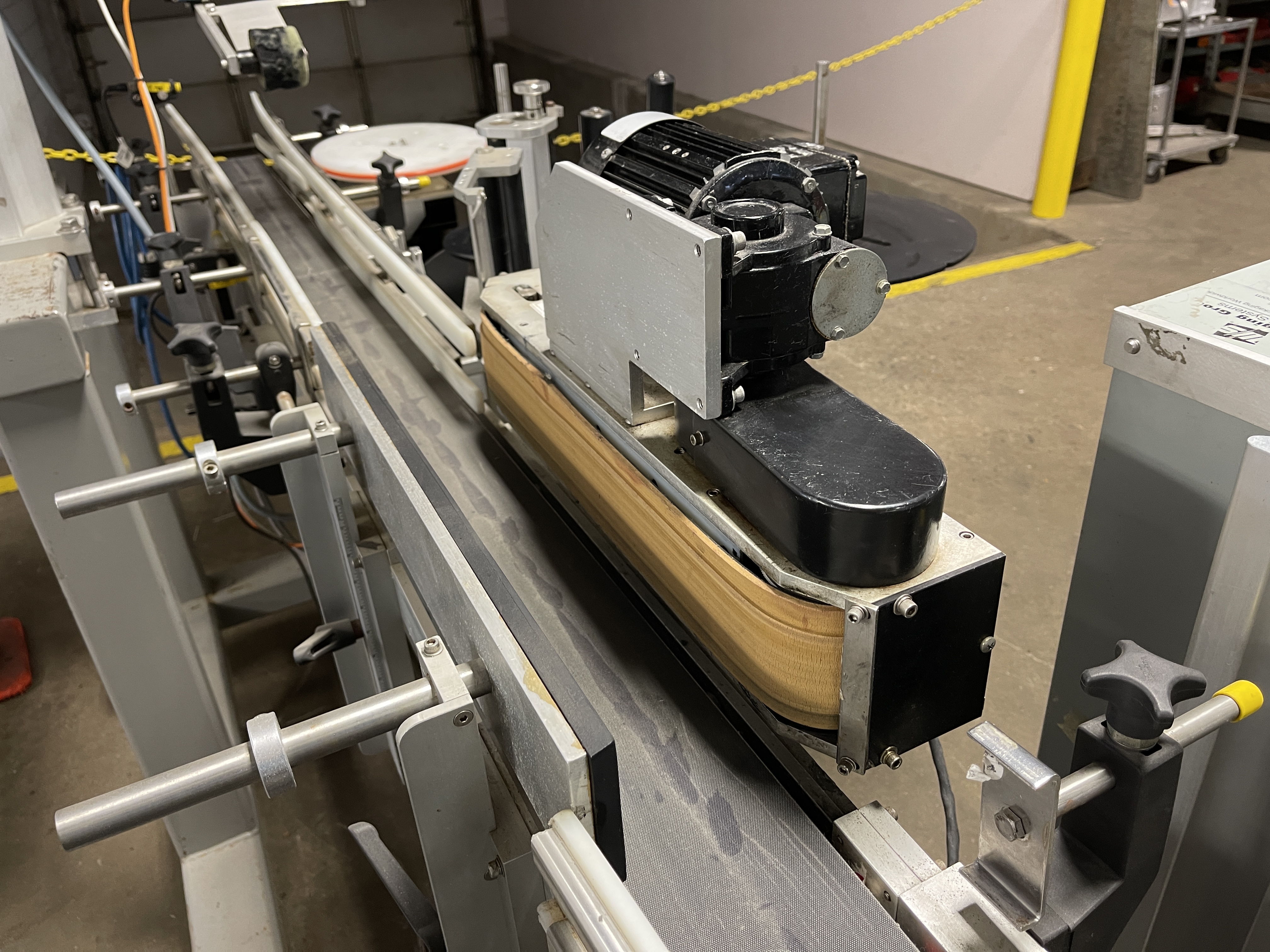 WS Packaging Group ASD Top/Side Wrap System. 6” wide Infeed & discharge conveyors, Eaton control panel, Web 6.5”, 6.75” application blade. Empty label winder, Adjustable height, Infeed conveyor drive 1/3 hp, 115/230V/1PH/60HZ. Penta DC variable speed drive. Frame-mounted on casters.