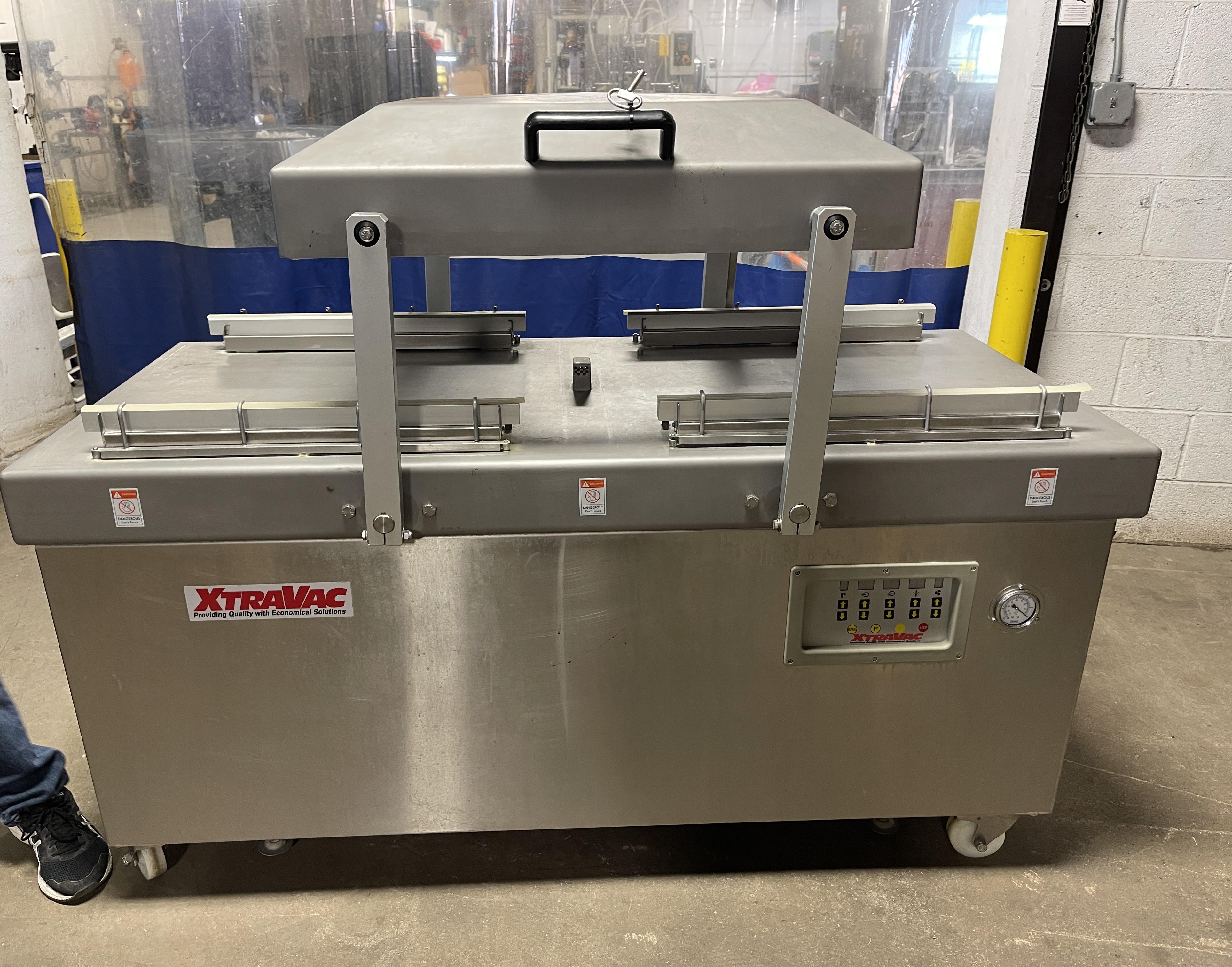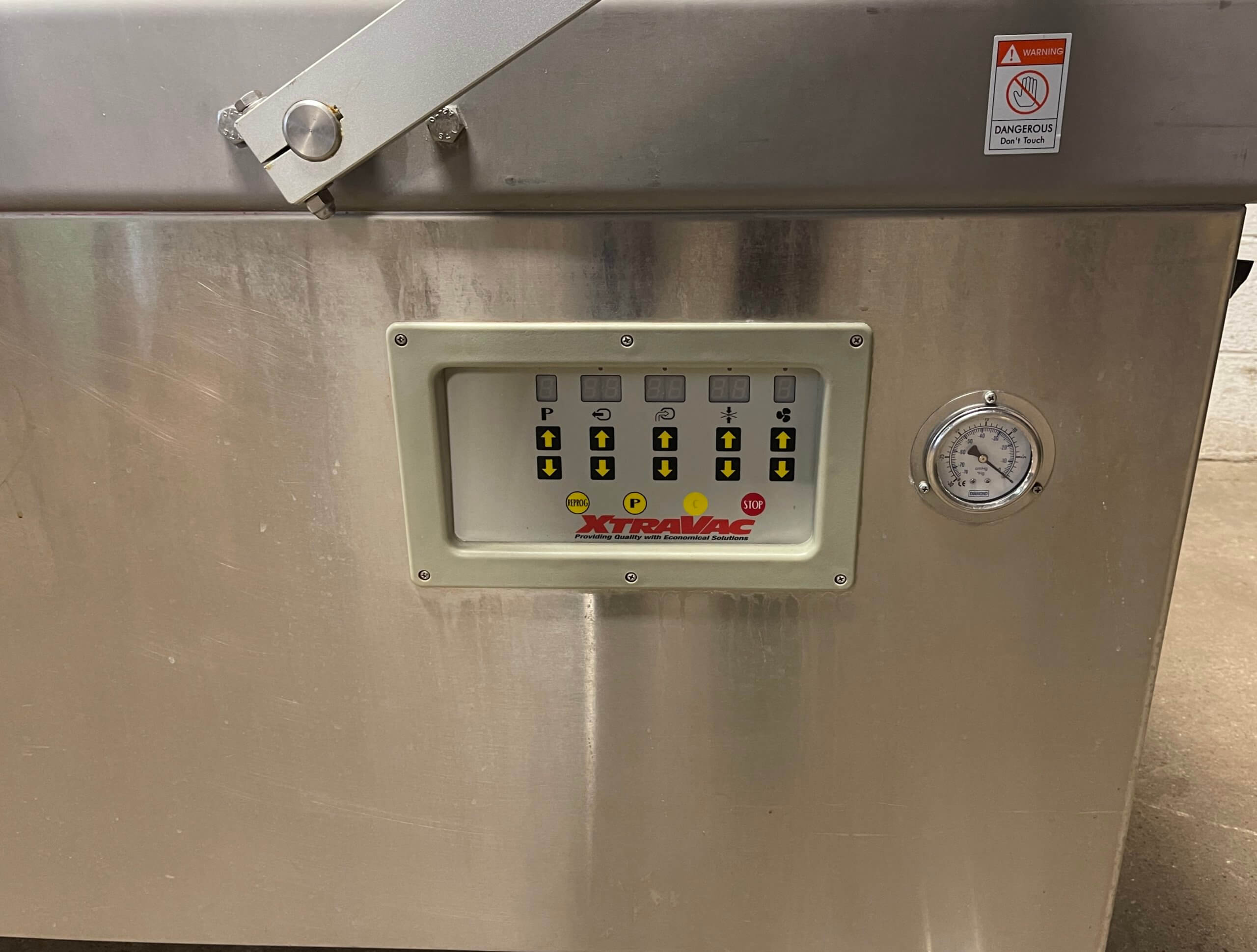 XTRAVAC 640 Double Chamber Machine. (2) 29″ X 27″ X 8″ Chambers, Built-in Busch 5 HP 100 CFM Vacuum Pump, 220V/3PH/60HZ, 20AMPS, (4) 25.5″ Seal bars, 22.5″ Between Seal bars, All stainless steel construction, Microprocessor controls. INCLUDES GAS FLUSH CAPABILITY.