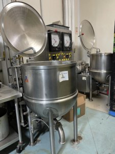 Cleveland Twin Cook Kettle System. Dual J.C. Pardow Kettles, 100 Gallon capacity, fu...