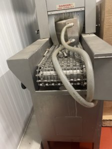 FOMACO FGM 20/40 Pickle Injector. 10″ wide plastic conveyor belt. Set up with ...