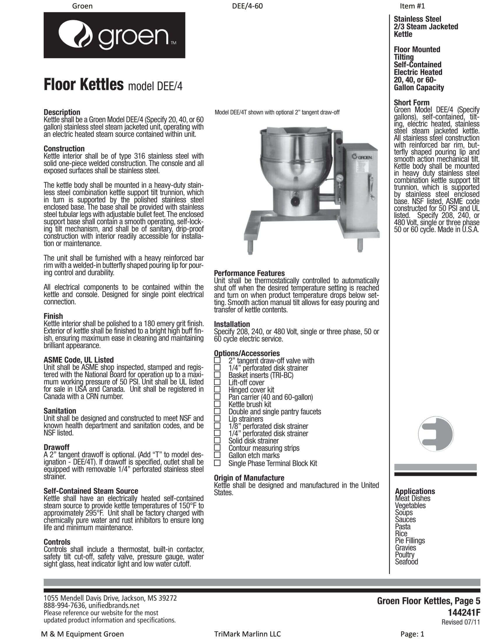M&M Equipment Corp > Resources List > Groen DEE/4 Floor Kettles Brochure