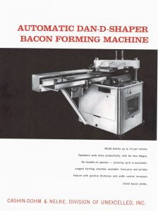 Cashin-Dohm And Nelke Dan-D Shaper Bacon Forming Machine. Molds bellies up to 10 per minute. Exclusive anti-wrinkle feature with positive thickness and width control increases sliced bacon yields.