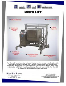 Daniels Food Equipment Mixer Lift. You can load the mixer at a comfortable height and raise it to dump into a higher cart. The mixer lift is all heavy duty stainless steel construction. It is powered by a reliable hydraulic system.