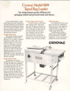 Cryovac 8189 Taped Bag Loader. Cryovac Model 8189 is a high-speed taped bag loader designed to increase productivity and minimize downtime for reloading and changeover. It is ideal for loading smoked and processed products in conjunction with Cryovac 8600 Series vacuumizing machines.