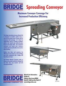 Bridge SCA Spreading Conveyor. The Bridge Spreading Conveyor Model SCA is designed to transfer product from a narrow belt evenly across a larger belt for maximum belt coverage. It is ideal for applications such as: loading meatballs, patties and ravioli onto batter/breader, freezer and cooker belts.