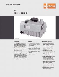 Busch R 5 KB 0010-0016 D Rotary Vane Vacuum Pumps. Very compact, simple design for easy installation and low maintenance. Air-cooled, requiring no water. Direct drive, eliminating belts and gears to loosen or wear.