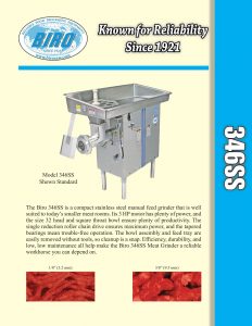 Biro 346SS Grinder. The Biro 346SS is a compact stainless steel manual feed grinder that is well suited to today’s smaller meat rooms. Its 3 HP motor has plenty of power, and the size 32 head and square throat bowl ensure plenty of productivity.